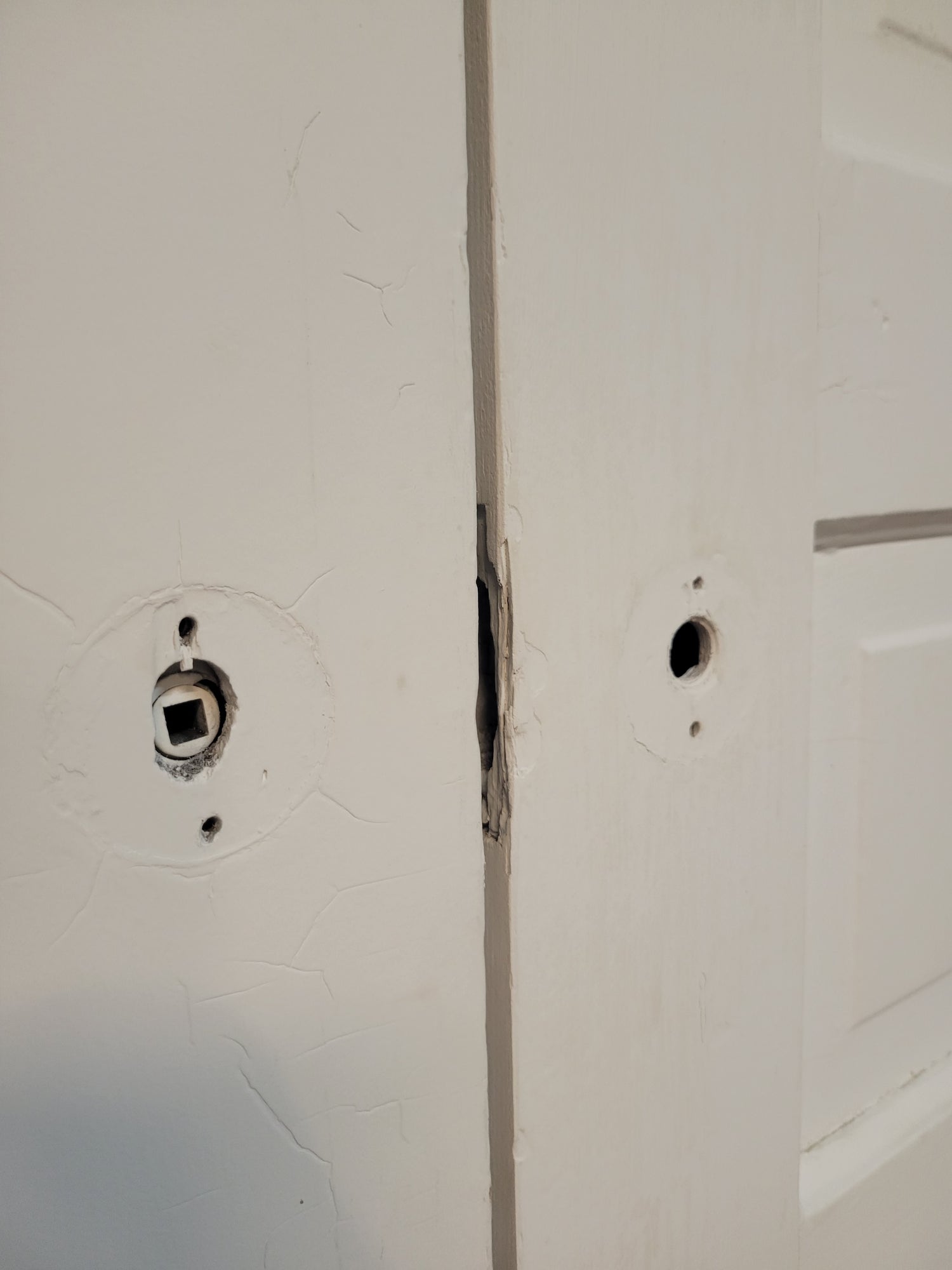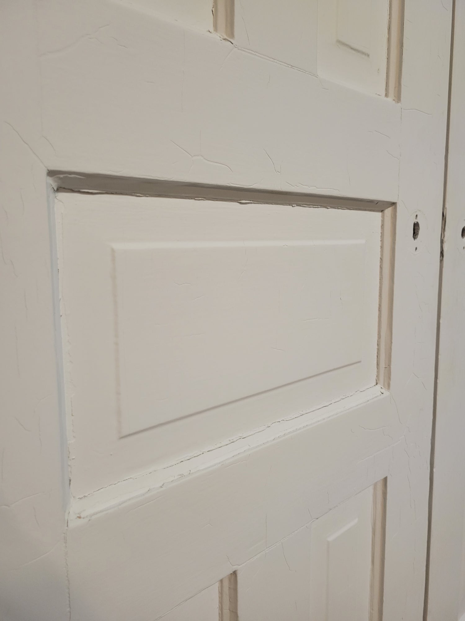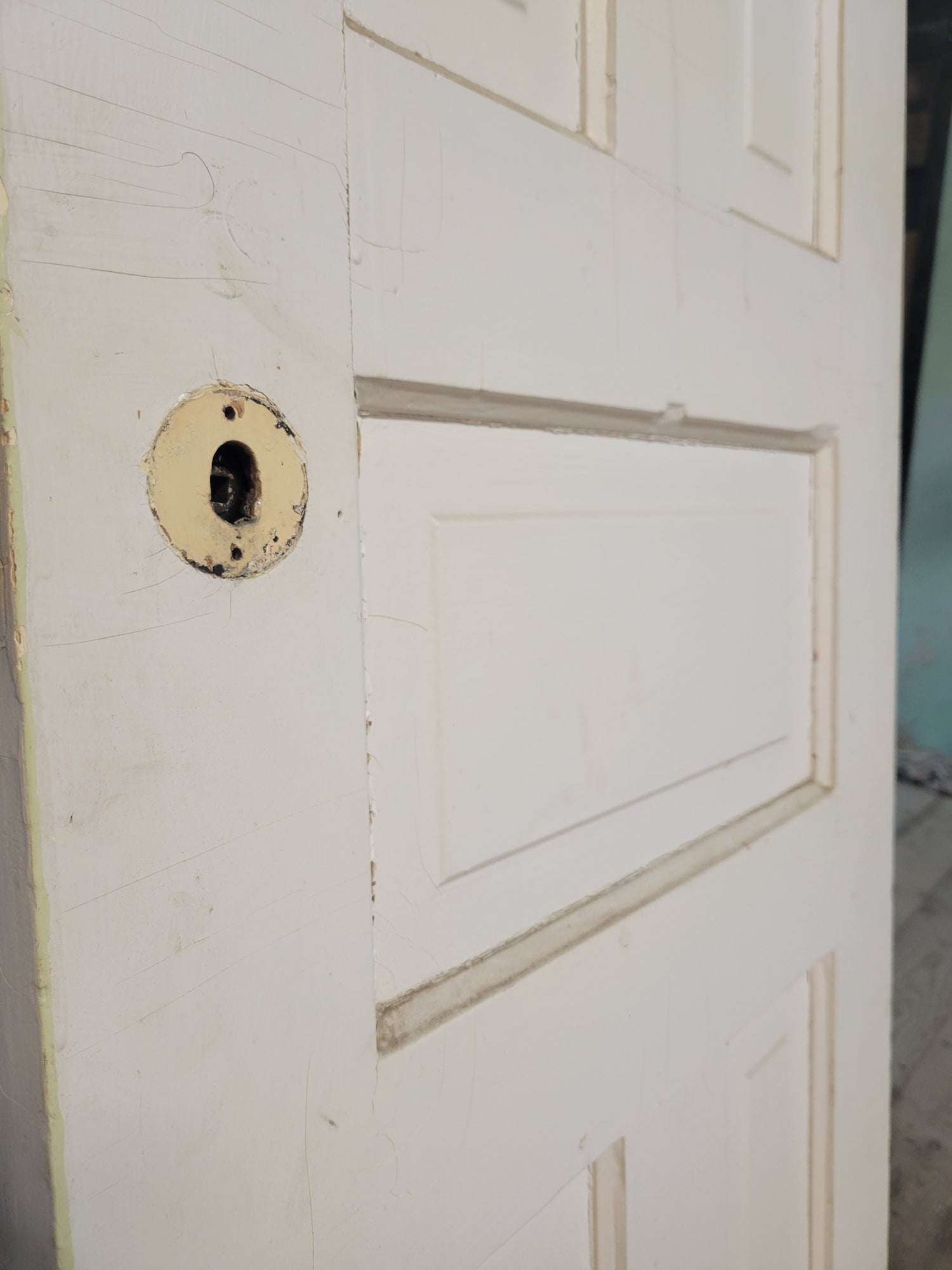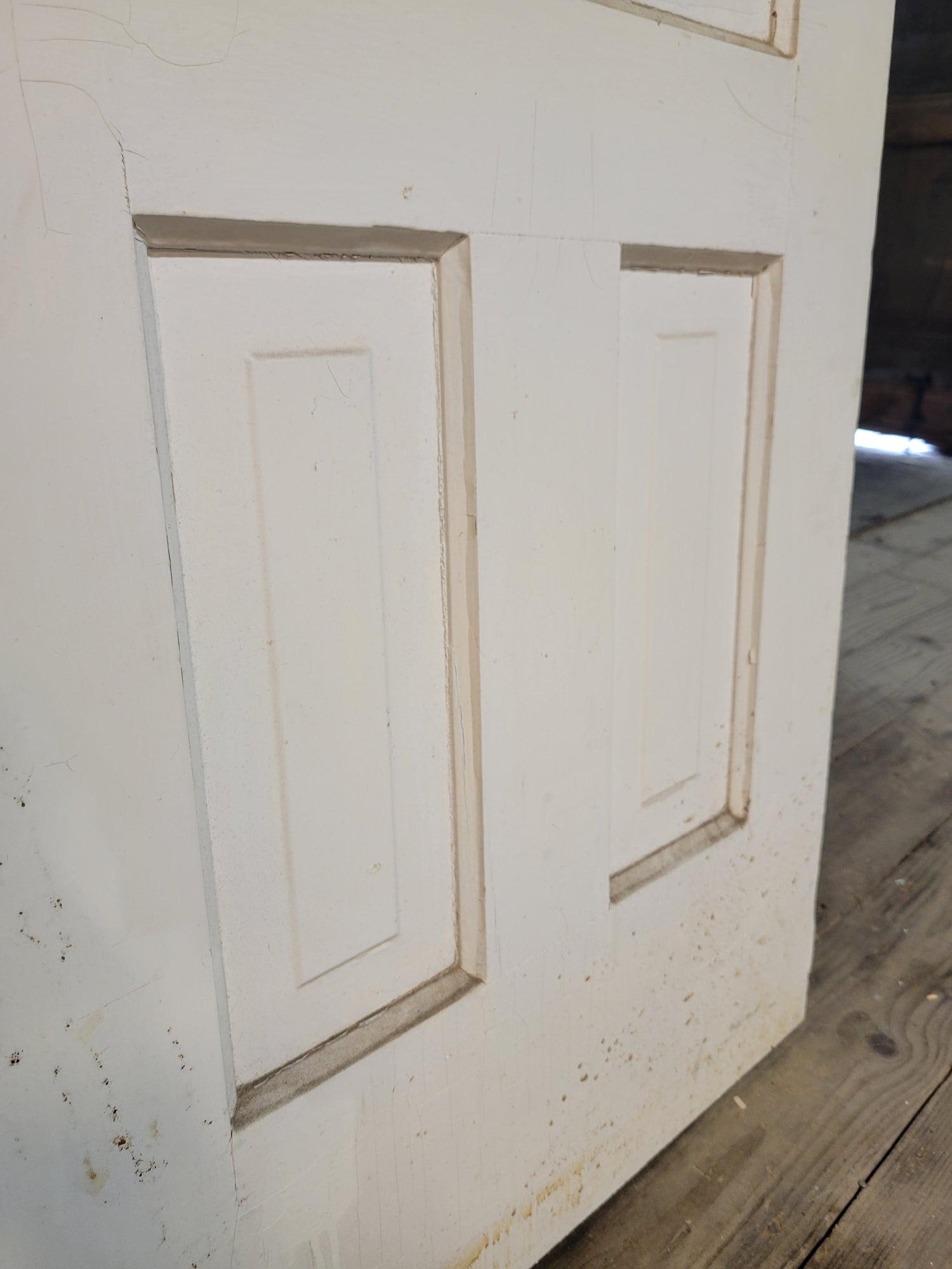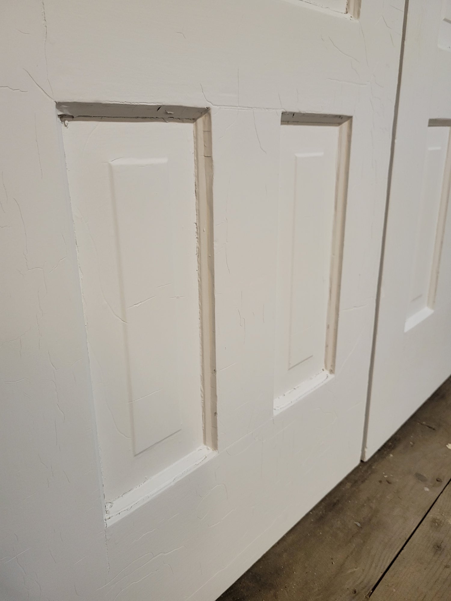A gorgeous set of matched doors with a classic five panel, two over two, design with the a white painted finish. These beautiful doors have been paired together based on size for a nicely matched set of double doors. There are some imperfections to the surface of the wood from years of use as shown (nicks in the finish or wood). The paint is distressed as pictured and has areas of imperfections. Please see all of our pictures for details on this set.