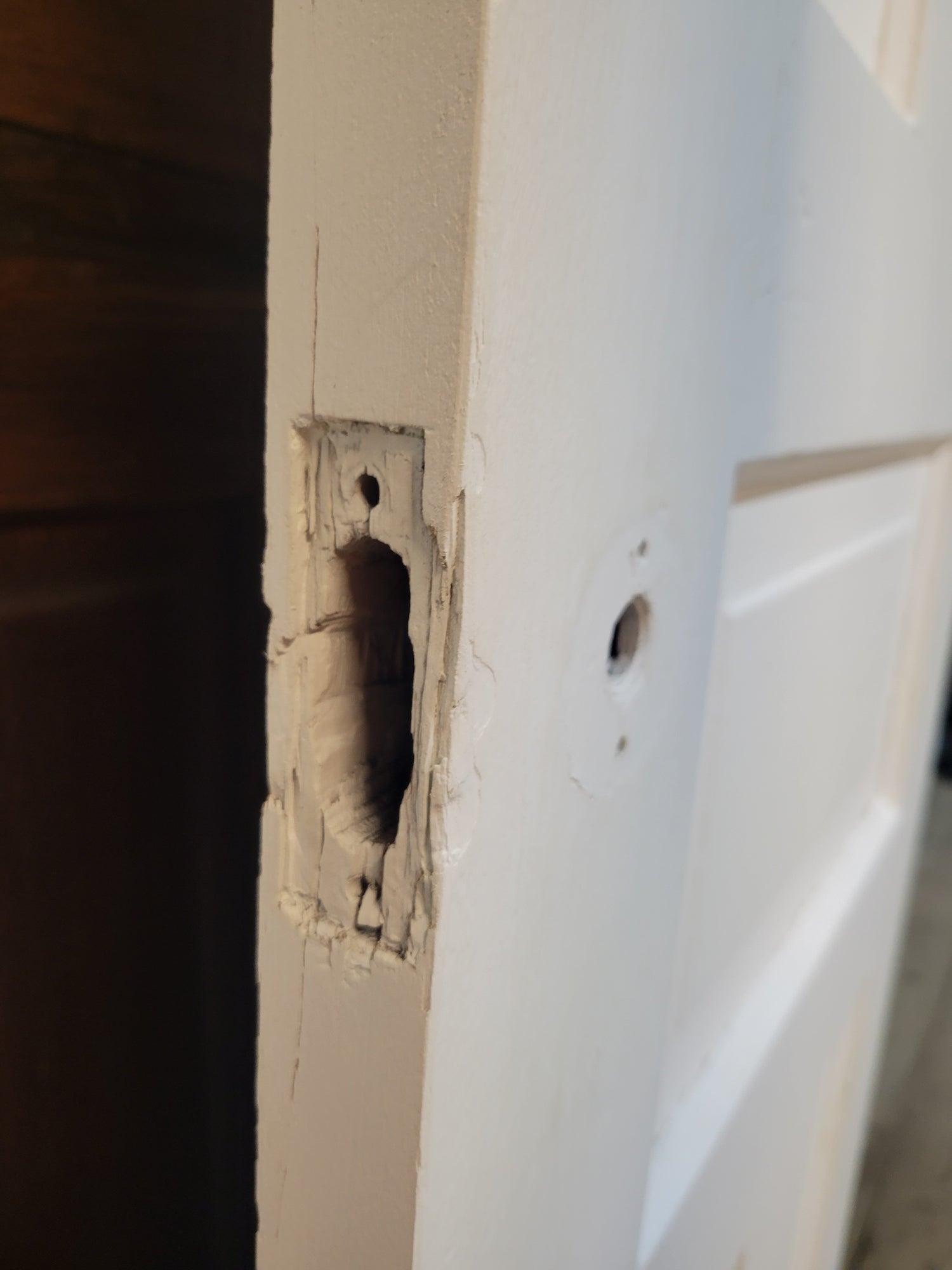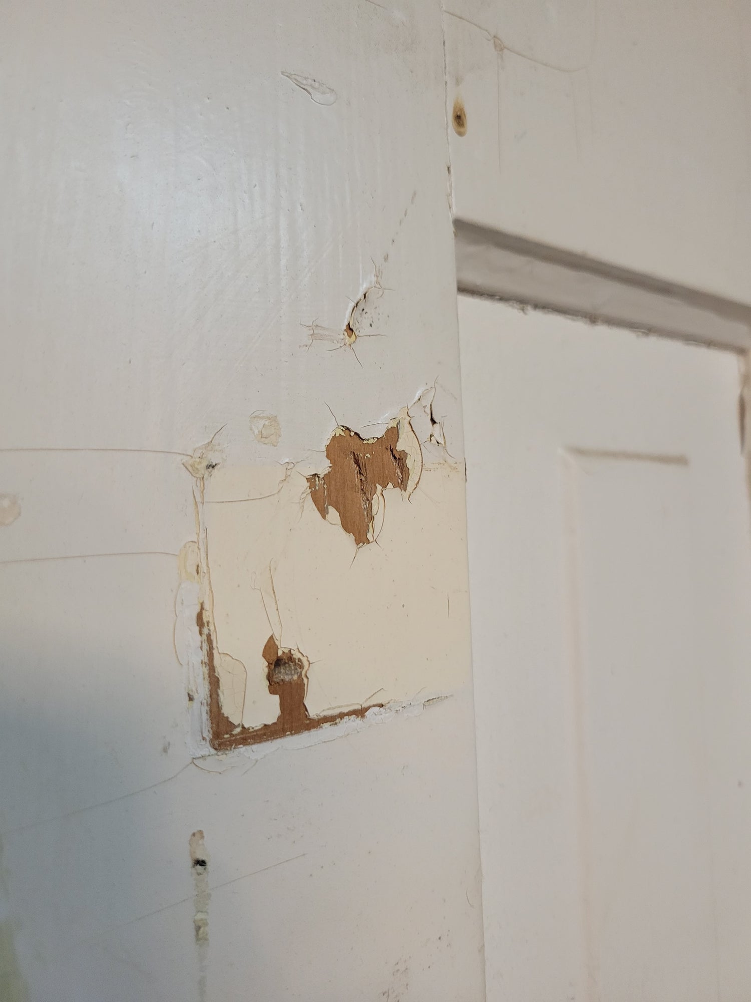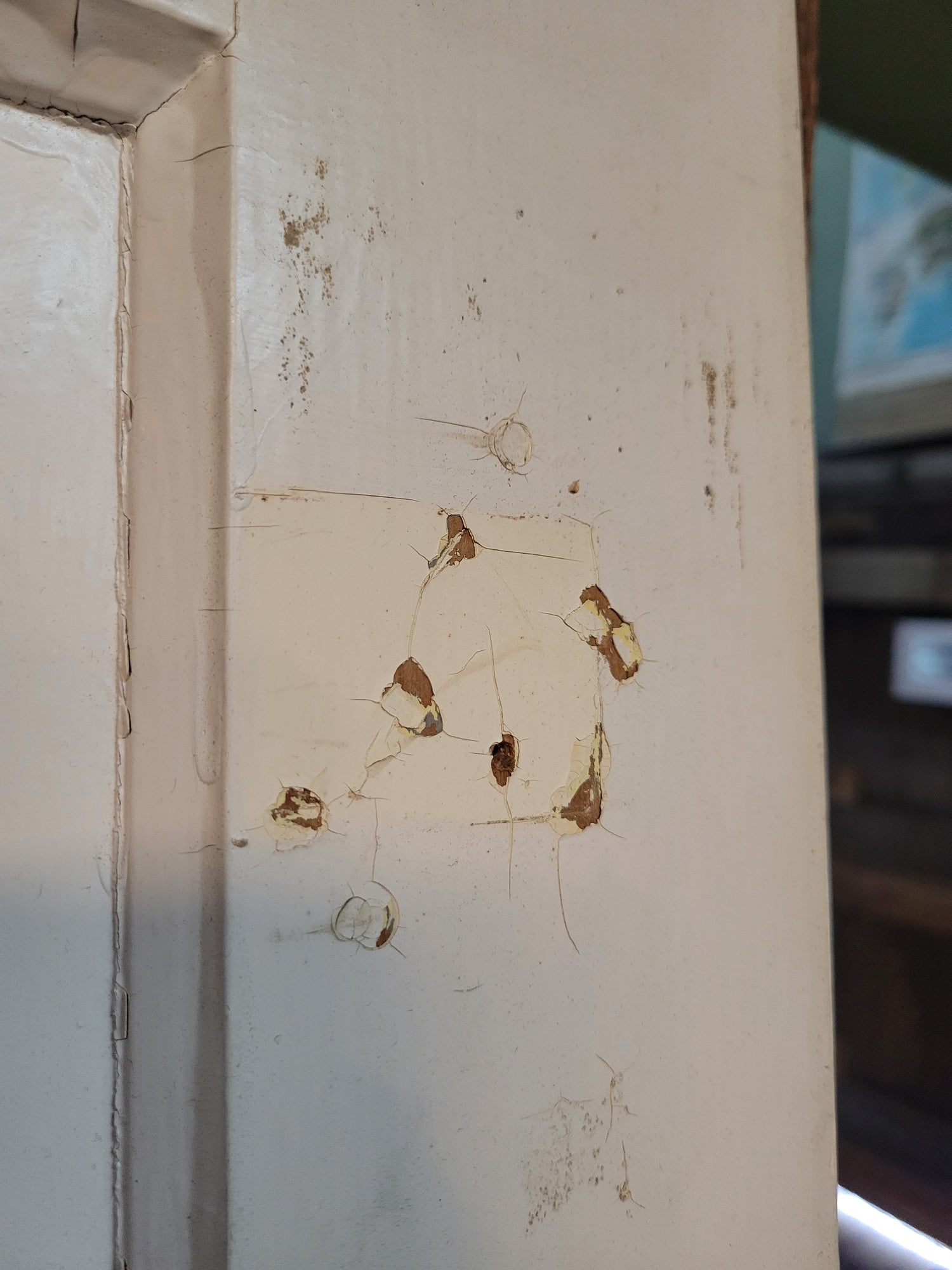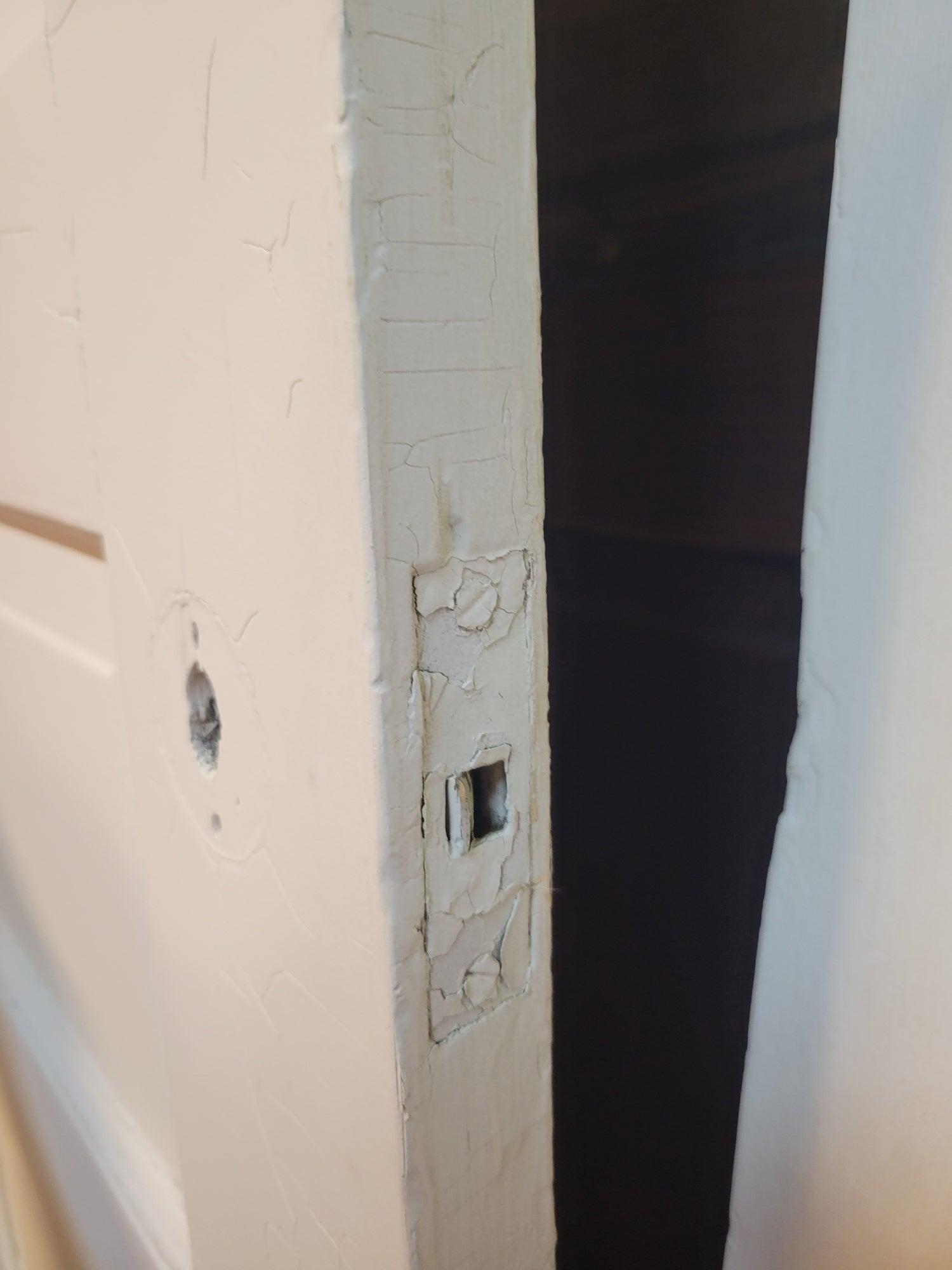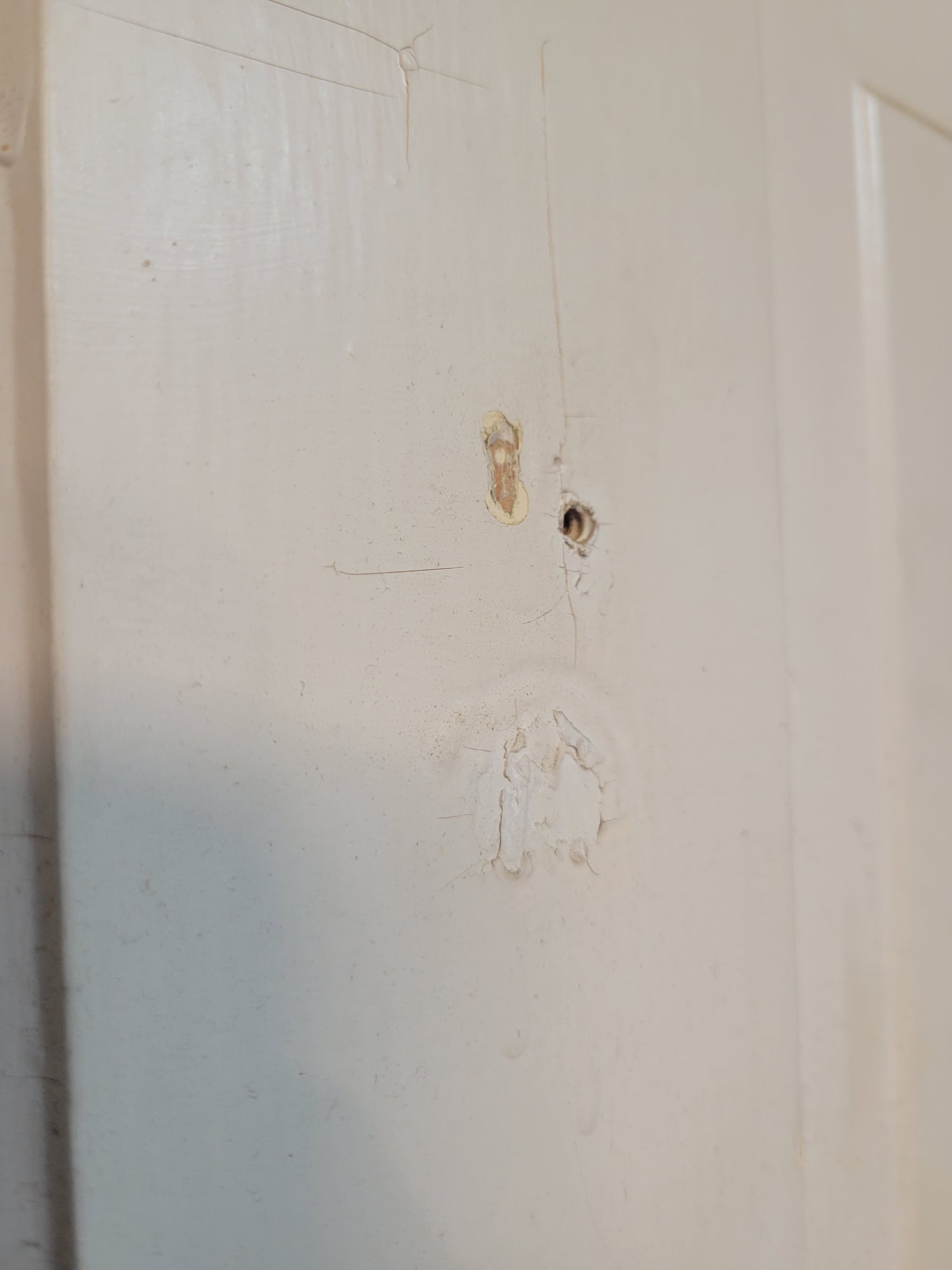 A gorgeous set of matched doors with a classic five panel, two over two, design with the a white painted finish. These beautiful doors have been paired together based on size for a nicely matched set of double doors. There are some imperfections to the surface of the wood from years of use as shown (nicks in the finish or wood). The paint is distressed as pictured and has areas of imperfections. Please see all of our pictures for details on this set.