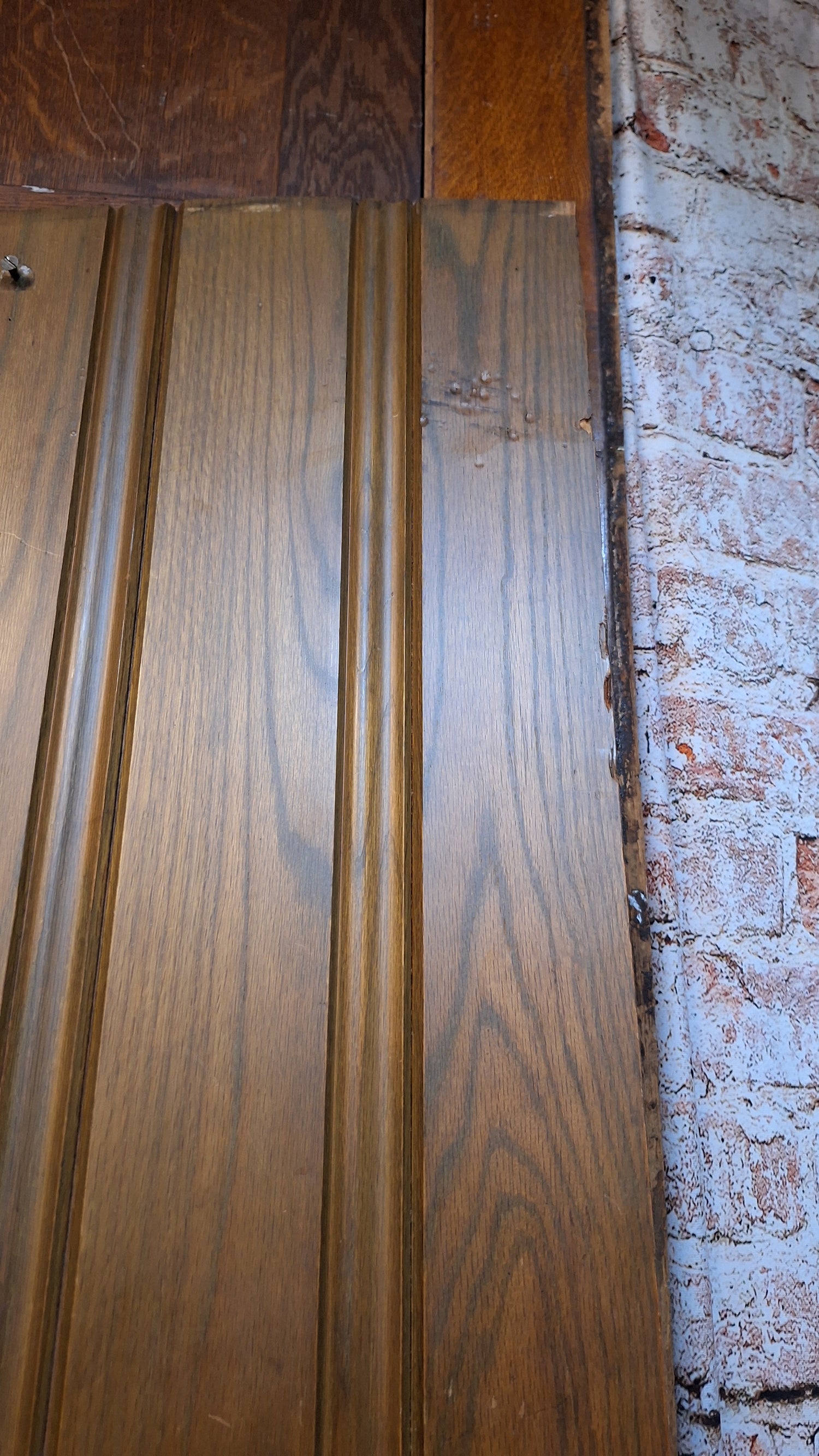 A beautiful set of heavy wooden church doors with an arched door. The doors have a raised panel design on one with with a paneled design on the opposite. The set is in very good condition with minor signs of wear such as nicks in the wood around the edges or dark spots in the finish as pictured. The set comes with hinges, mortise locks, and mortised slide bolts in the edge of one door. Please see all of our pictures for details.