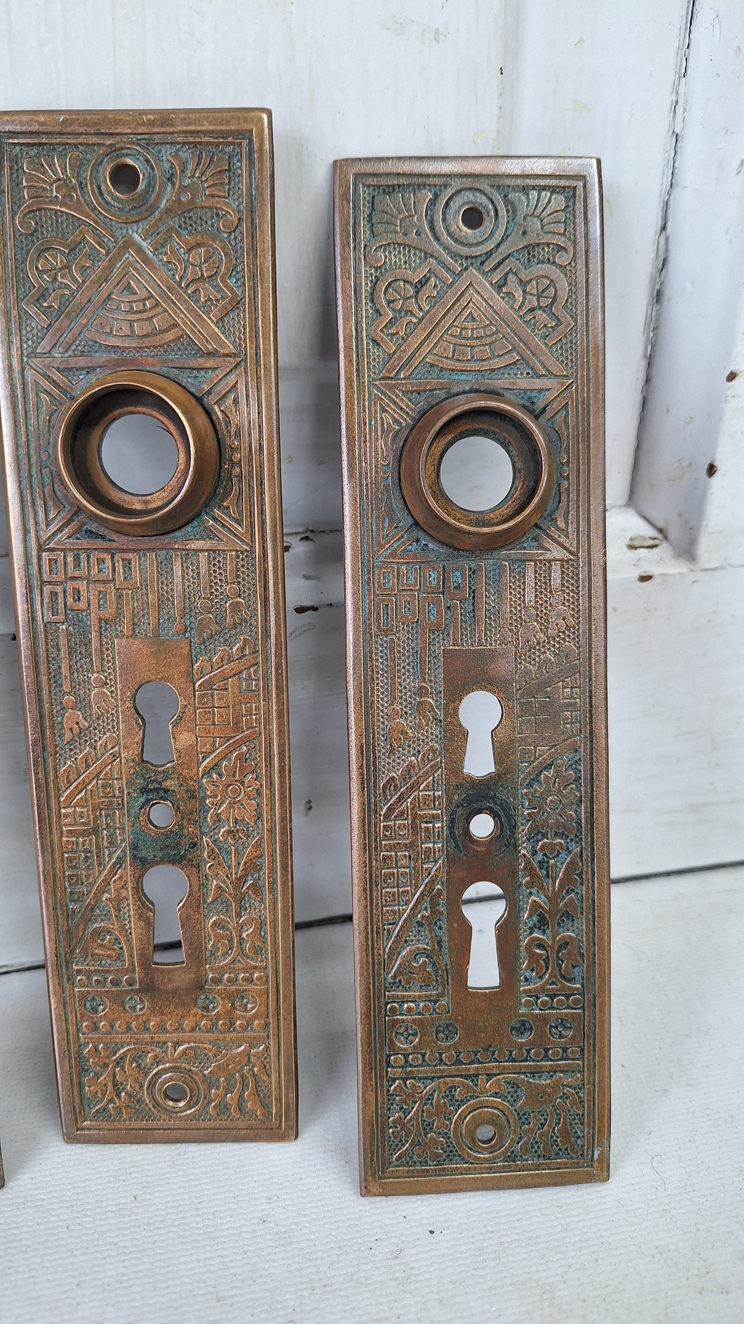 Eastlake Bronze Plate with Double Keyhole, Ceylon Pattern Entry Door Knob Backplate