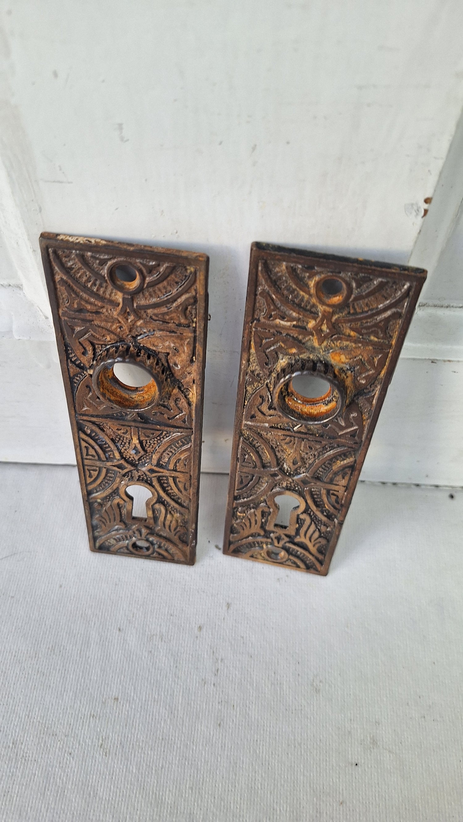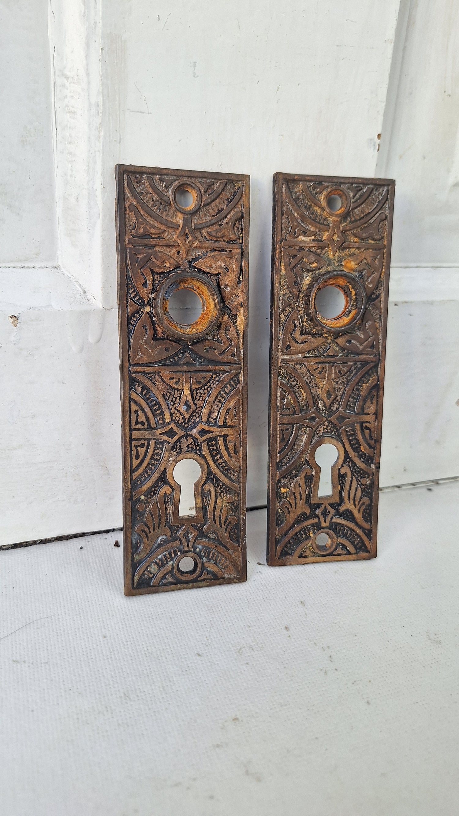 A pair of antique Eastlake style cast iron backplates with an intricate design across the front. These have been lightly cleaned and are ready to use. We have two pairs available. Please see all of our pictures for details and dimensions. This pair ships free within the US. www.peoriasalvage.com