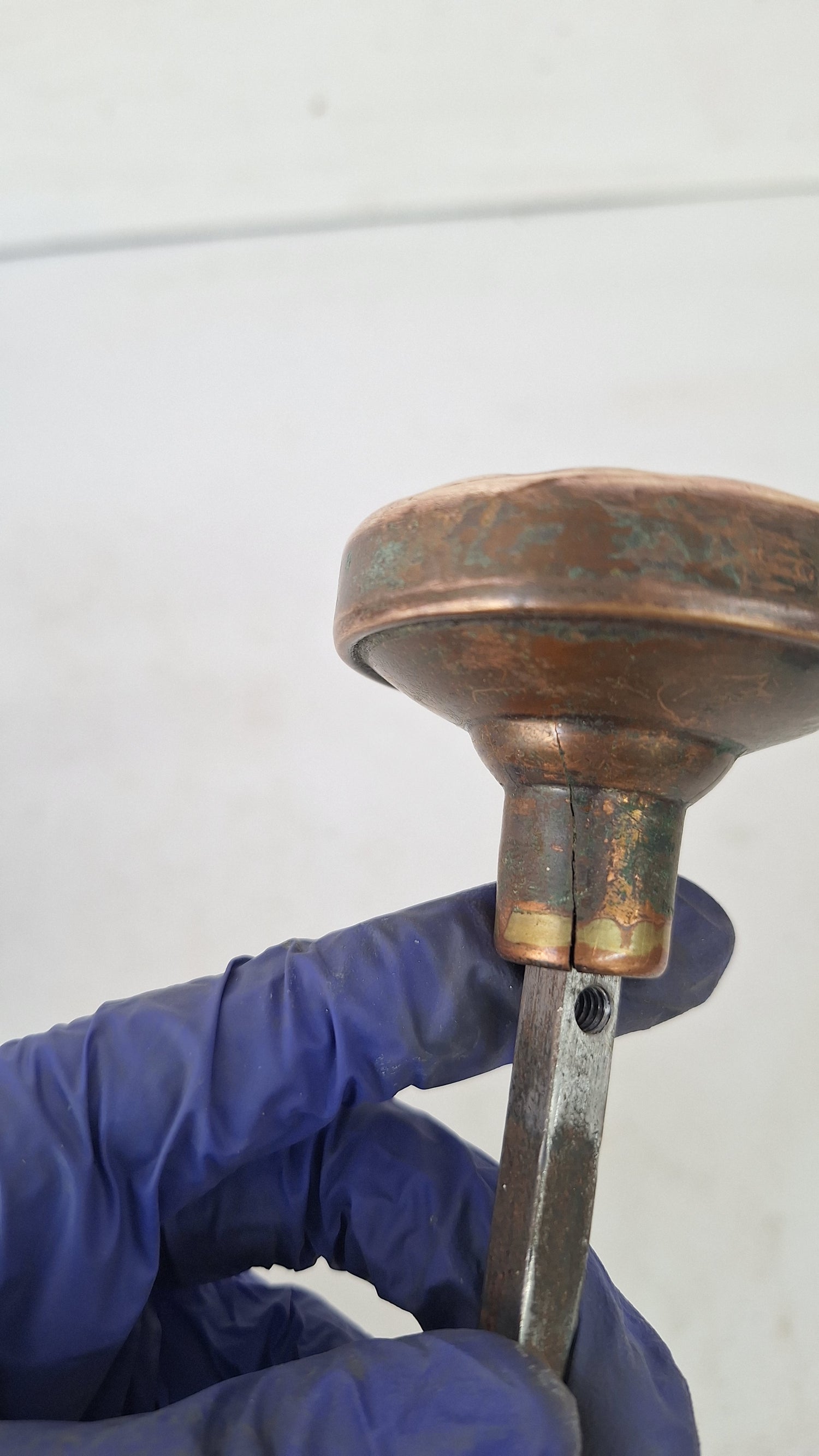 A gorgeous set of Eulalia pattern doorknobs in wrought bronze. These have a beautiful patina that sets off the floral design in the center. They would make an excellent set for a special door in your home. We have several sets available; patinas will from set to set. Most are in very good condition; one set has a small hole in one shank and a fine crack in the metal of the shank on the other knob (these are available for a lower price as shown on the drop down menu). Each set includes two doorknobs, a standard size spindle and set screws. This set ships free within the US. www.peoriasalvage.com