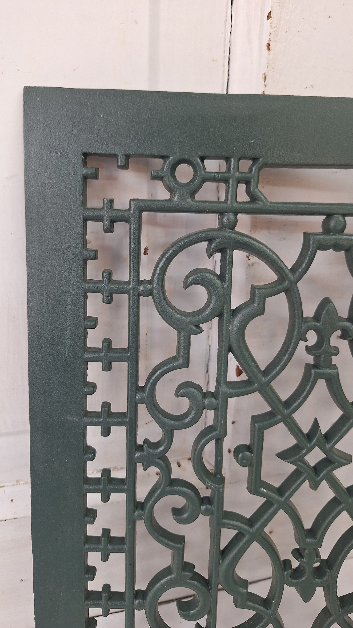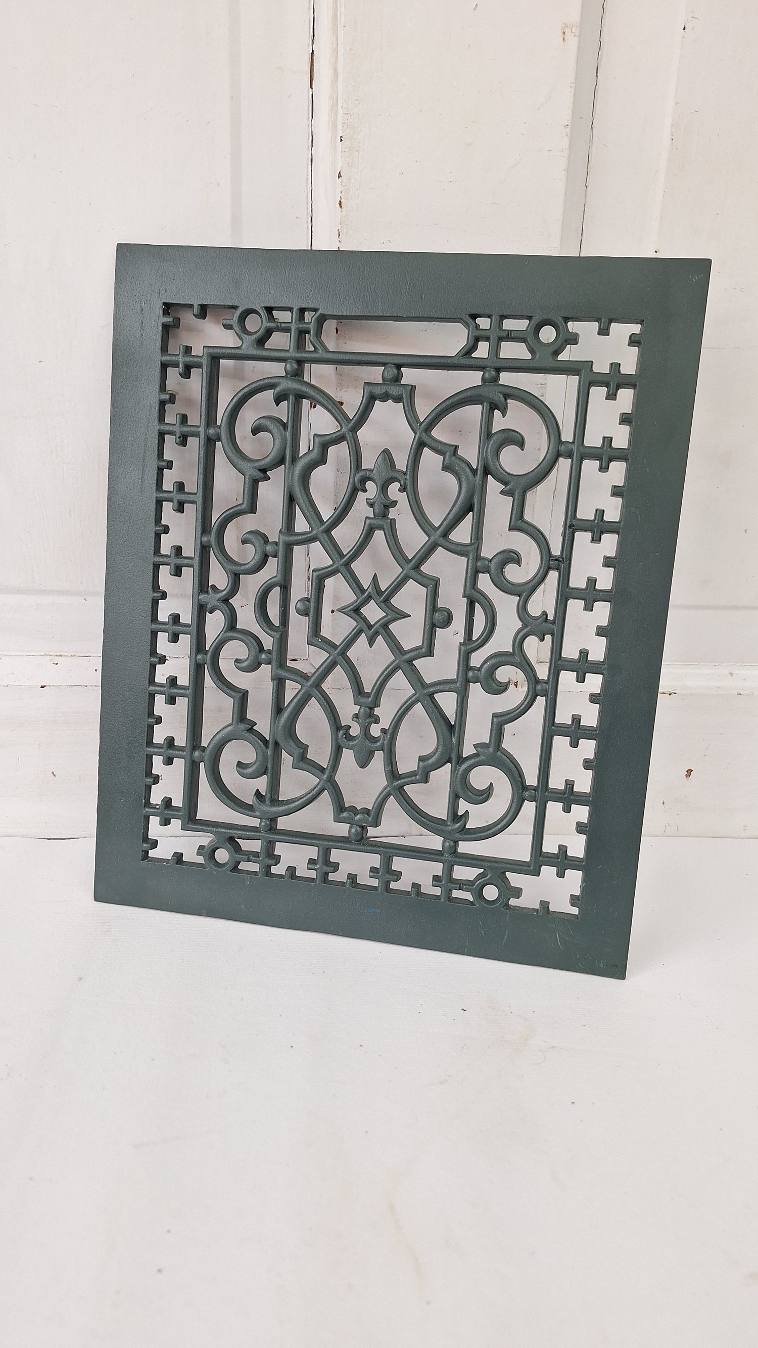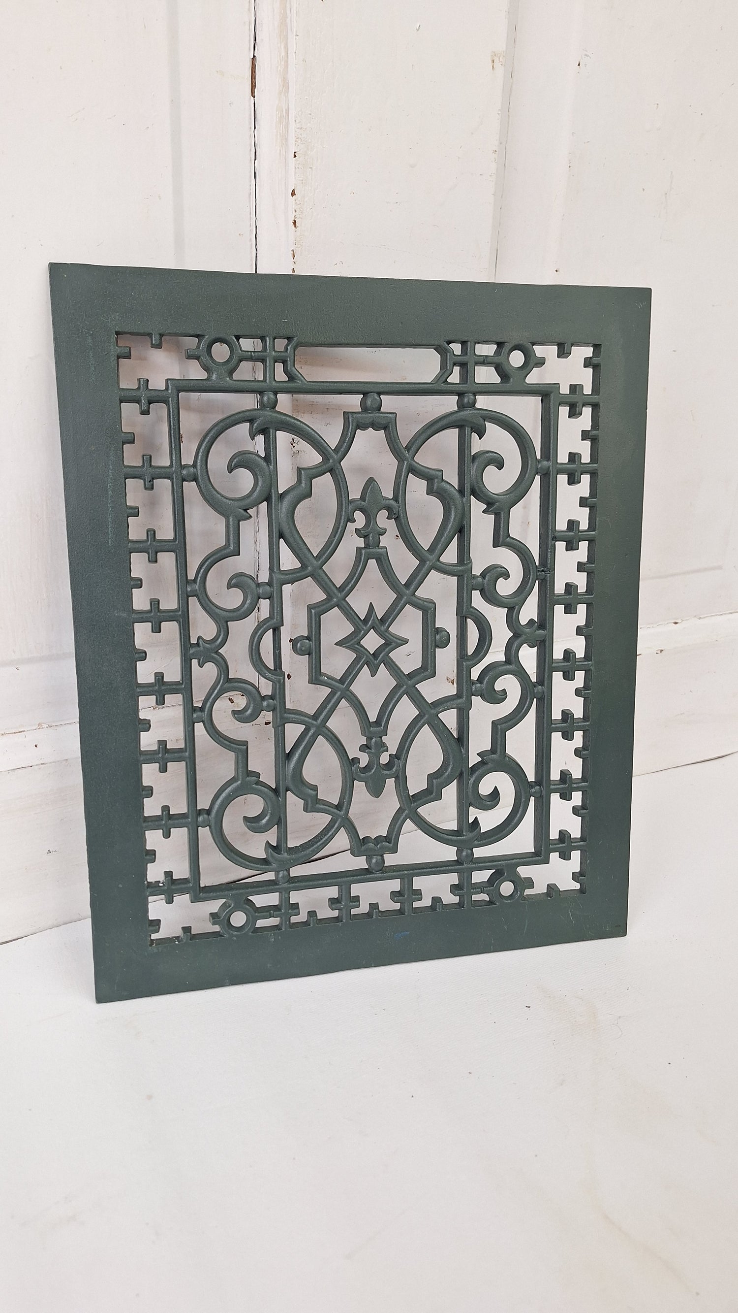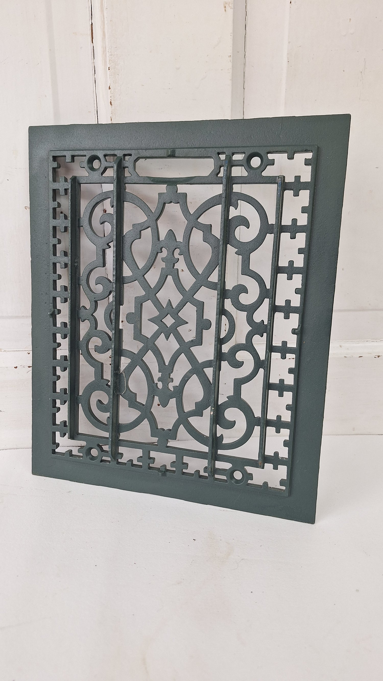 A beautiful antique vent cover, suitable for wall or floor use. This piece has been repainted in a matte gray-green and is in excellent condition.