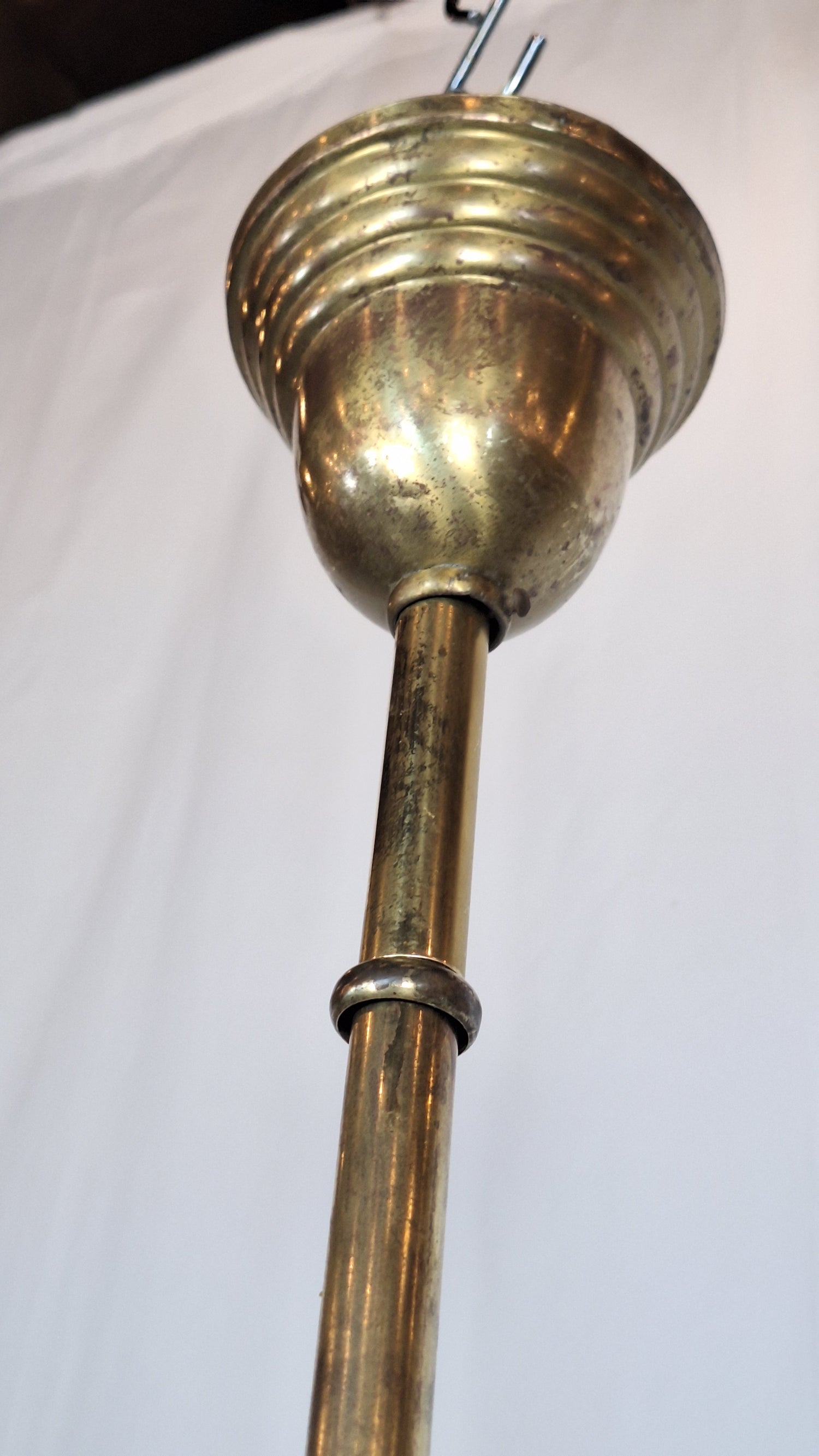 This antique chandelier measures 36" tall overall by 29 1/2" wide and the canopy is 4 1/2" wide. The metal body of the chandelier does have some small dents in areas as shown in the photos and areas of darker patina as well as splits in a few decorative brass pieces that do not affect the stability or functioning of the chandelier. Please see all of our pictures for details. This item ships free within the continental US. No PO boxes please.