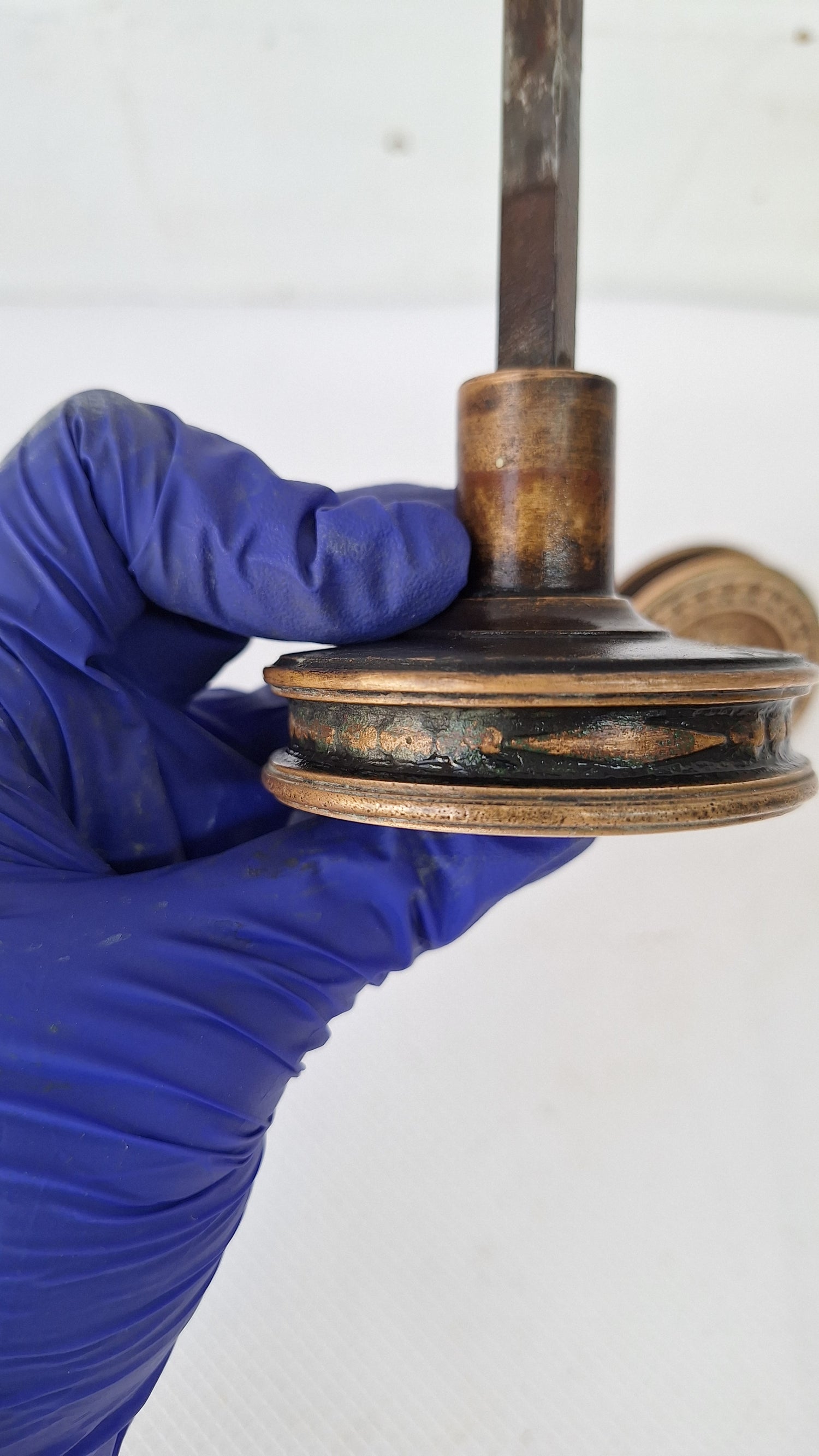 An incredible 1800s doorknob set from a Victorian mansion in Peoria, Illinois. This knob is a pattern called Gothic made by Corbin in highly detailed cast brass. The pattern is stunning and will be sure to catch your guests' eyes as they enter your home. There is a larger entry size doorknob (about 2 1/2" wide) and a passage size (2 1/4" wide).
