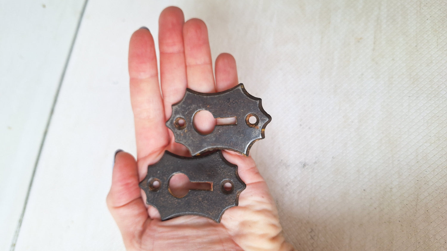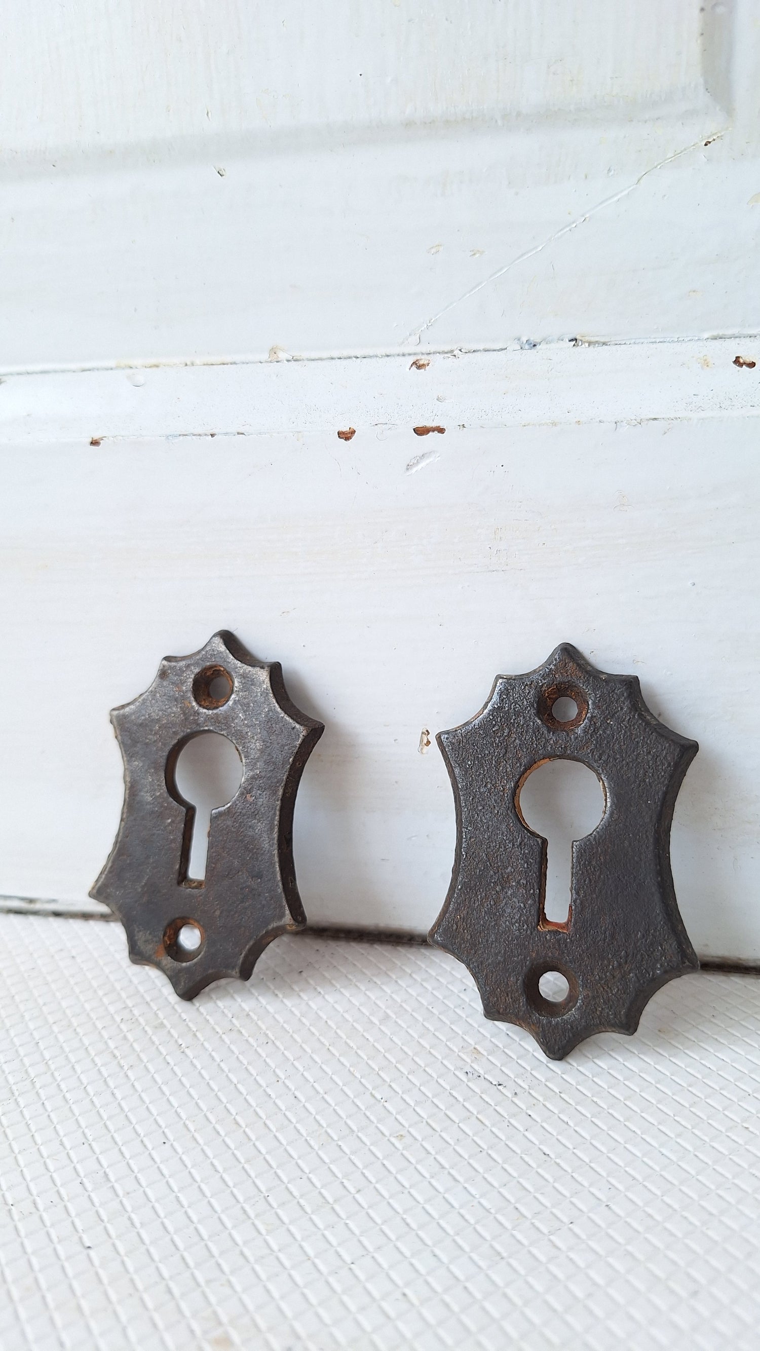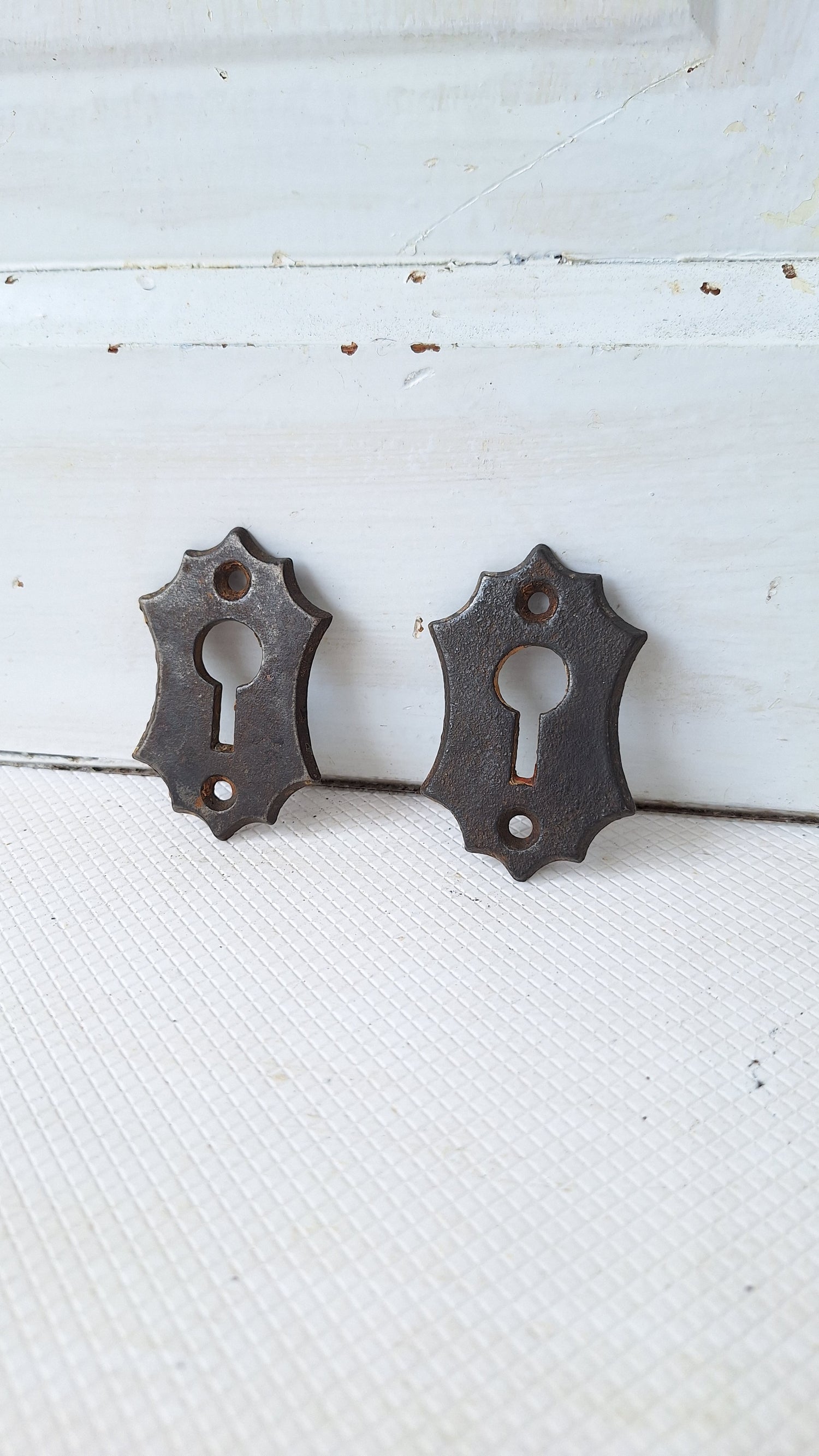 A pair of cast iron antique keyhole escutcheons. These feature simple detailing around the outside edge and are the perfect way to finish off an antique door in your home, but are also popular to use as jewelry pieces. Please see all of our pictures for details. These ship free within the US.