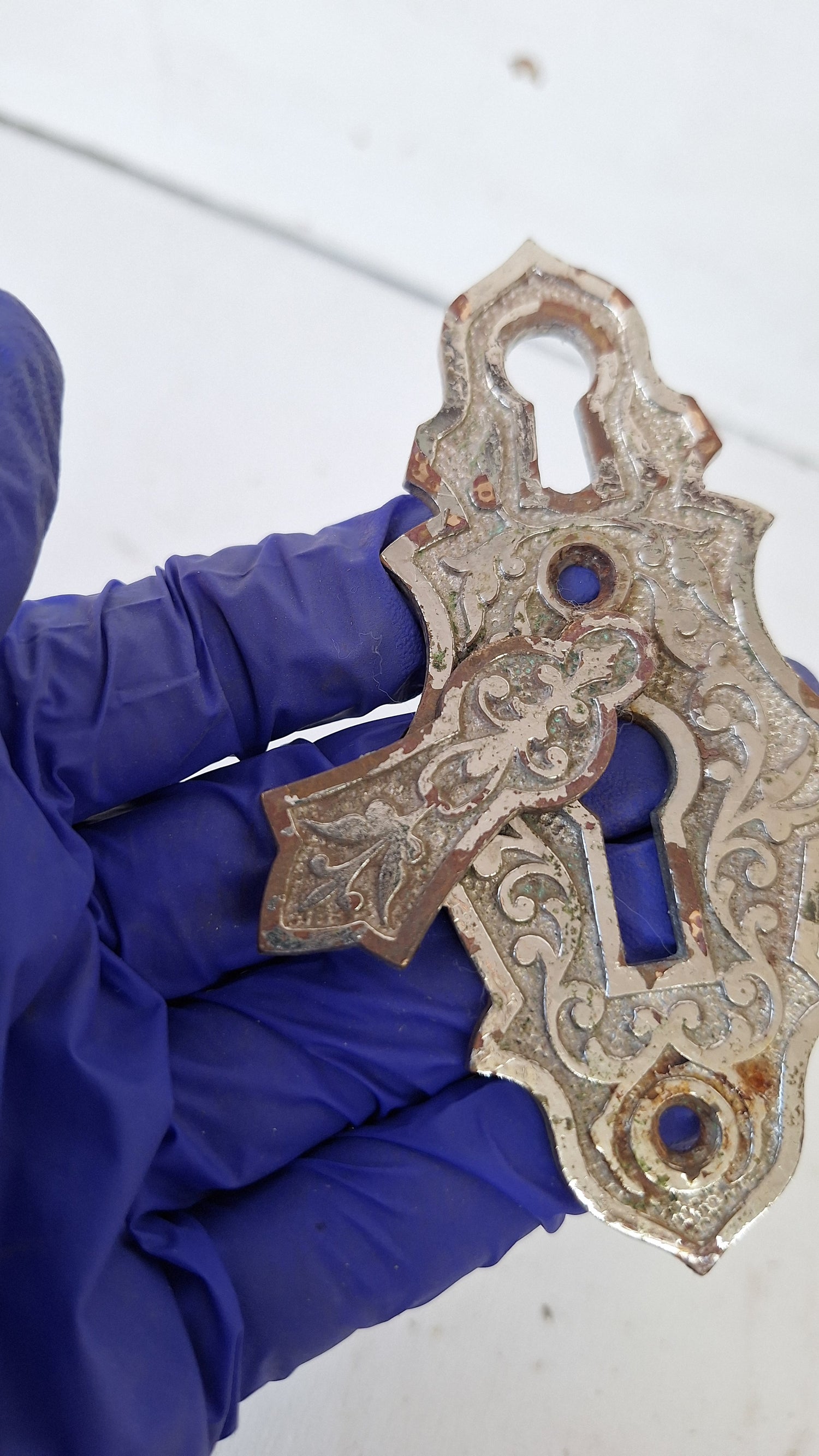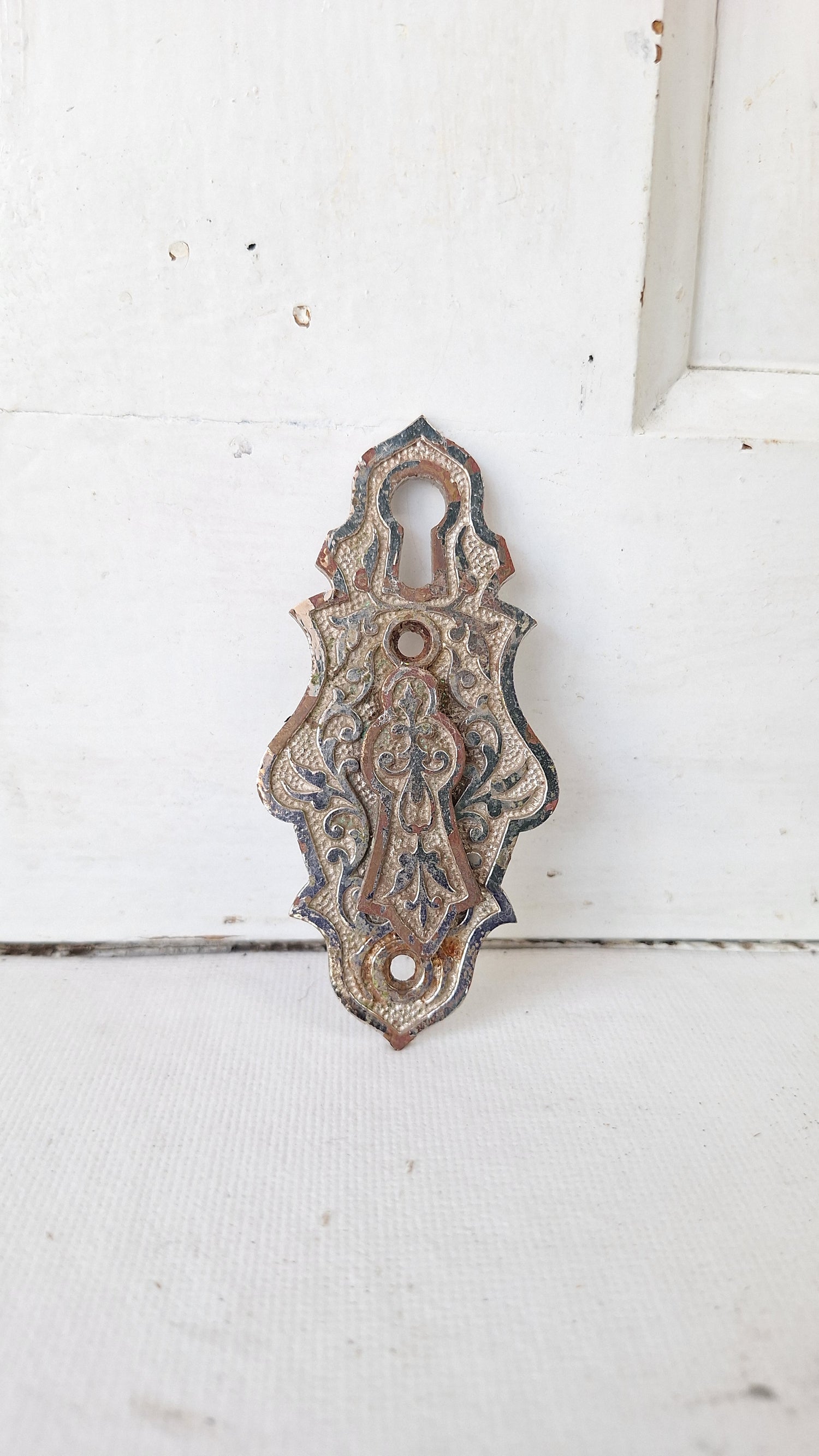An absolutely stunning antique nickel plated bronze keyhole cover from the late 1800s. The intricate design and unusual profile set this pattern apart from many of the more common styles. This piece is solid bronze and can be used on interior or exterior doors. The bottom keyhole cover swings to the side to allow for a key. Please see all of our pictures for details and dimensions. This item ships free within the US.