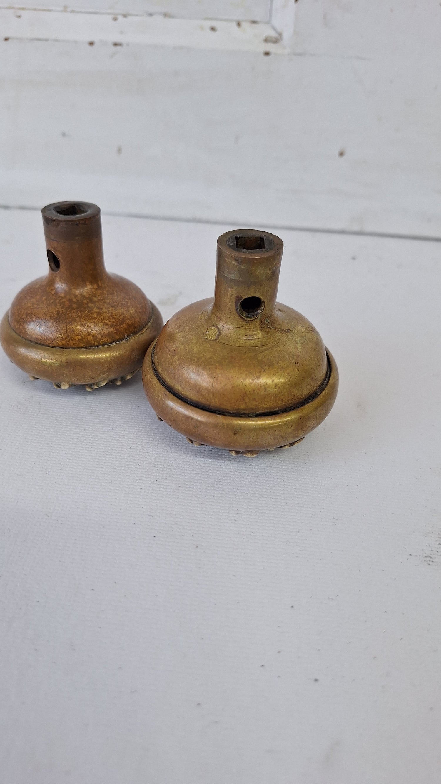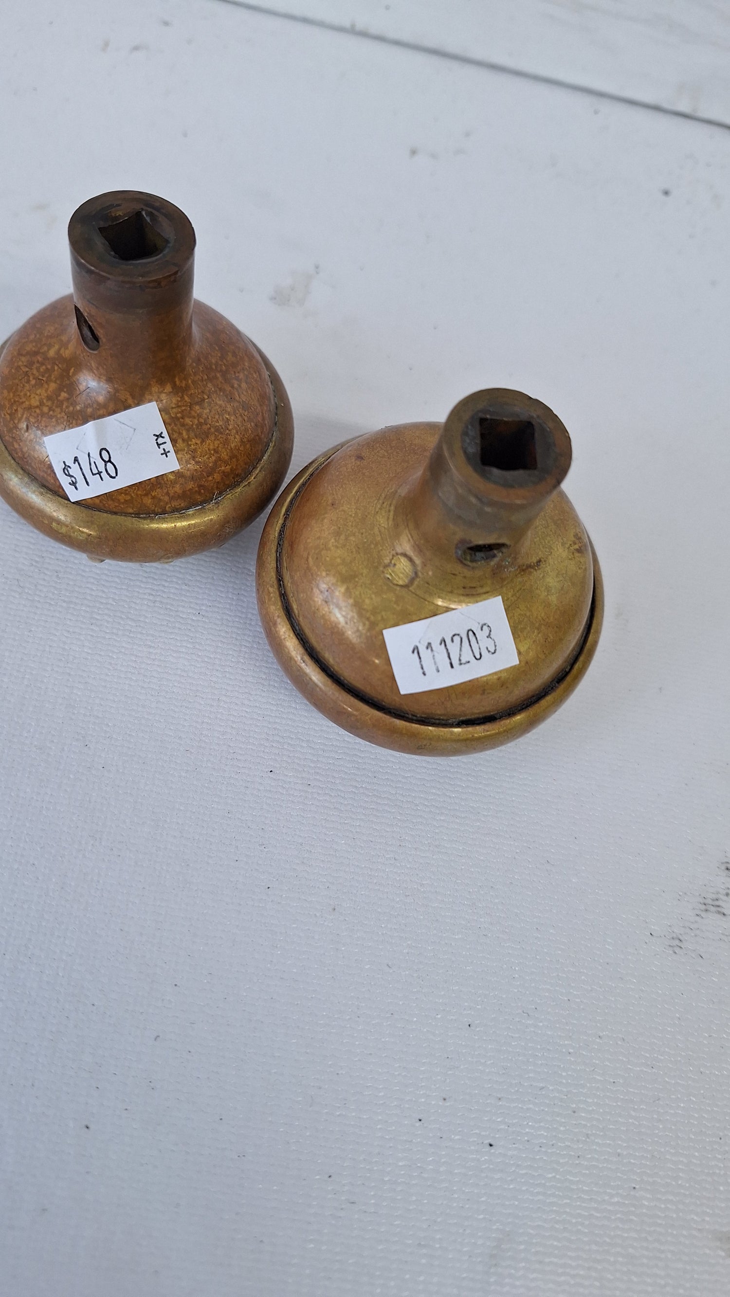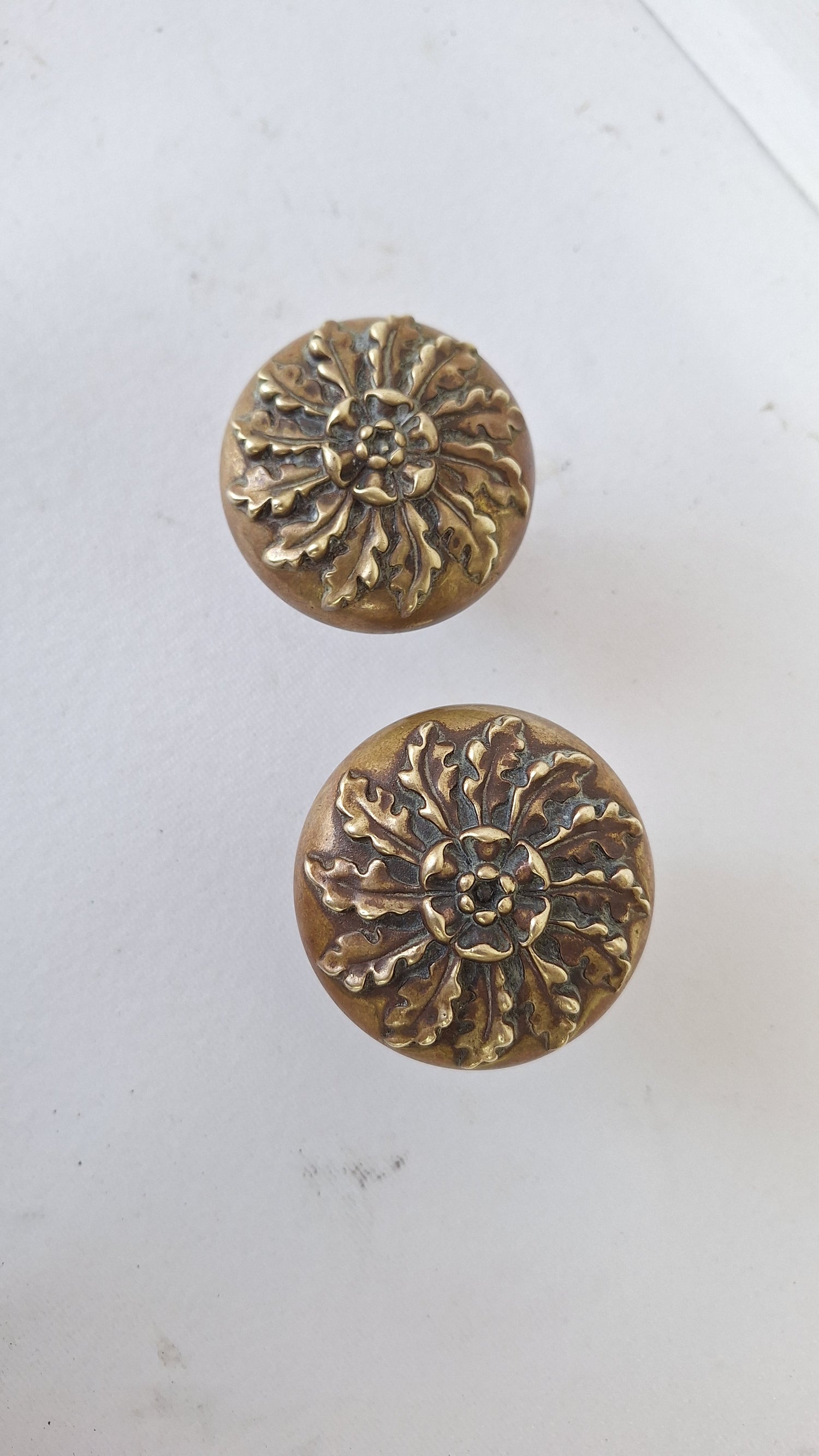 A stunning set of Vericchio pattern doorknobs by Russell and Erwin c. 1896. This pair includes a standard passage size knob and a large entry size knob. They use a standard 1/4" spindle. Please see all of our pictures for details on this pair. This set ships free within the US. www.peoriasalvage.com