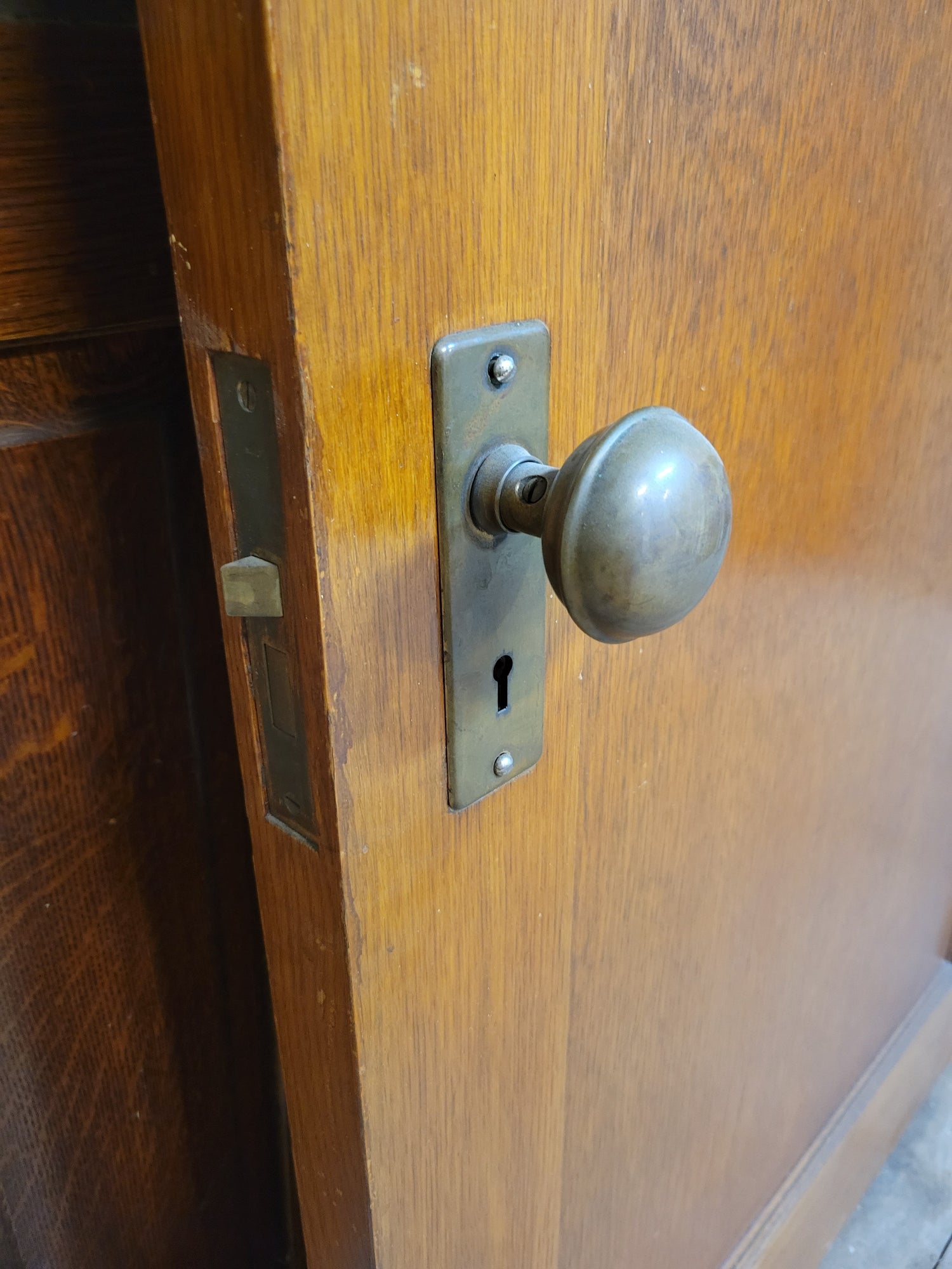 A larger sized interior door with two inset panels and the original finish which is in excellent condition. This door comes with the Japanned brass hinges, mortise lock, plates and knobs. Beyond a few small marks in the finish, this piece is in excellent shape and would be a perfect addition to an early 1900s home or a fast way to add character to a remodel or new build. Please see all of our pictures for details.
