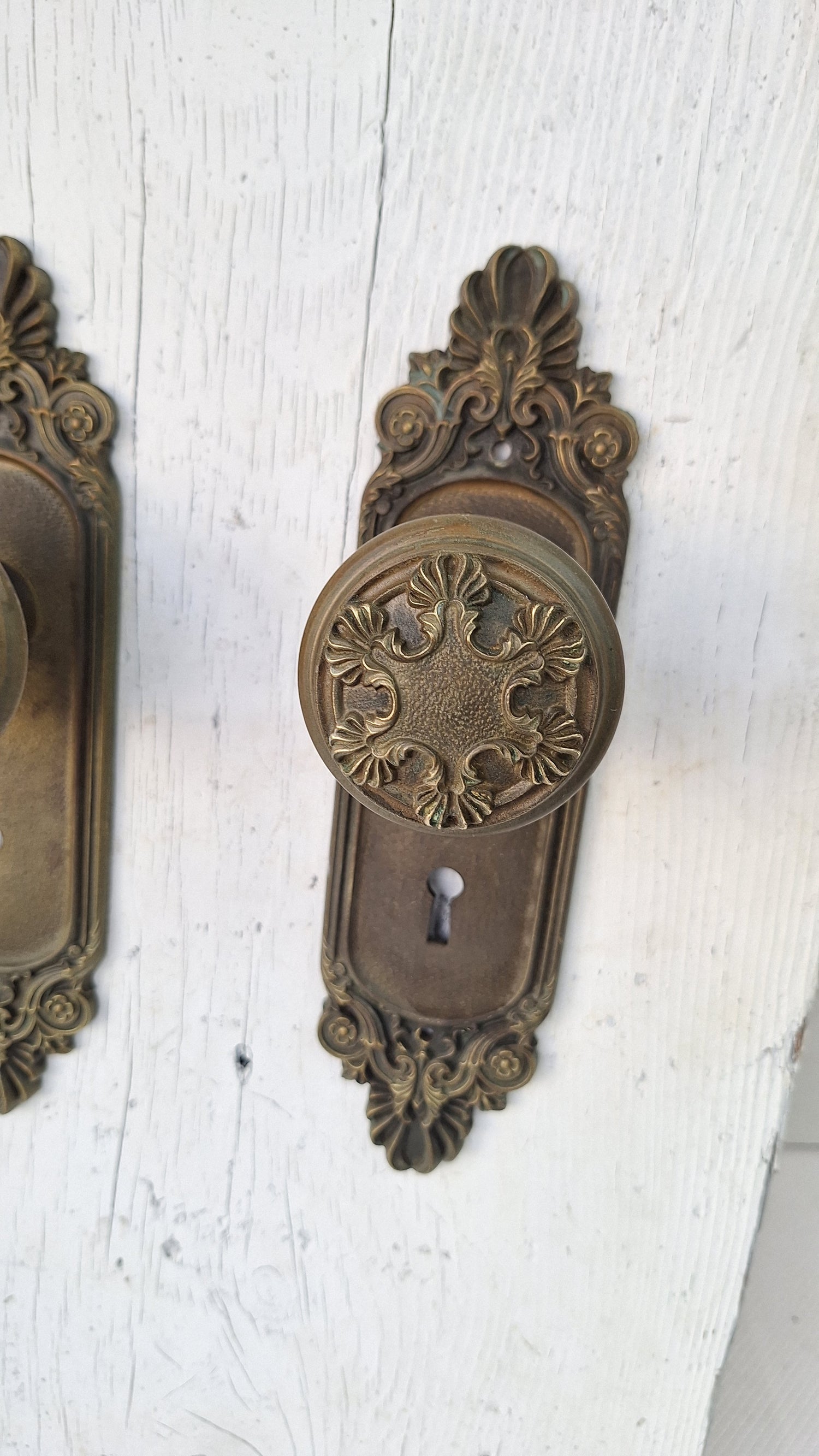 Olympus Doorknobs and Plate Set, Antique Fancy Door Knobs and Backplates, Ornate Bronze Doorknob, Victorian Era, Antique Bronze Knob 082905