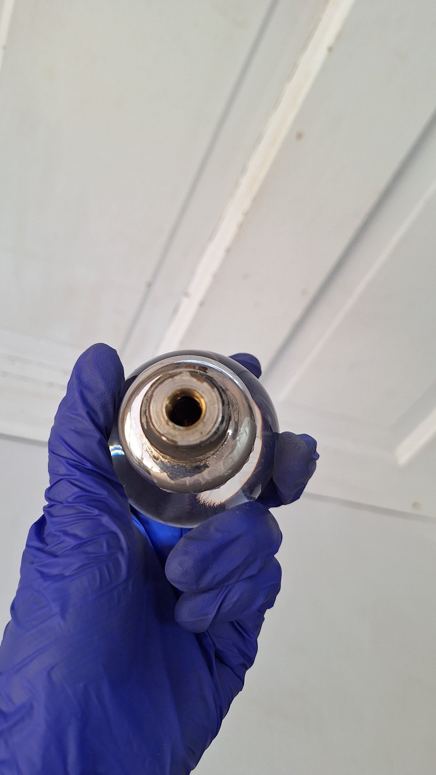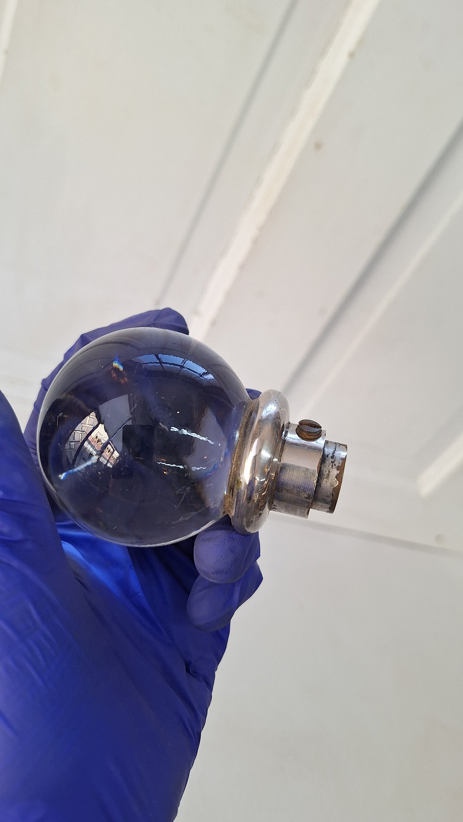 A pristine condition round glass doorknob with gorgeous silver foil star in the center. This is a single knob as shown and does not have a mate. The glass is in excellent condition, the nickel plated shank shows normal signs of wear, however, interior threading appers to be in very good, usable condition.