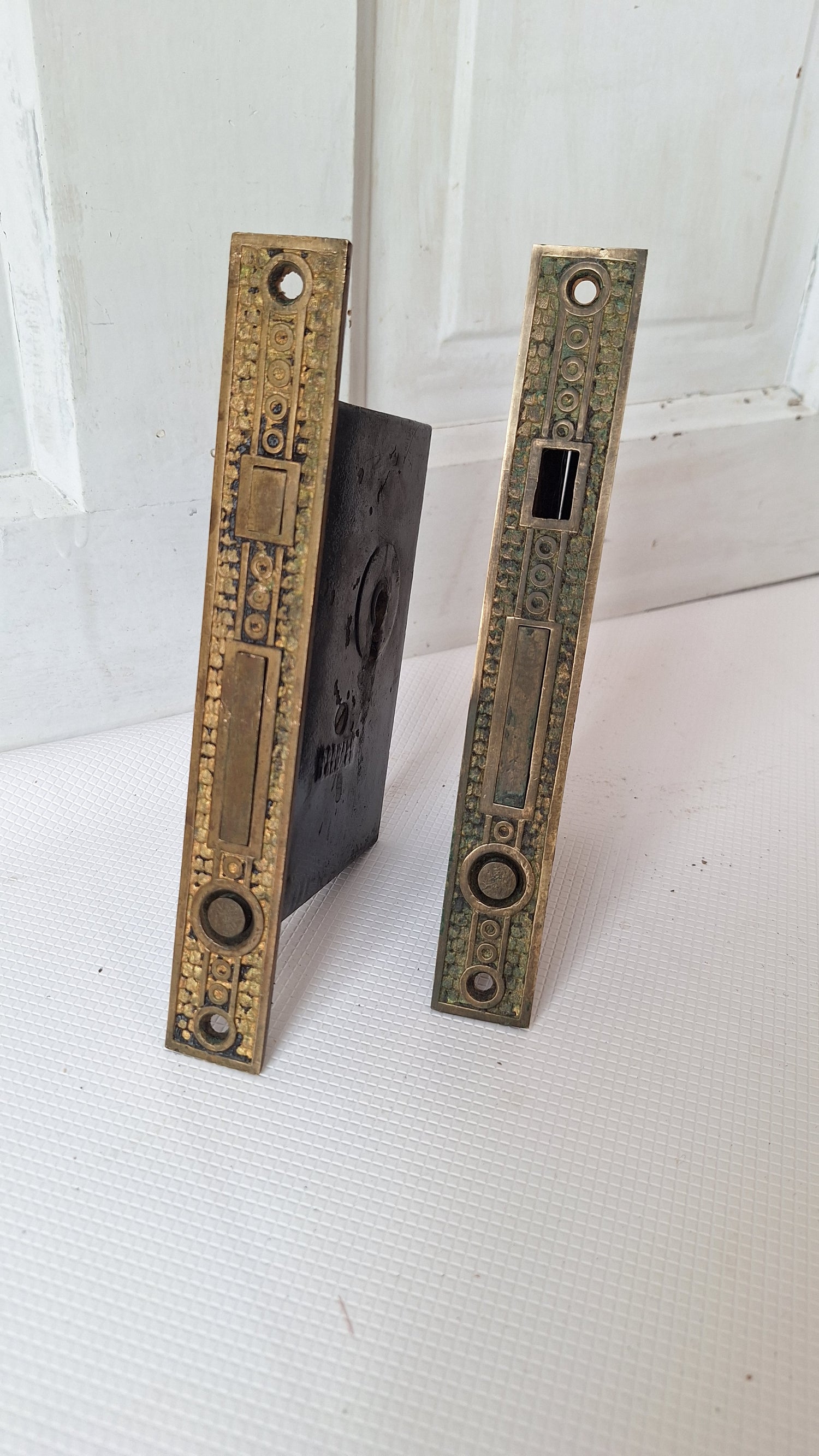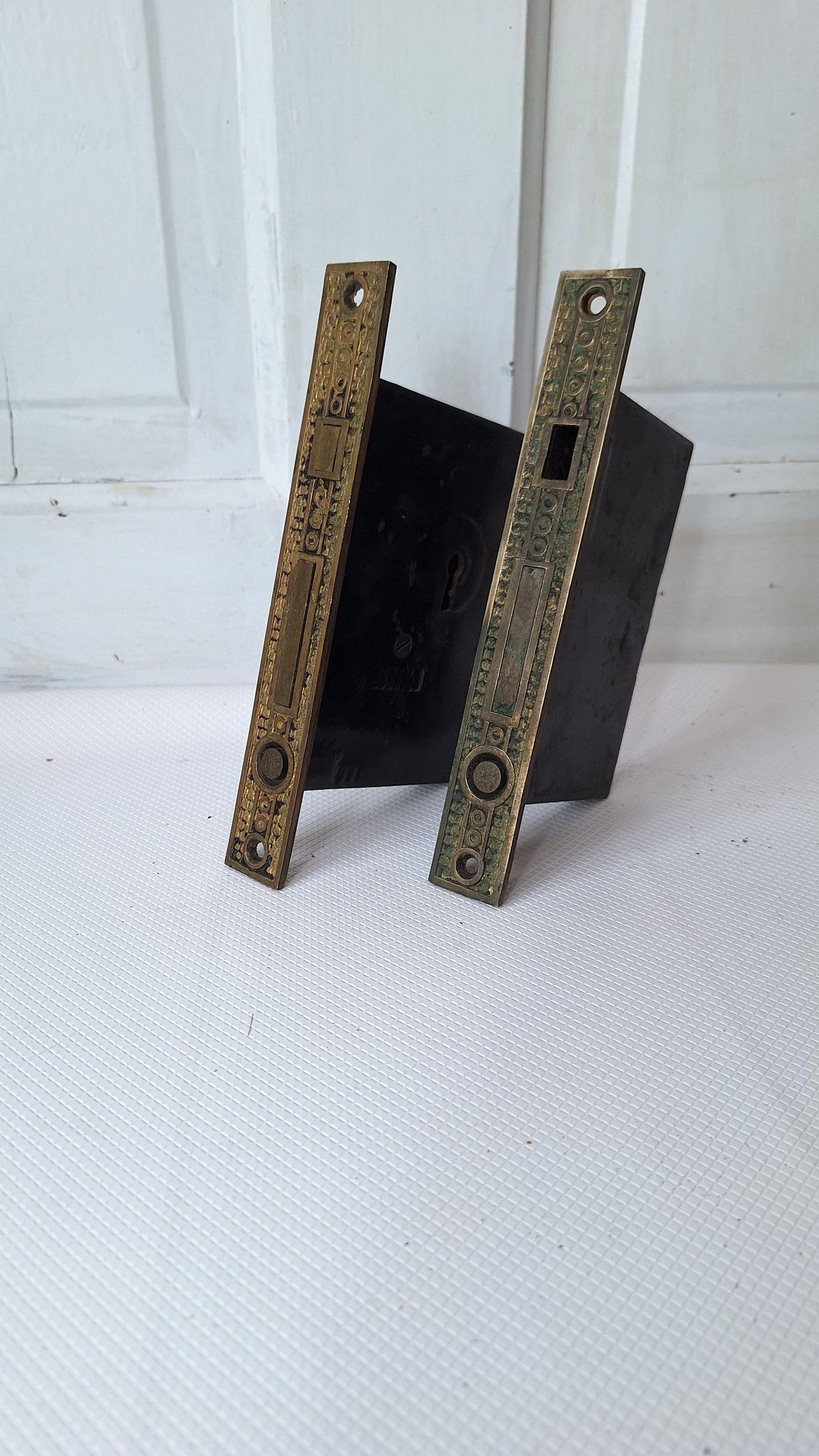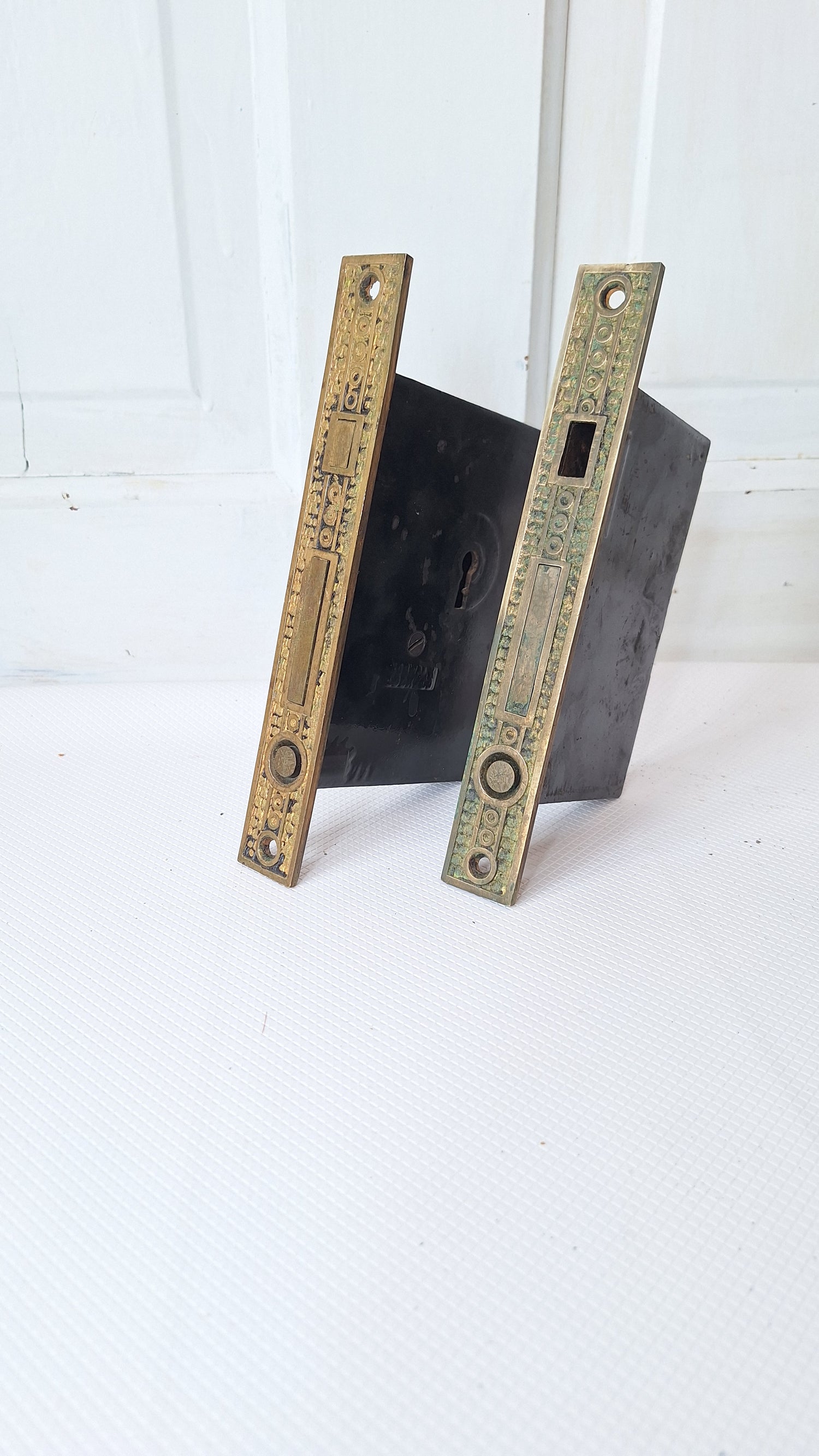 A complete double pocket door mortise lock set with beautiful cast bronze face plates. This set has been cleaned and is in working condition. There is a 'male and female' pair to this set as shown. The faceplates are solid bronze and the bodies are cast iron. All moving parts are in excellent working condition. Please see all of our pictures for details and dimensions. The two locks are different depths as shown. This pair ships free within the US. www.peoriasalvage.com