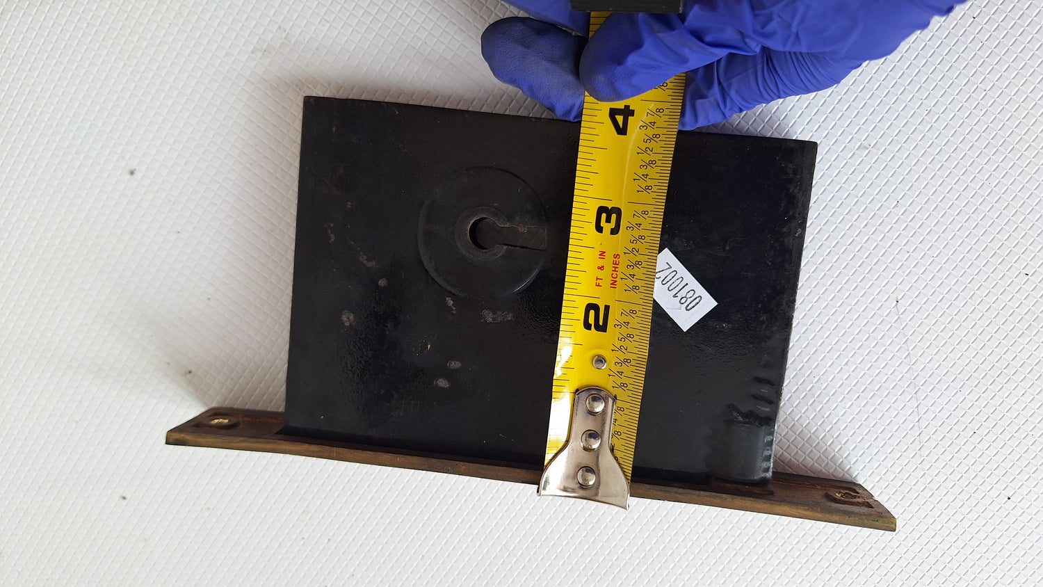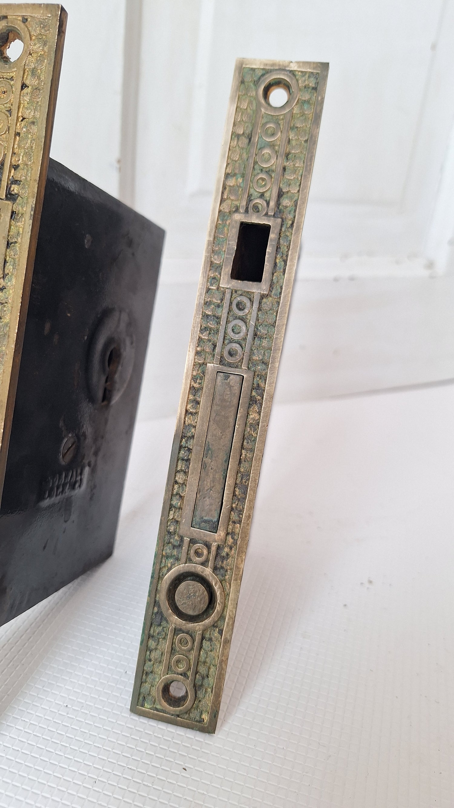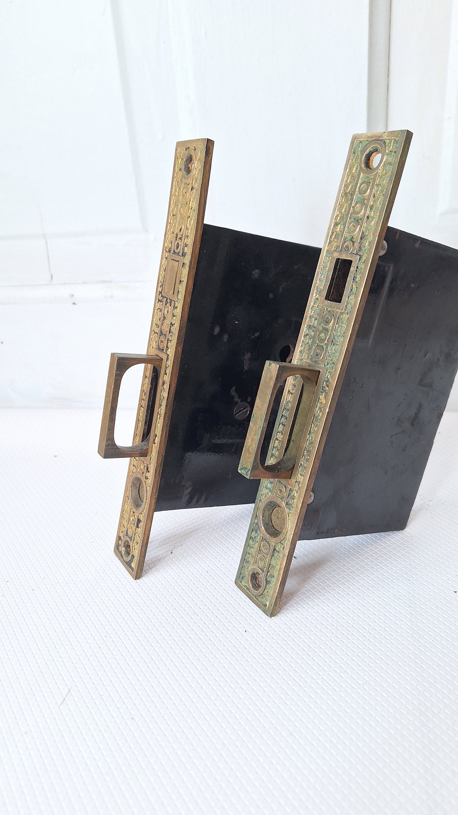 A complete double pocket door mortise lock set with beautiful cast bronze face plates. This set has been cleaned and is in working condition. There is a 'male and female' pair to this set as shown. The faceplates are solid bronze and the bodies are cast iron. All moving parts are in excellent working condition. Please see all of our pictures for details and dimensions. The two locks are different depths as shown. This pair ships free within the US. www.peoriasalvage.com