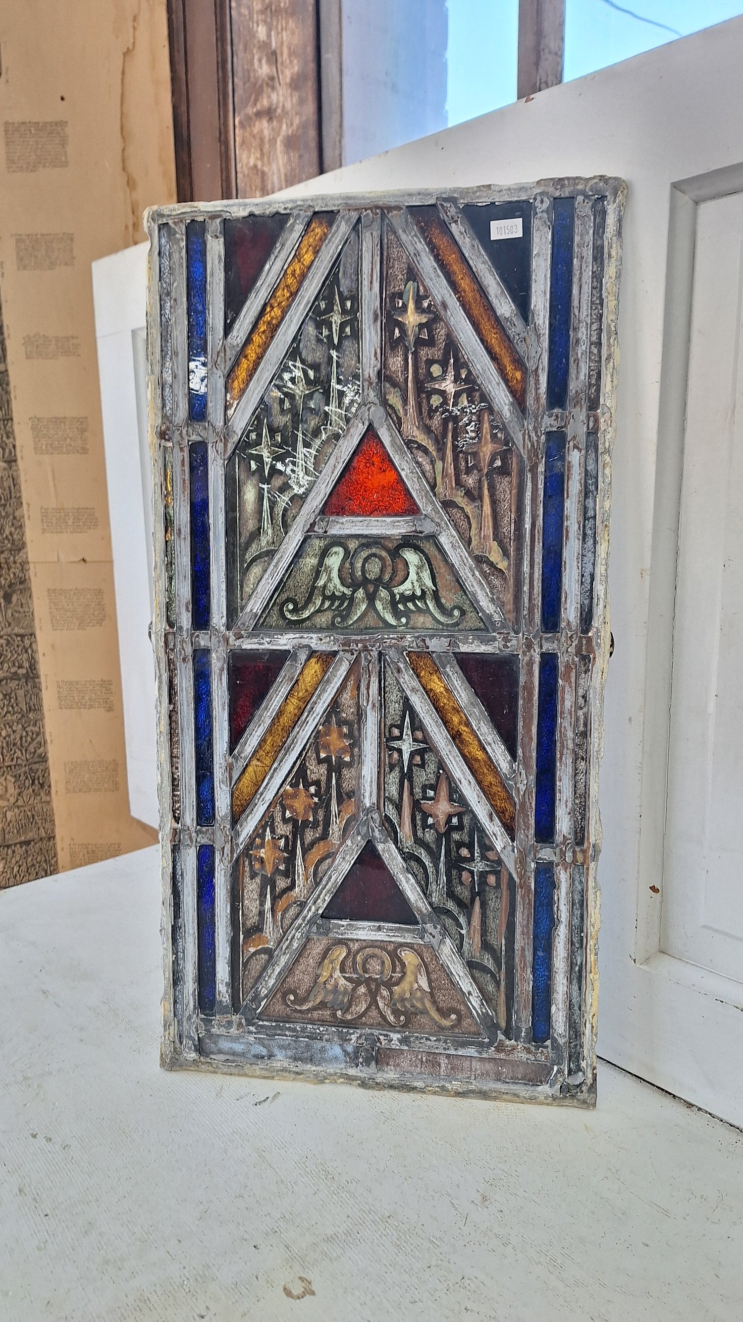 Painted Angel and Star Design Antique Stained Glass, Vintage Church Window