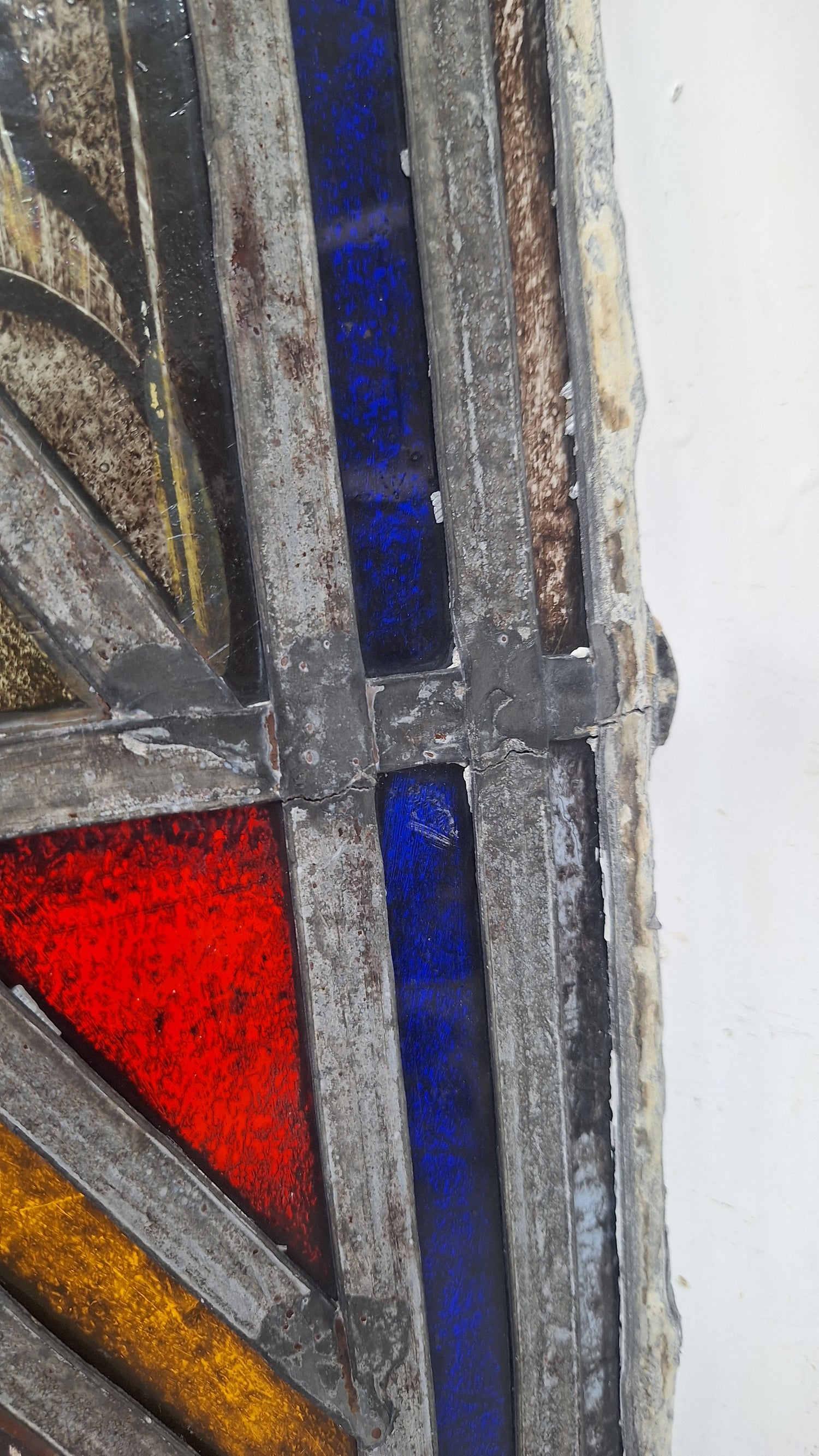 A stunning jewel-tone stained glass window salvaged from a Champaign, Illinois 1930s church prior to demolition. The painted details include whimsical stars and stylized angels. The lead caming is very thick as shown. There is slight bowing in the leading of this piece and crimping around the outside edges as shown along with a few small cracks in the outer lead frame as shown. There is a straight crack in one pane as shown. This would be an incredible piece to display in front of an existing window to show off the wonderful colors.