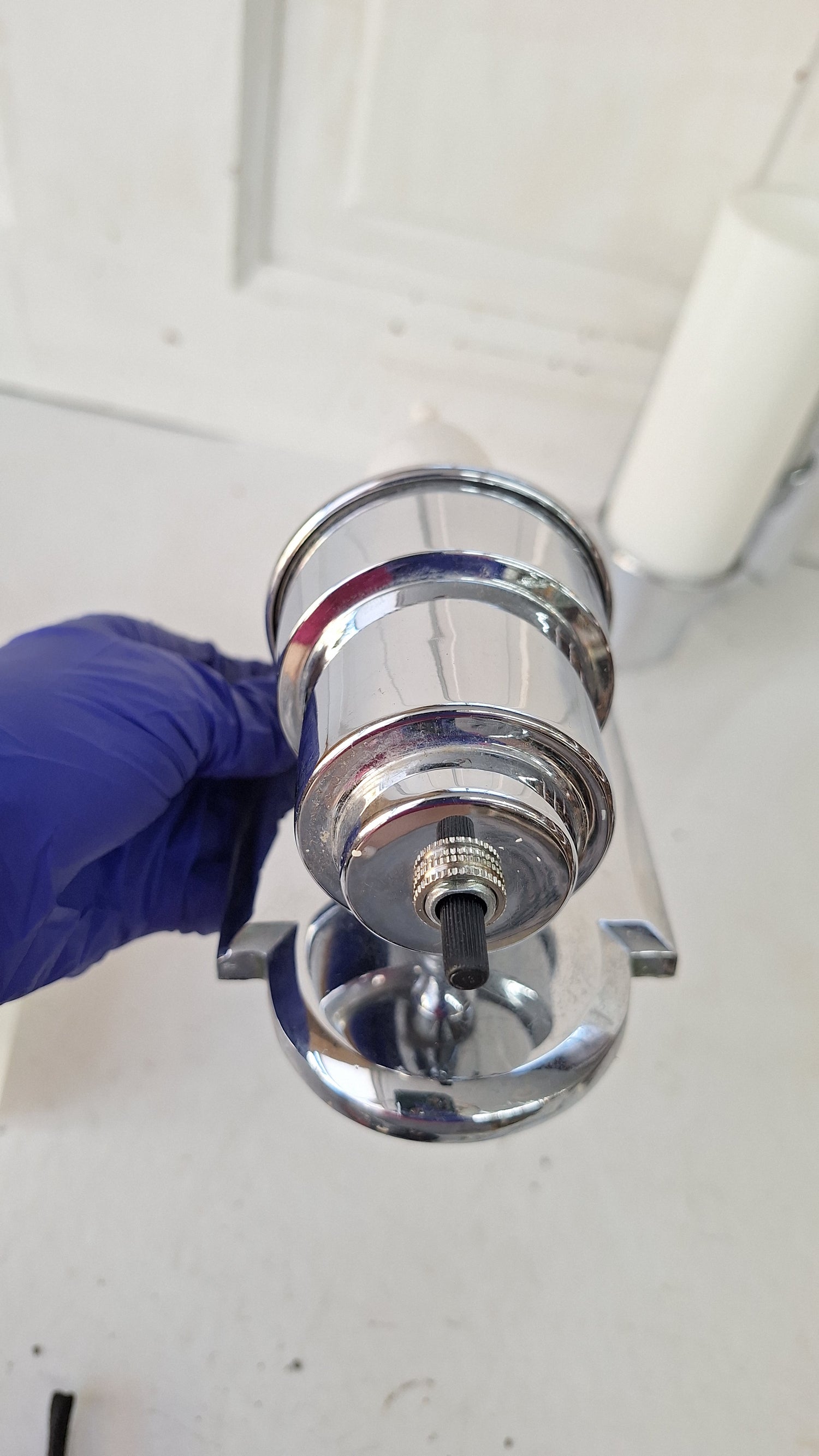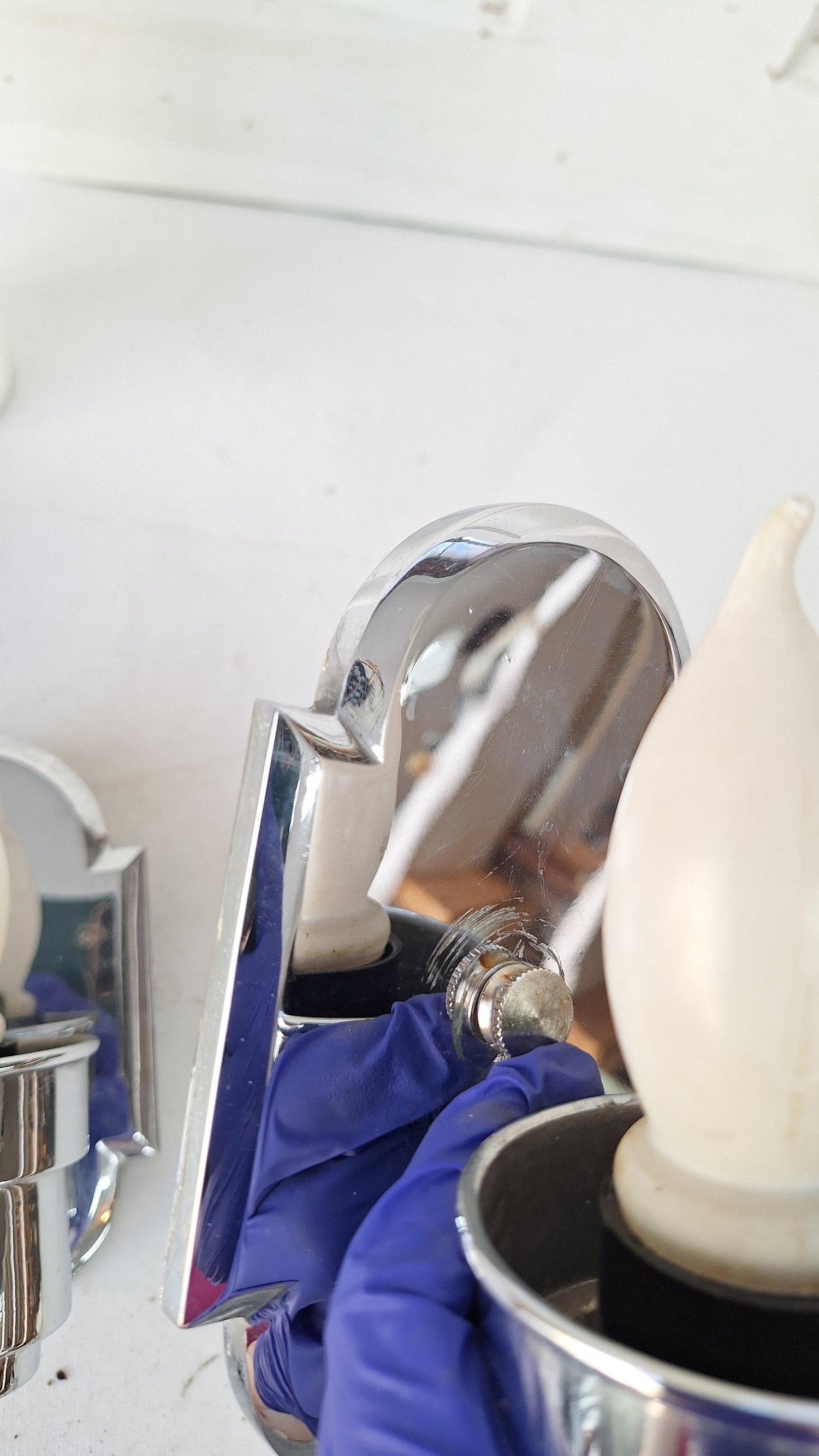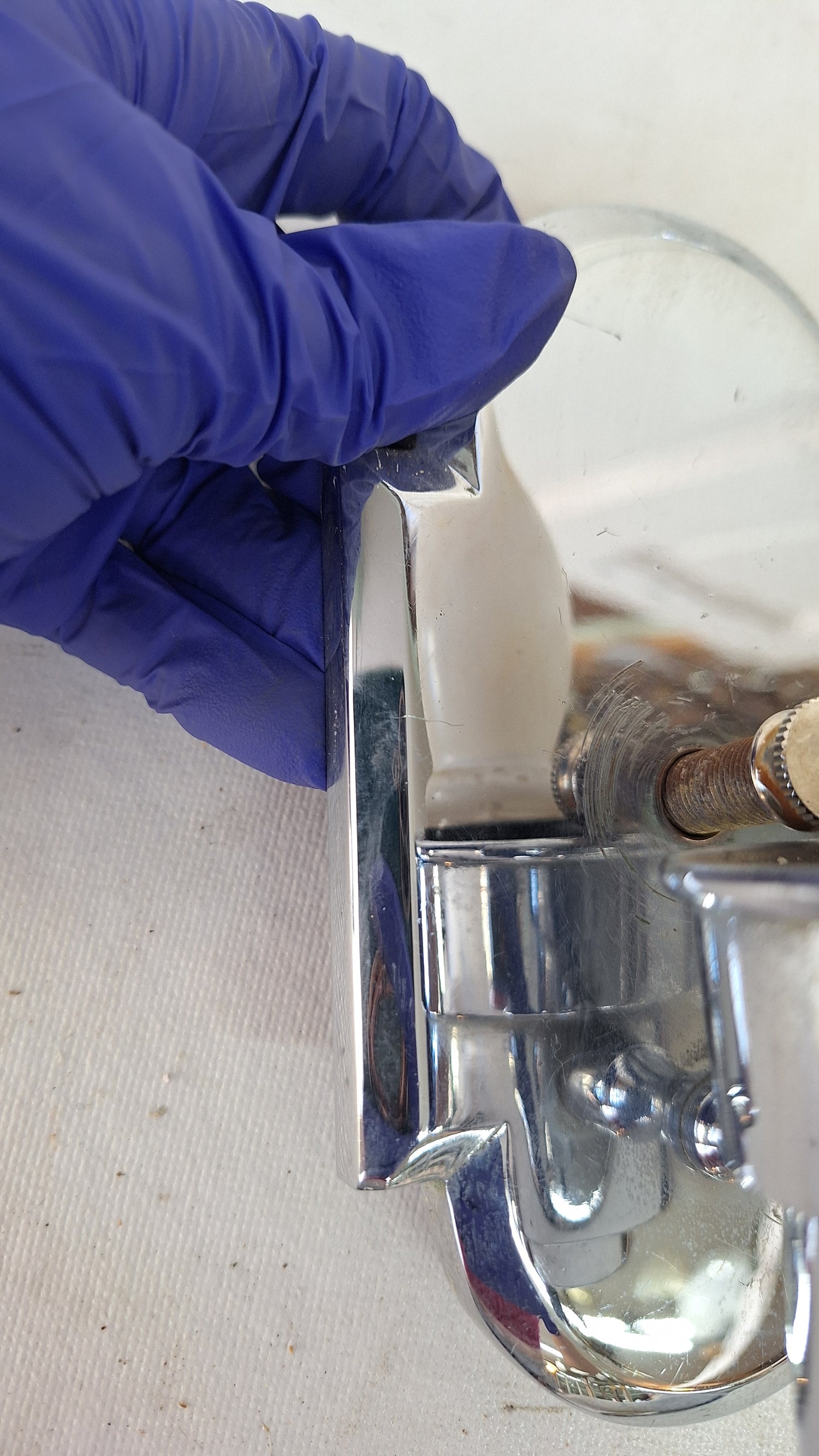 A pair of Art Deco, 1930s era chrome and white glass bathroom sconces. These have been cleaned, rewired, and are ready for installation. The sockets are new and the switches are in working order. There are imperfections in the chrome finish, specifically etching around the center mount and some minor paint around the back edges of the lights. Please see all of our pictures for details.