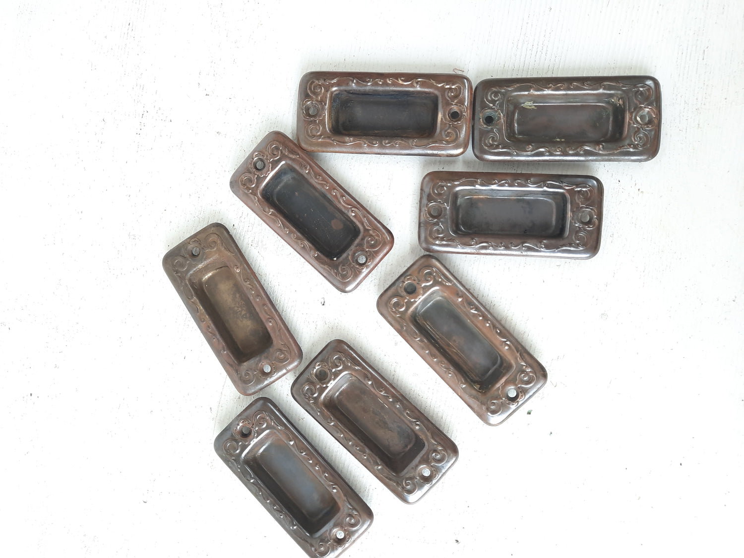 A pair of stamped bronze or brass window lifts or sash lifts. We have multiple pairs of these available. Each set of two has been cleaned and polished. They have a simple design around the outside edge and beautiful sheen to the metal.