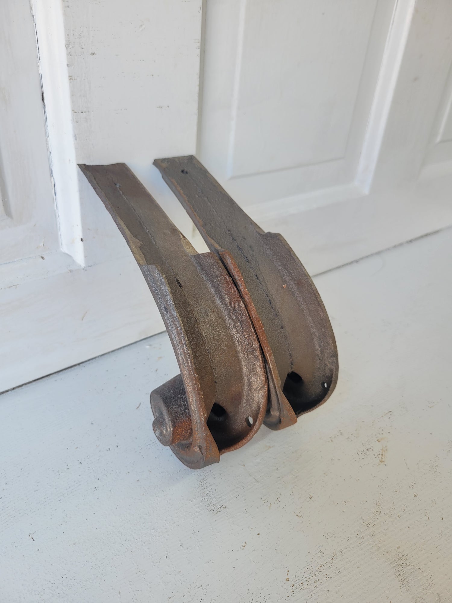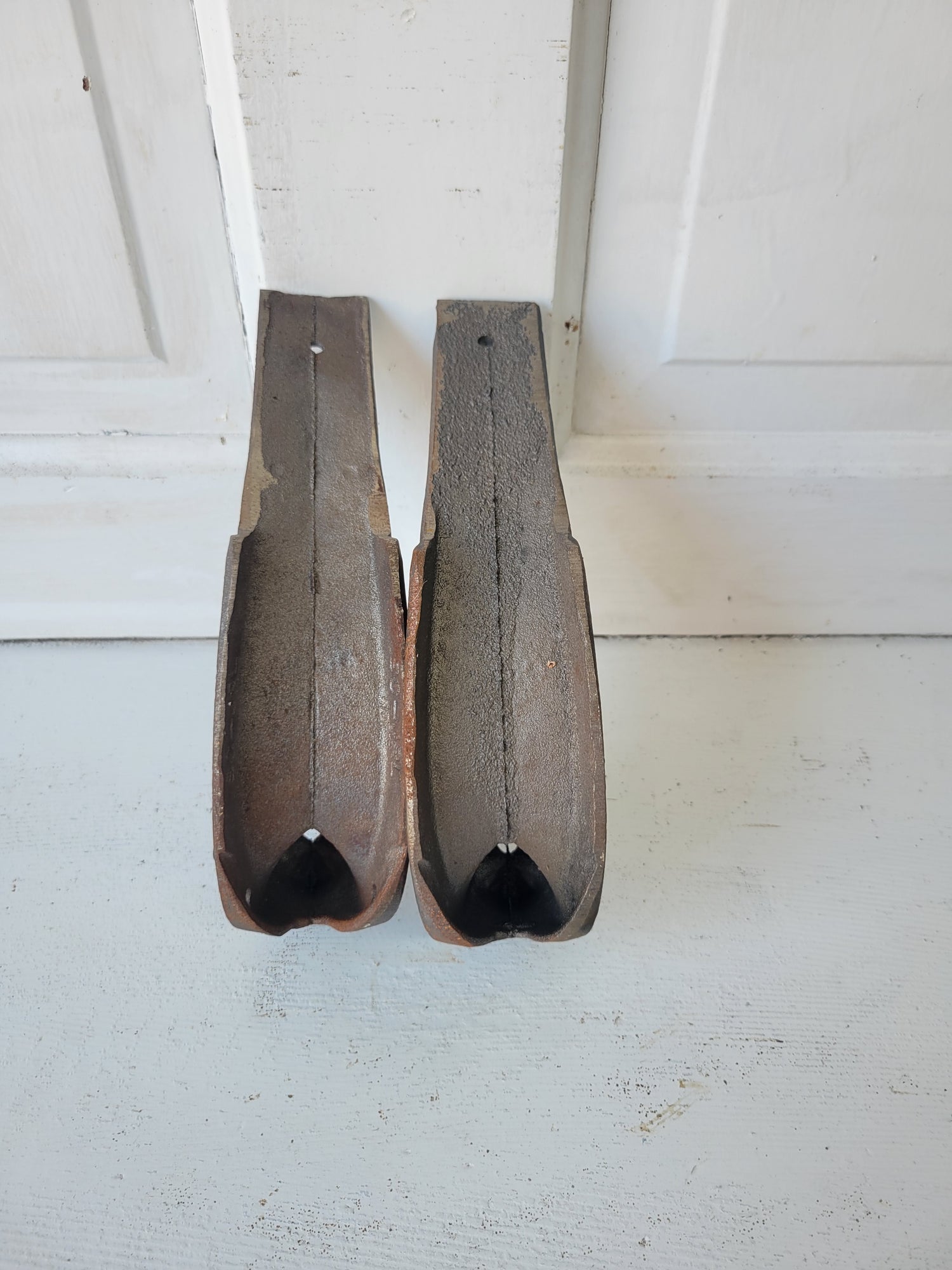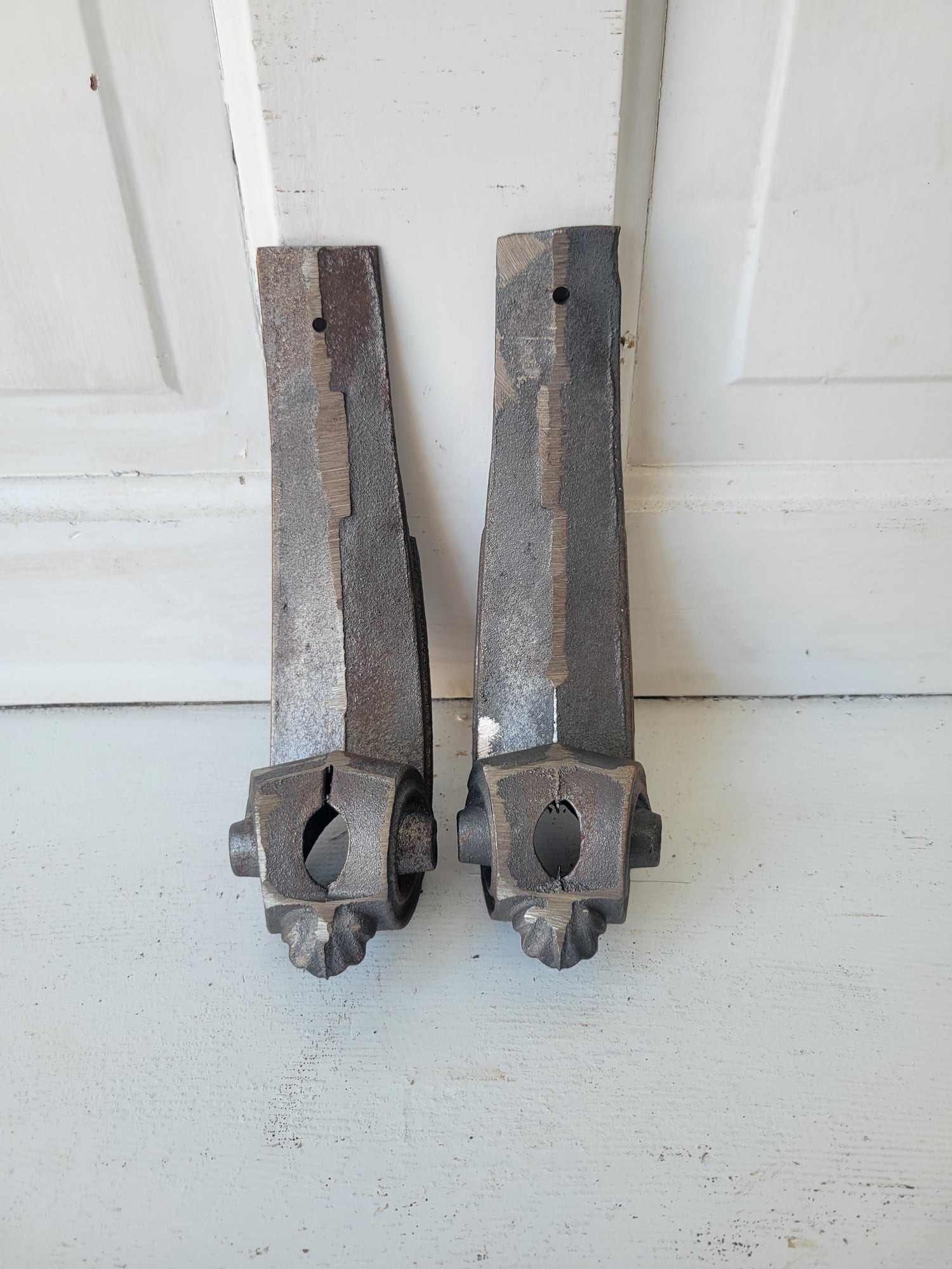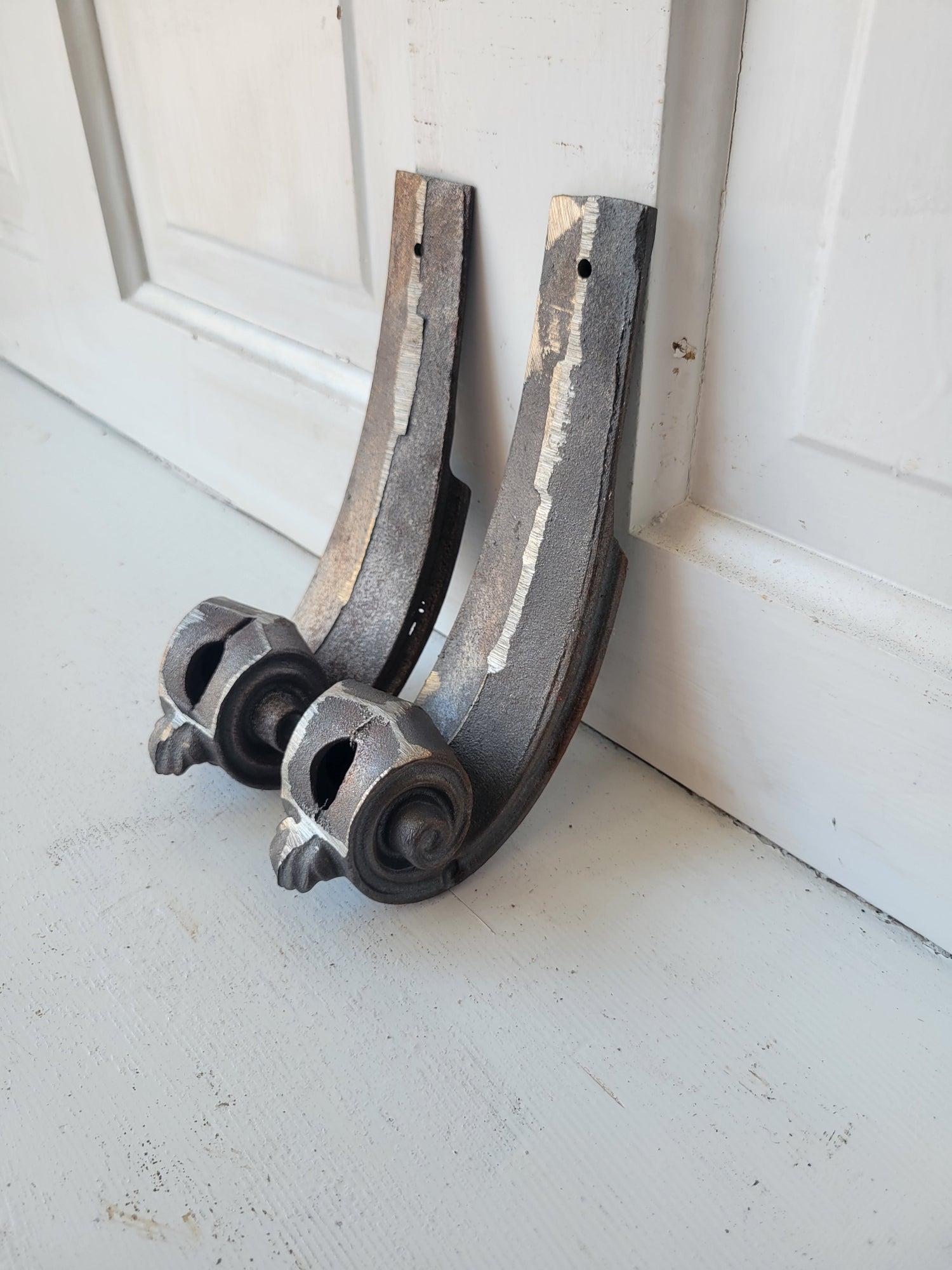 Two scroll designed, cast iron architectural details that have been pre-drilled for easy hanging. These would make beautiful towel or coat hooks. The metal is 'as found', but would be easy to paint in a variety of colors to match your home. Please see all of our pictures for details and measurements. This pair ships free within the US. Multiple pairs available.