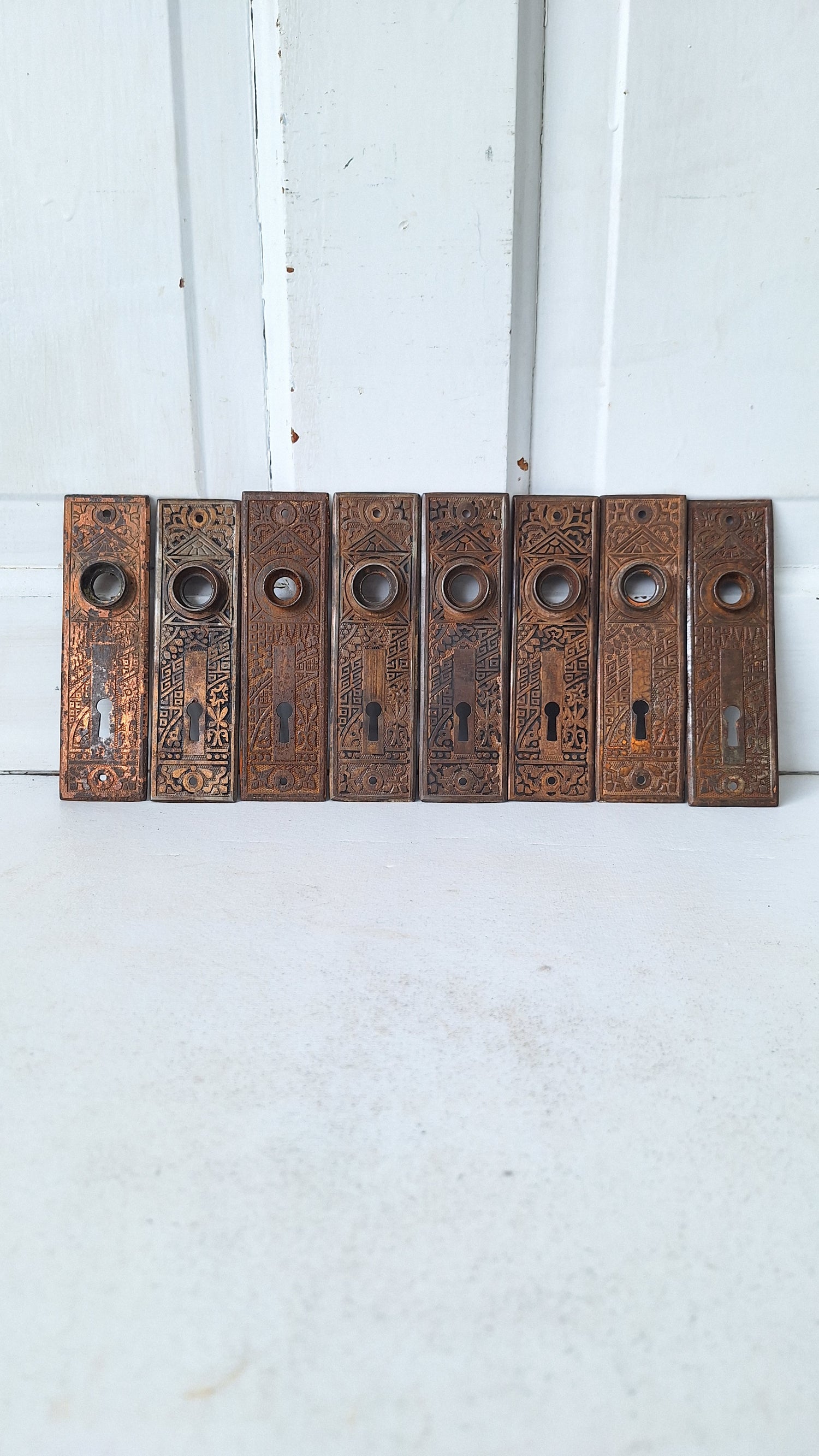 One Eastlake style brass plated, cast iron door back plate. These were salvaged from a home slated for demolition and are ready for a fresh start in your home! Be sure to review pictures carefully to see the intricate design of these ornate pieces. They are the perfect finishing touch for a restoration or special door in your home.