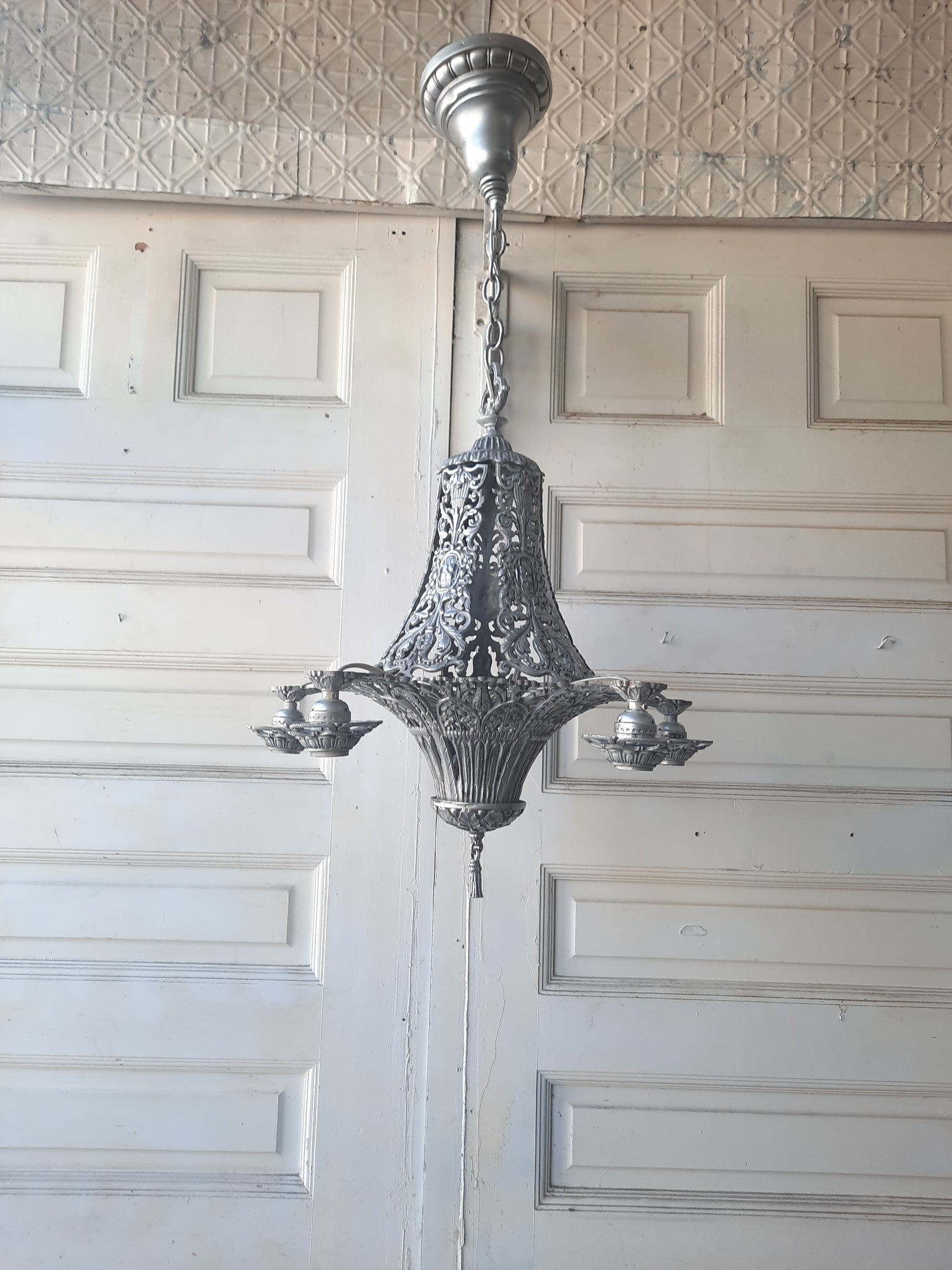 Pierced Metal Antique Chandelier in Pewter Finish, Aged Silver Riddle Style Chandelier