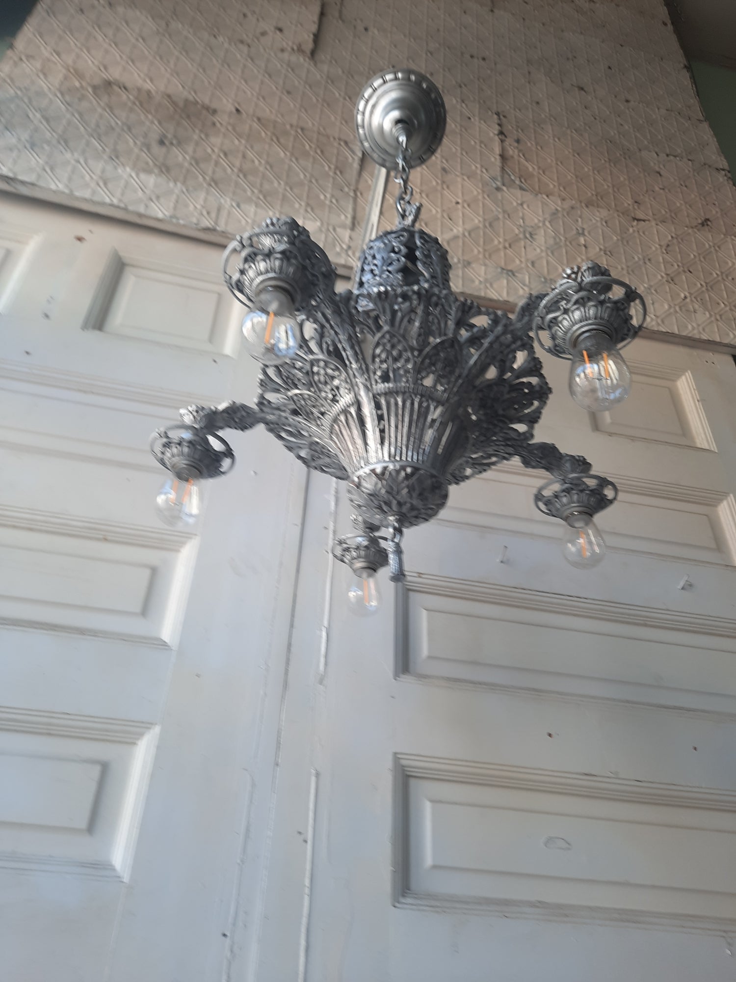 This antique cast metal chandelier measures approx. 33" tall overall by 19" across. This item ships free within the continental US. No PO boxes please.