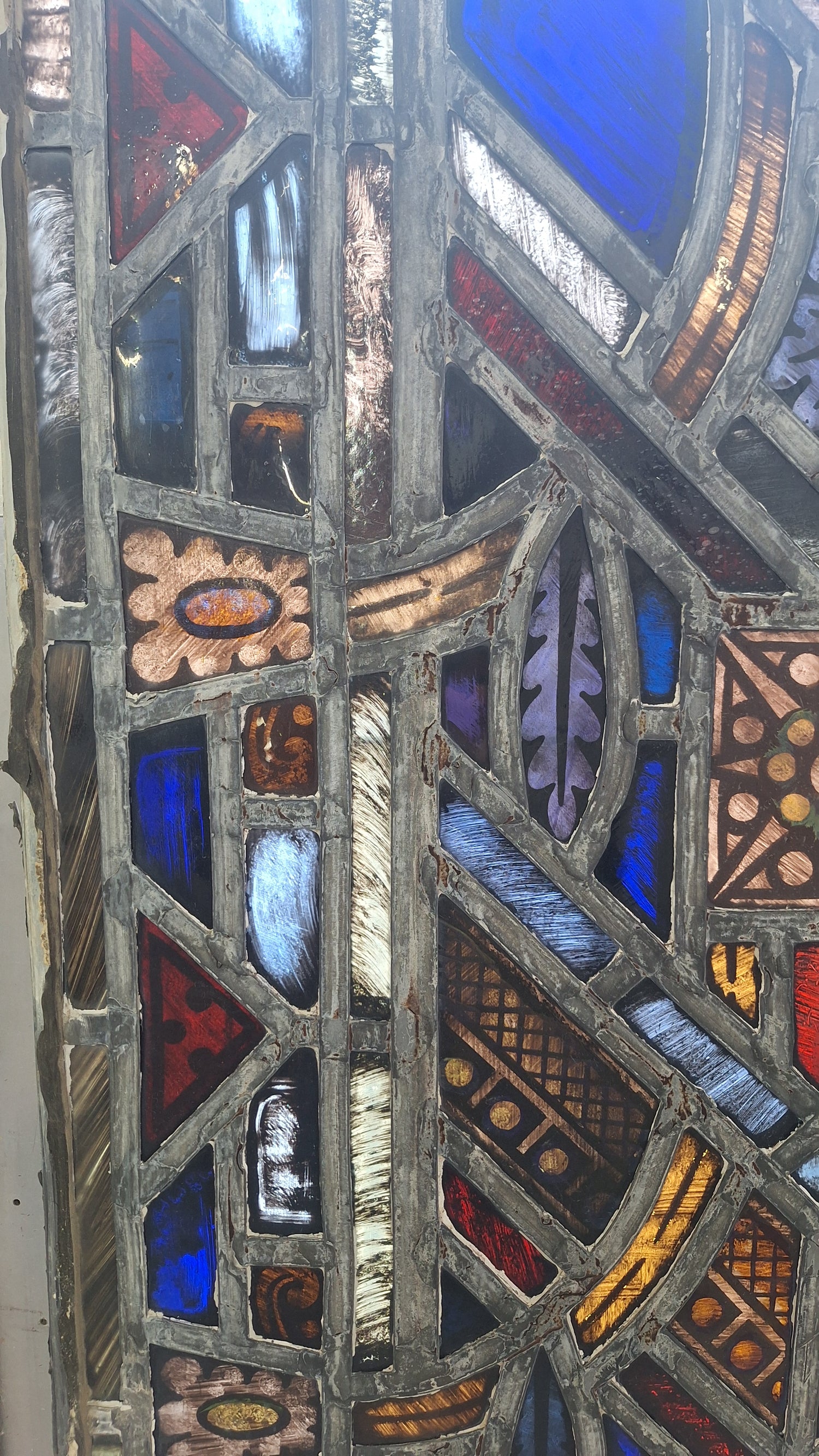 A stunning jewel-tone stained glass window salvaged from a Champaign, Illinois 1930s church prior to demolition. The painted details include stylized leaves, stars, and other designs. The lead caming is very thick as shown. There is slight bowing in the leading of this piece and crimping around the outside edges as shown as well as some hairline cracks in lead corners as we're tried to show. None of the glass panes are cracked. This would be an incredible piece to display in front of an existing window to show off the wonderful colors.