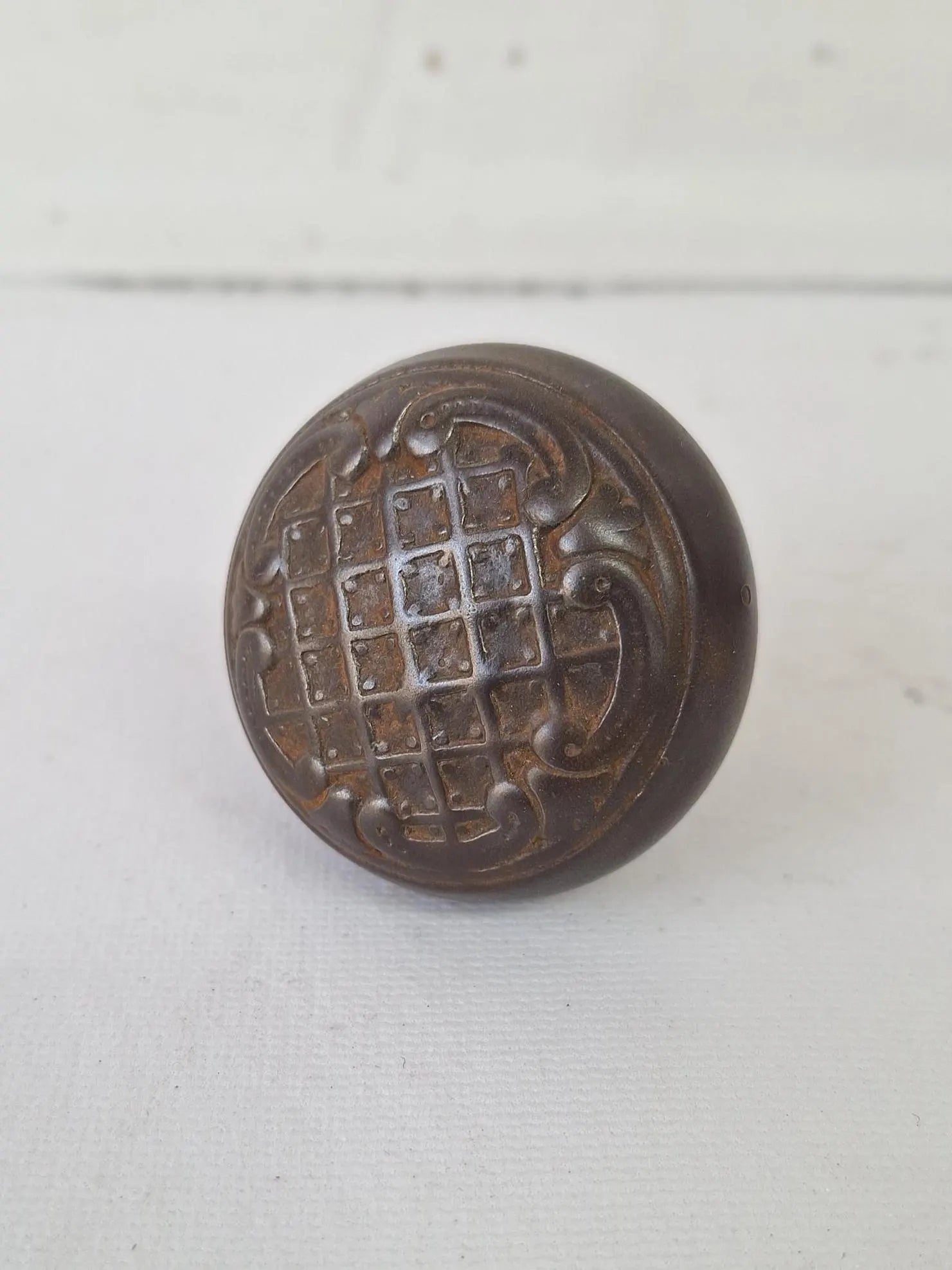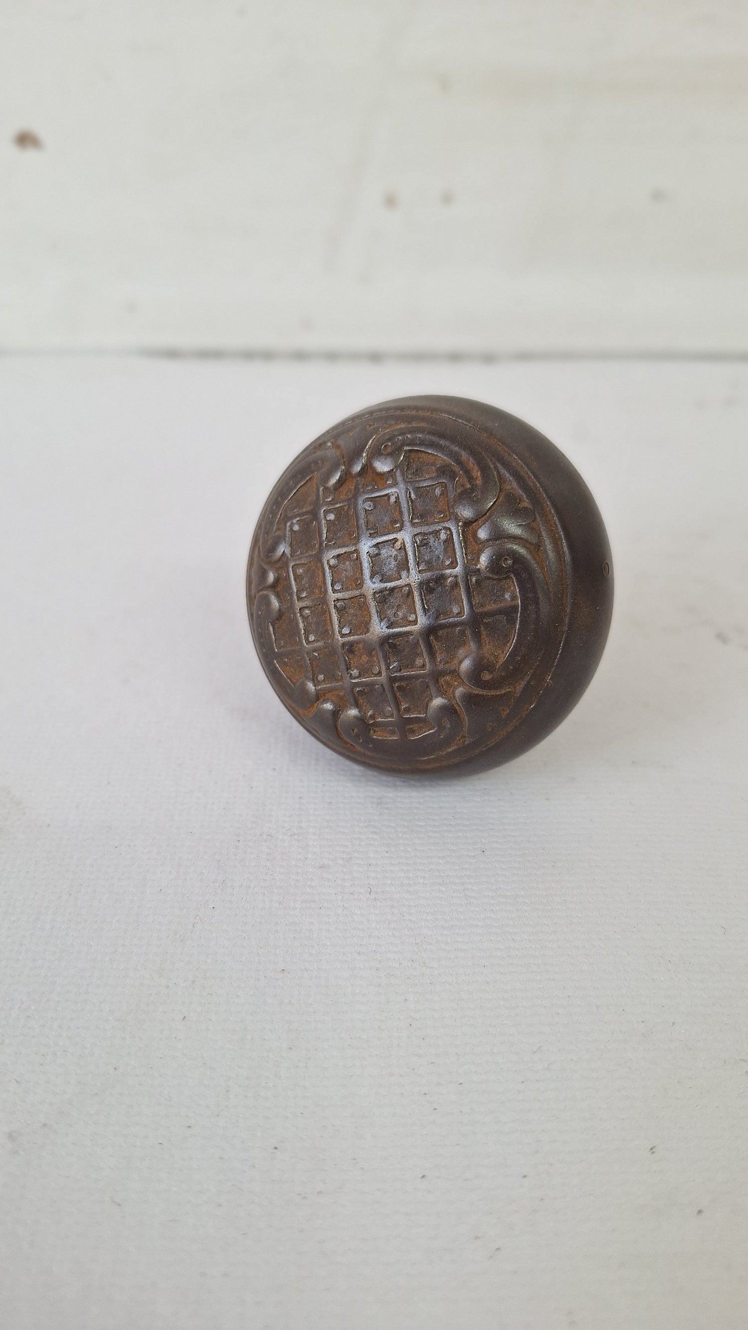 A detailed, heavy iron doorknob with a checkered or 'diaper' pattern across the face encircled by a scroll design. We have lightly polished this knob to bring out the detail and shine. This knob uses a standard 1/4" spindle. This item ships free within the US. www.peoriasalvage.com
