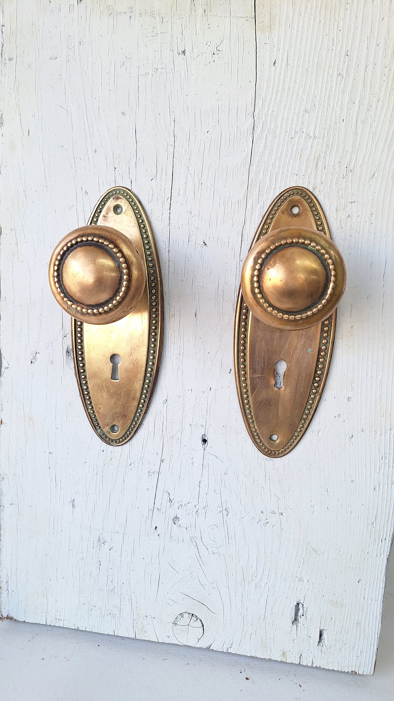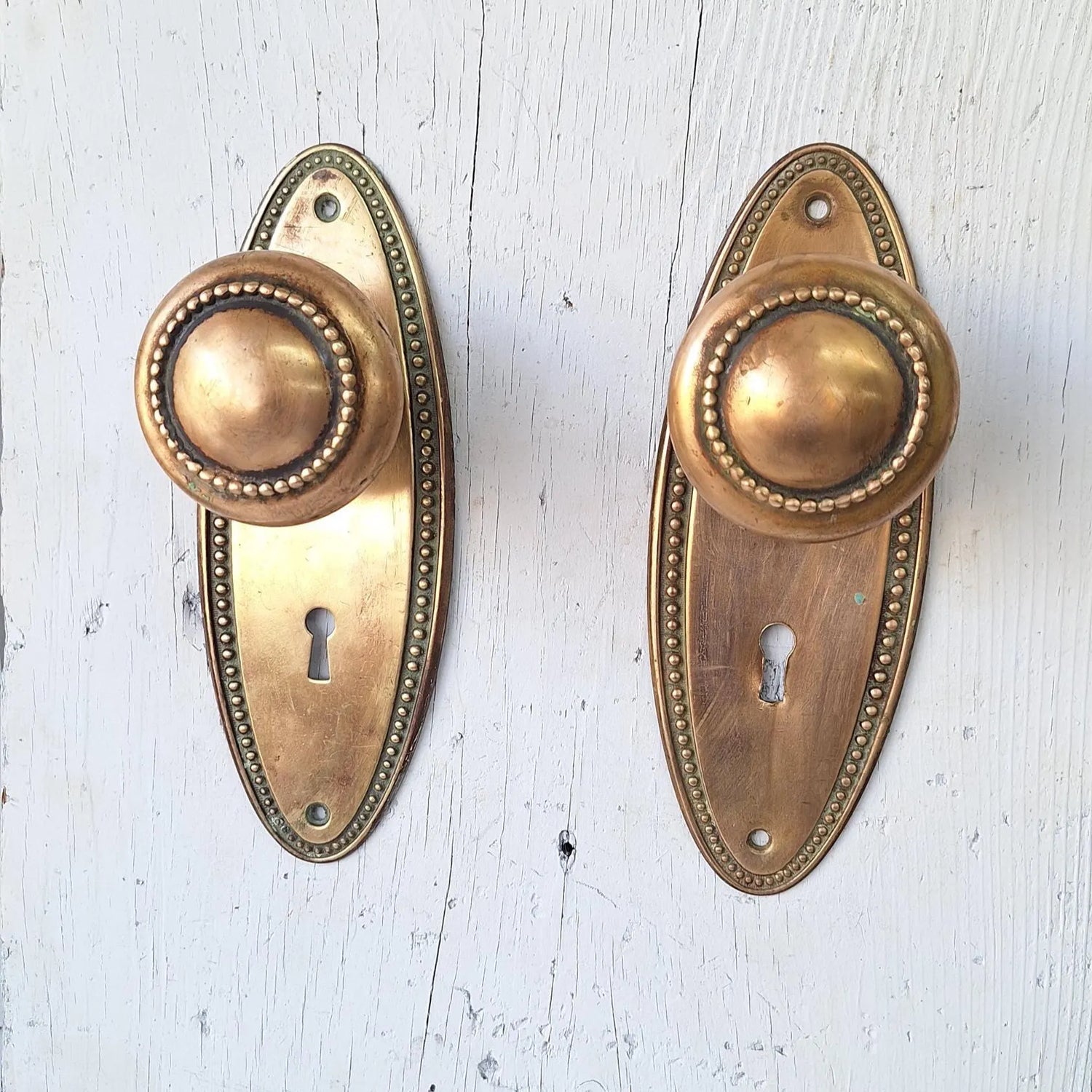Set of Oval Brass Doorknobs and Plates, Antique Door Hardware Set