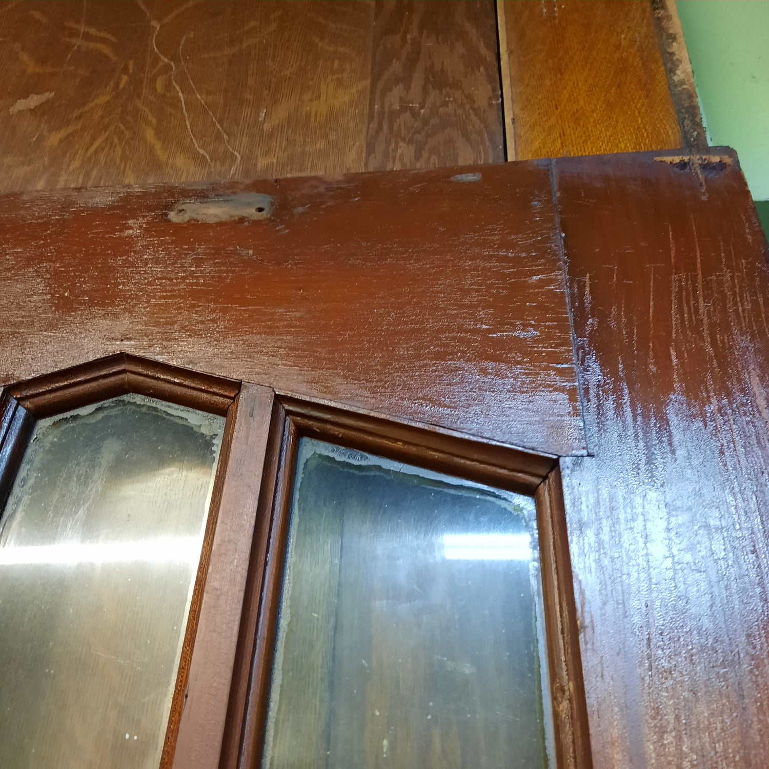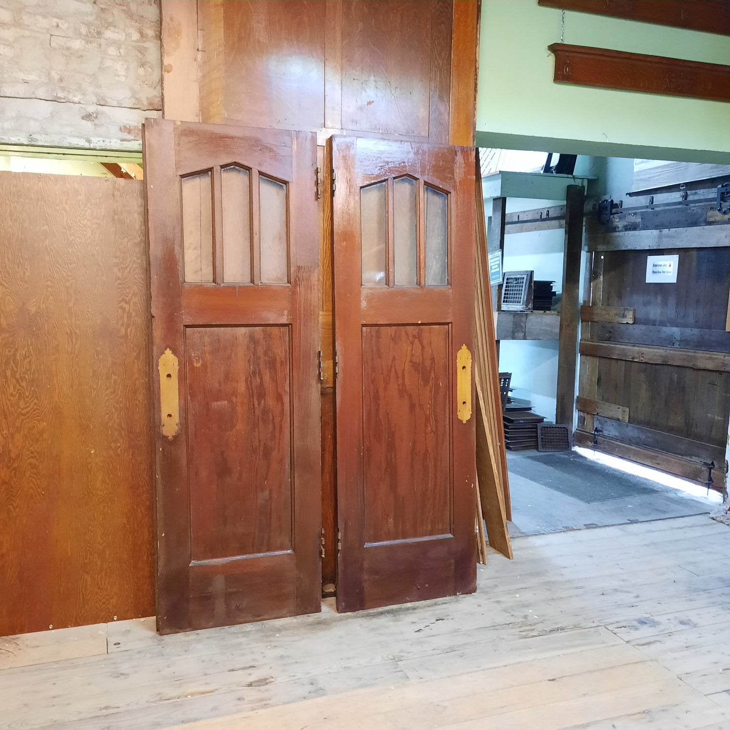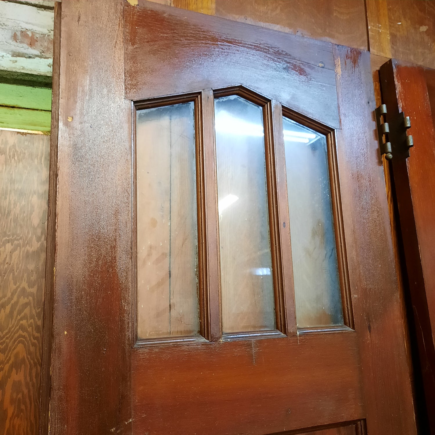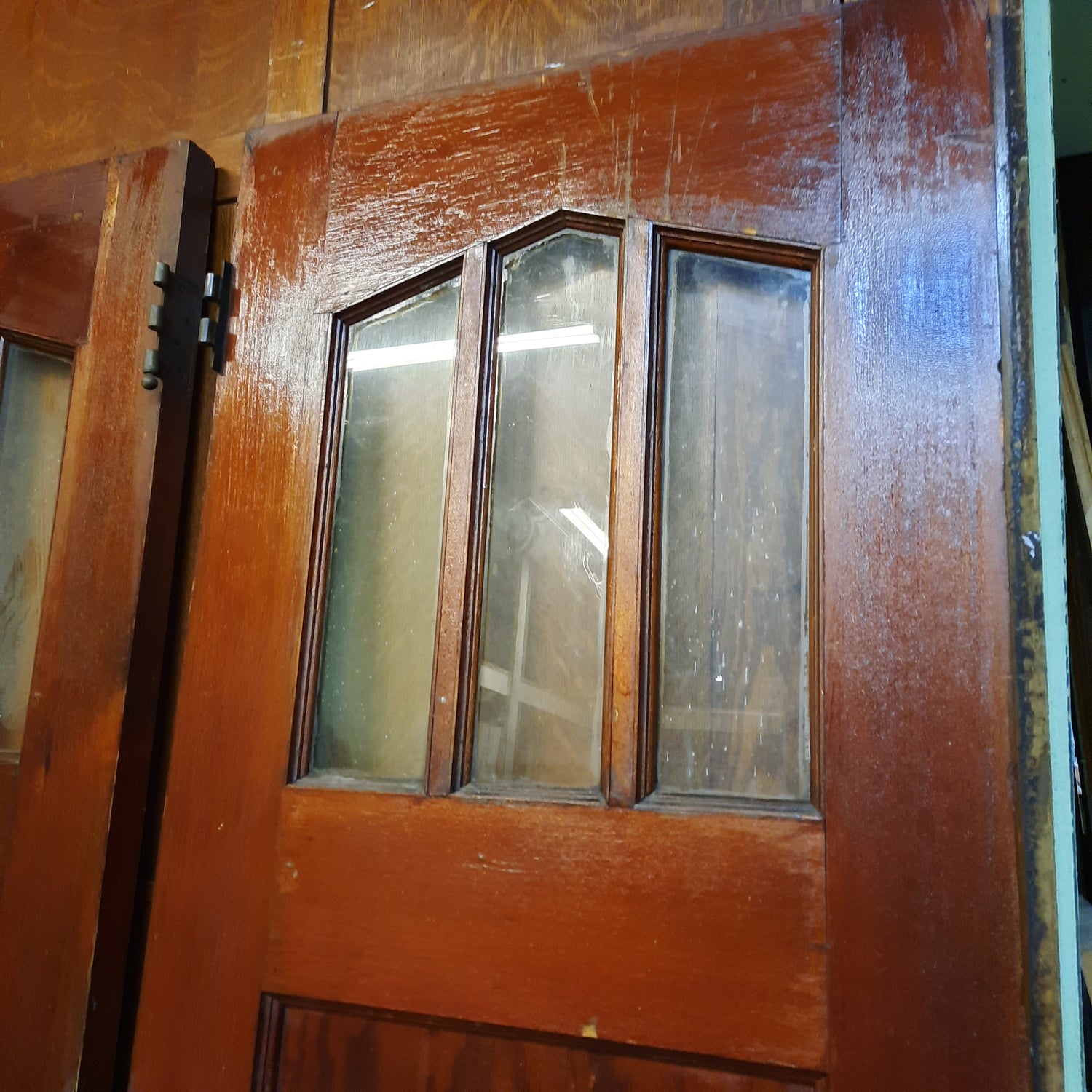 An eye catching pair of arched glass doors salvaged from an early 1900s church. These beautiful doors have an unusual glass pattern on the top and flat panels on the bottom and the size makes them perfect for diving up an interior space such as a living room from a dining room. The flat panels on the bottoms of each door are made from a thin (approx. 1/4") veneer and there are several spots that are cracked as pictured. These would be best used for interior doors due to the thinner bottom panels. The lock on the door is a small thumb turn latch as shown in the photos.