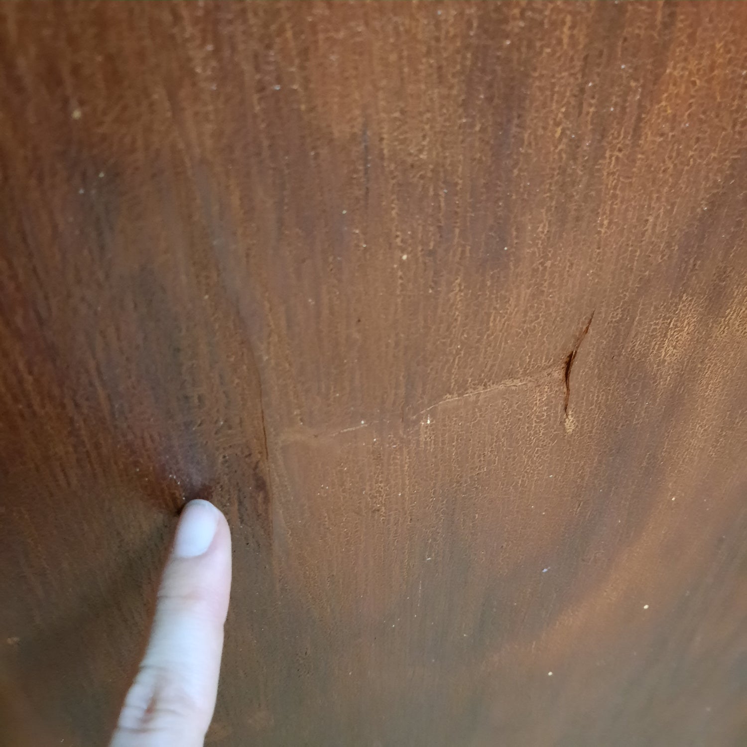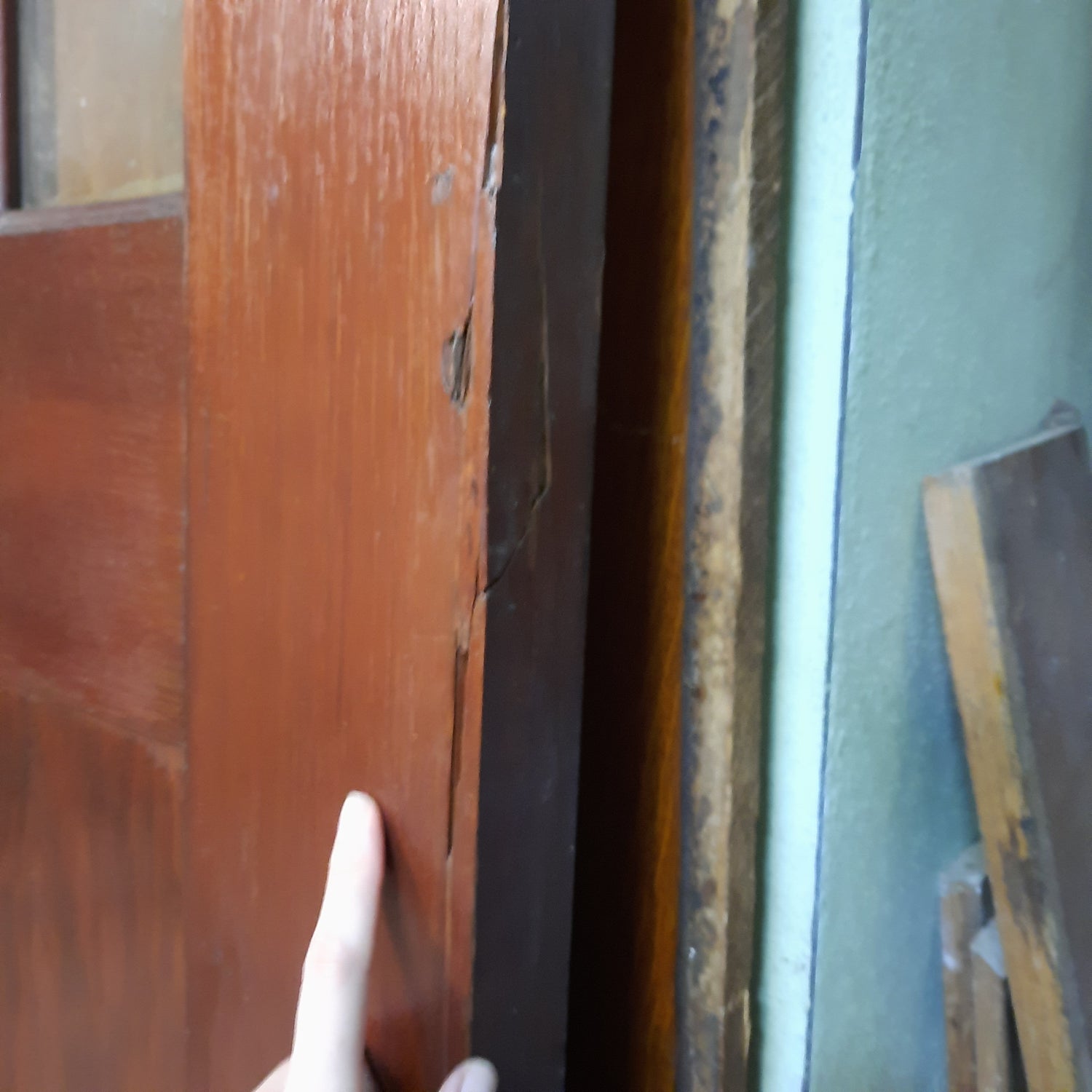 Each door measures 27 7/8, 83 3/4" tall, and 1 3/4" thick. There is an older repair on one outside edge of the door as highlighted in the photos. The crack is not by a hinge and will not affect the functioning or integrity of the set. Please see all of our pictures for details.