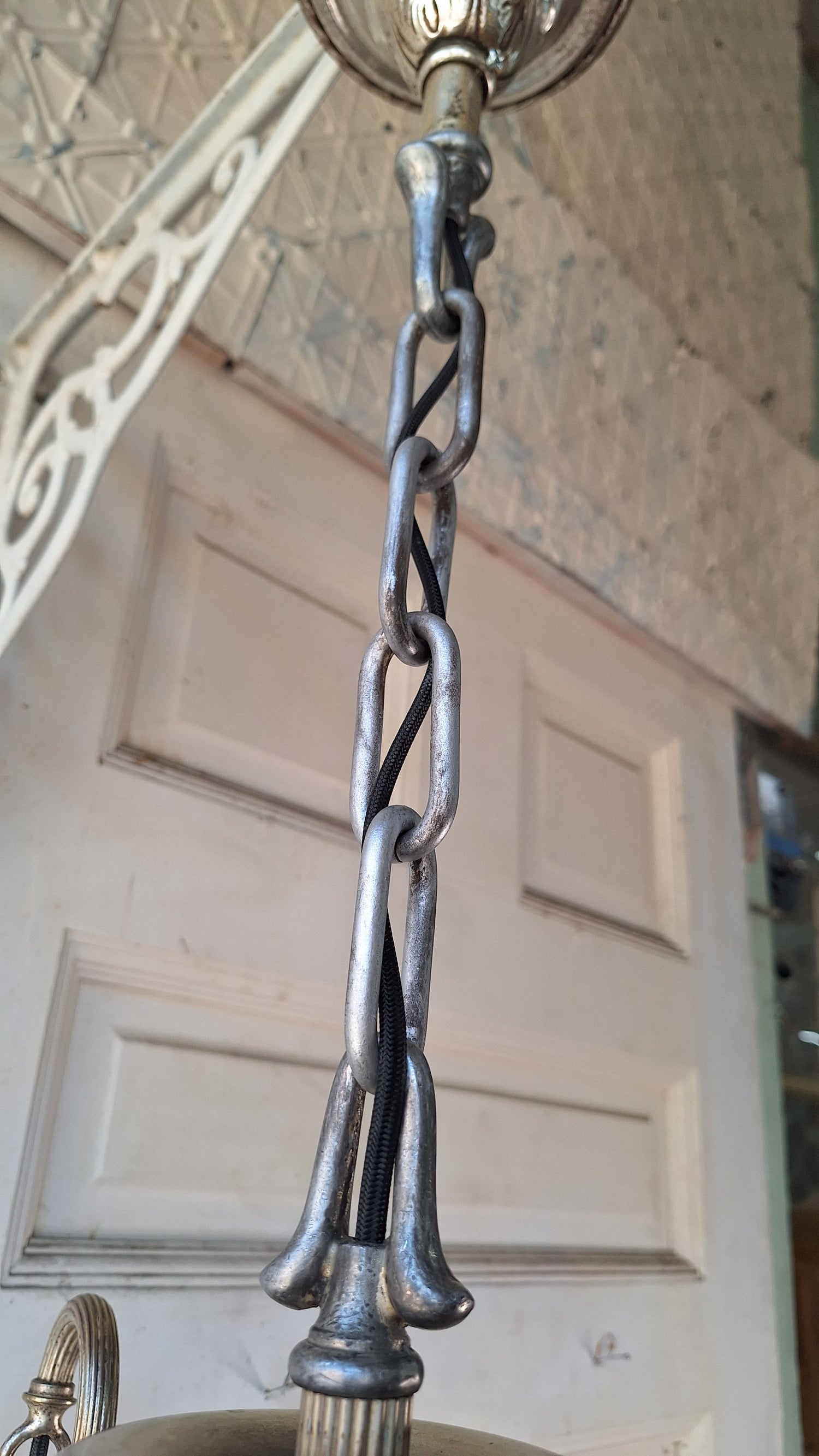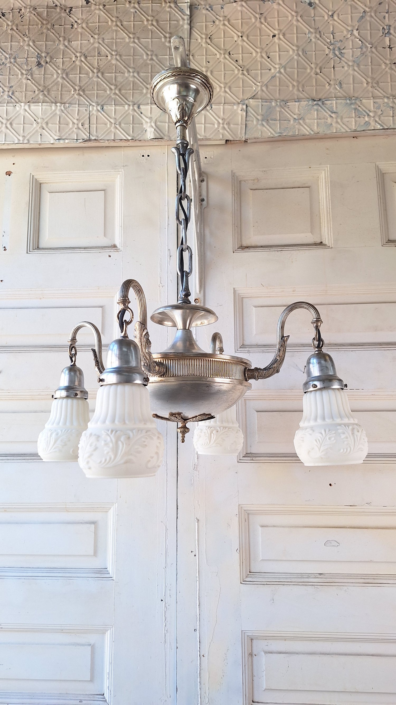 A large, silver plated chandelier with gorgeous frosted, white glass shades. This piece has been fully rewired and is ready to install. The shade fitters (socket covers) are new and have been refinished to color match the rest of the fixture. The antique chain has also been refinished to match the rest of the light. Please see all of our pictures for details. The silver finish is worn in several areas and the brass underneath can be seen.