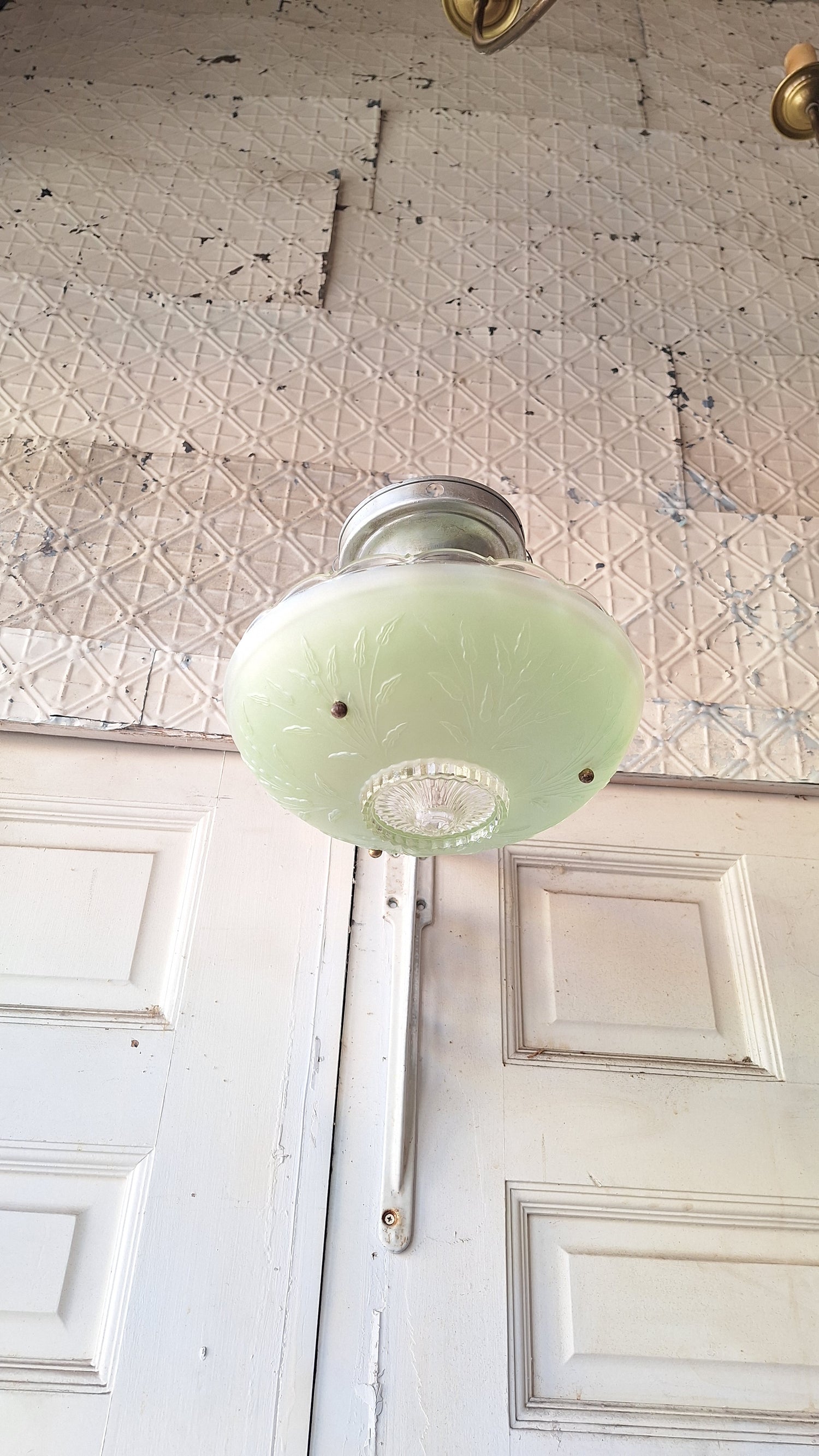 Vintage Green Glass Bowl Shade Three Chain Deco Light, Semi Flush Antique Light, Green Glass Vintage Light, Architectural Salvage 082601
