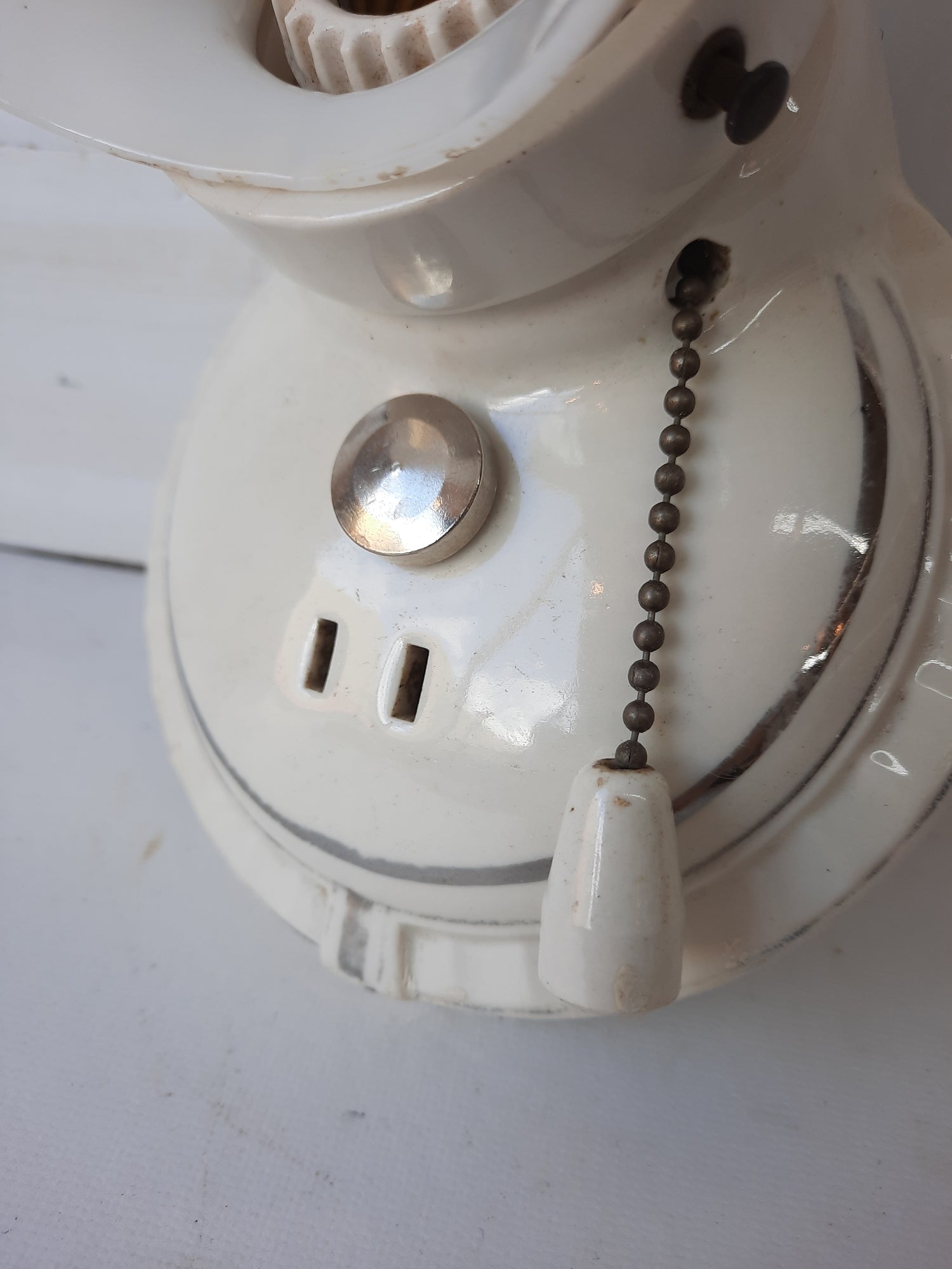 A charming porcelain pull-chain light with delicate glass 'shell' shades. The porcelain base is accented with a gleaming silver stripe along the edge. This light has been cleaned, rewired, and is ready for installation. It has been lightly cleaned although it still has some small remnants of paint on the base.