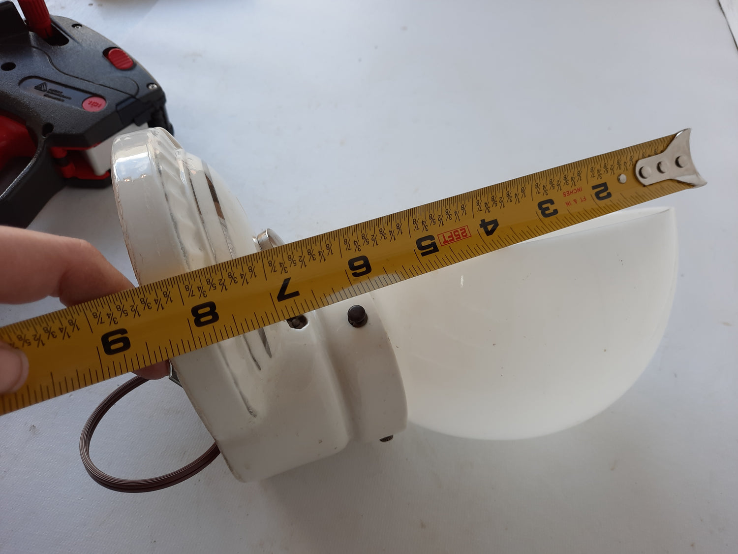 This light measures 8 1/2" out from the wall and the base is 5" wide. Please see all of our pictures for details. This light ships free within the continental US. No PO boxes please.