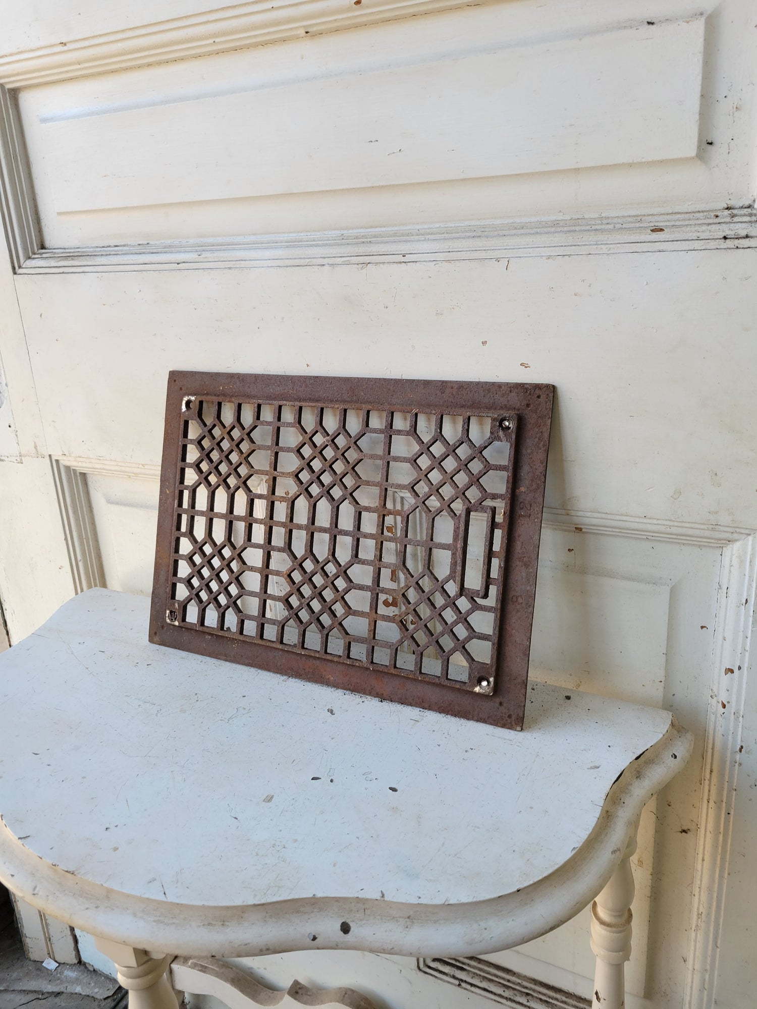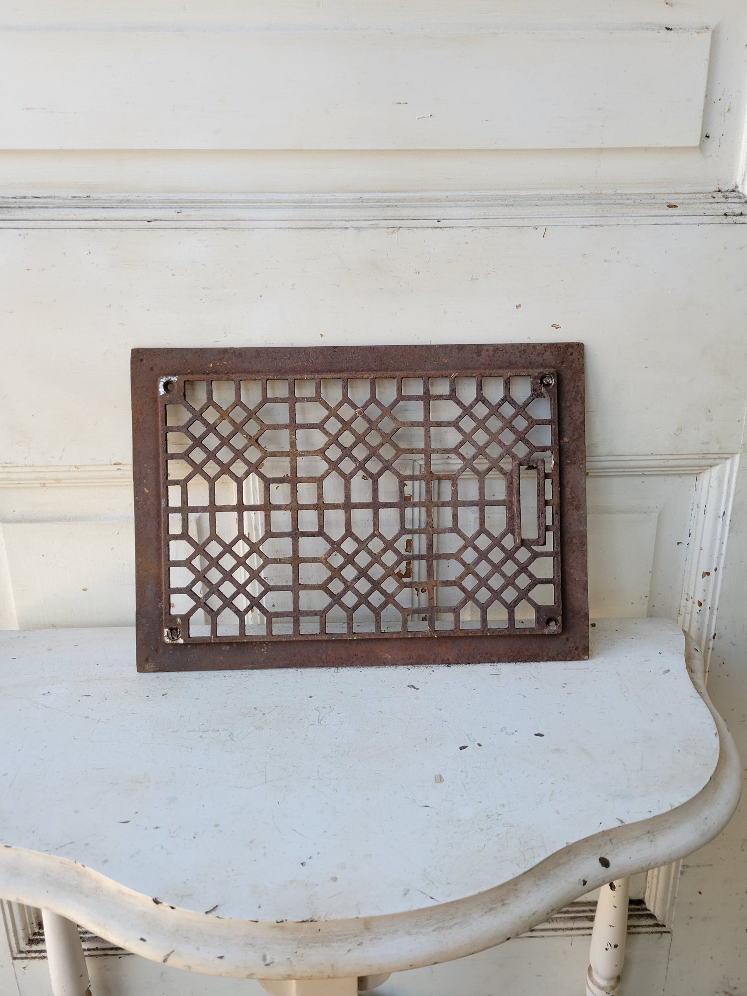 An elegant lattice design vent cover from the turn of the century. The iron is finished with black paint which is chippy as shown. This can be stripped off or cleaned up and painted over for a new look. The decorative grate cover can be used as a trivet, wall art, doormat, and more.