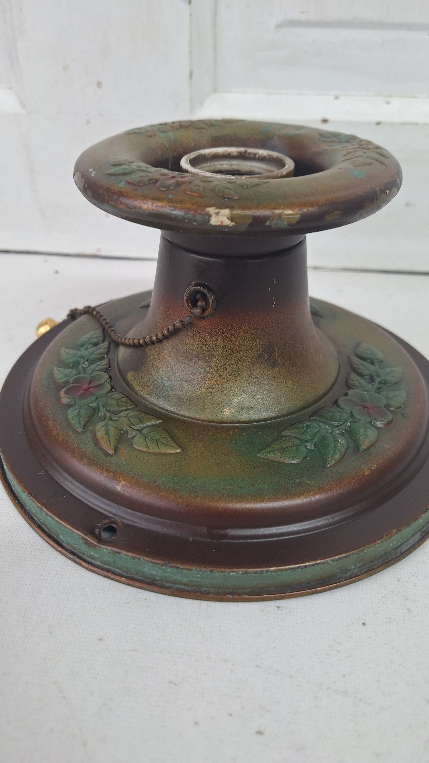 This beautiful flush mount light features a polychrome painted finish over stamped brass and gorgeous rose detailing. The finish has been sealed to bring our the beautiful colors of the design. This light has been rewired and is ready to install; pull chain is in working condition. Please see all of our pictures for details. The edge around the socket is crimped in one area as shown and the painted finish is worn in a few areas.