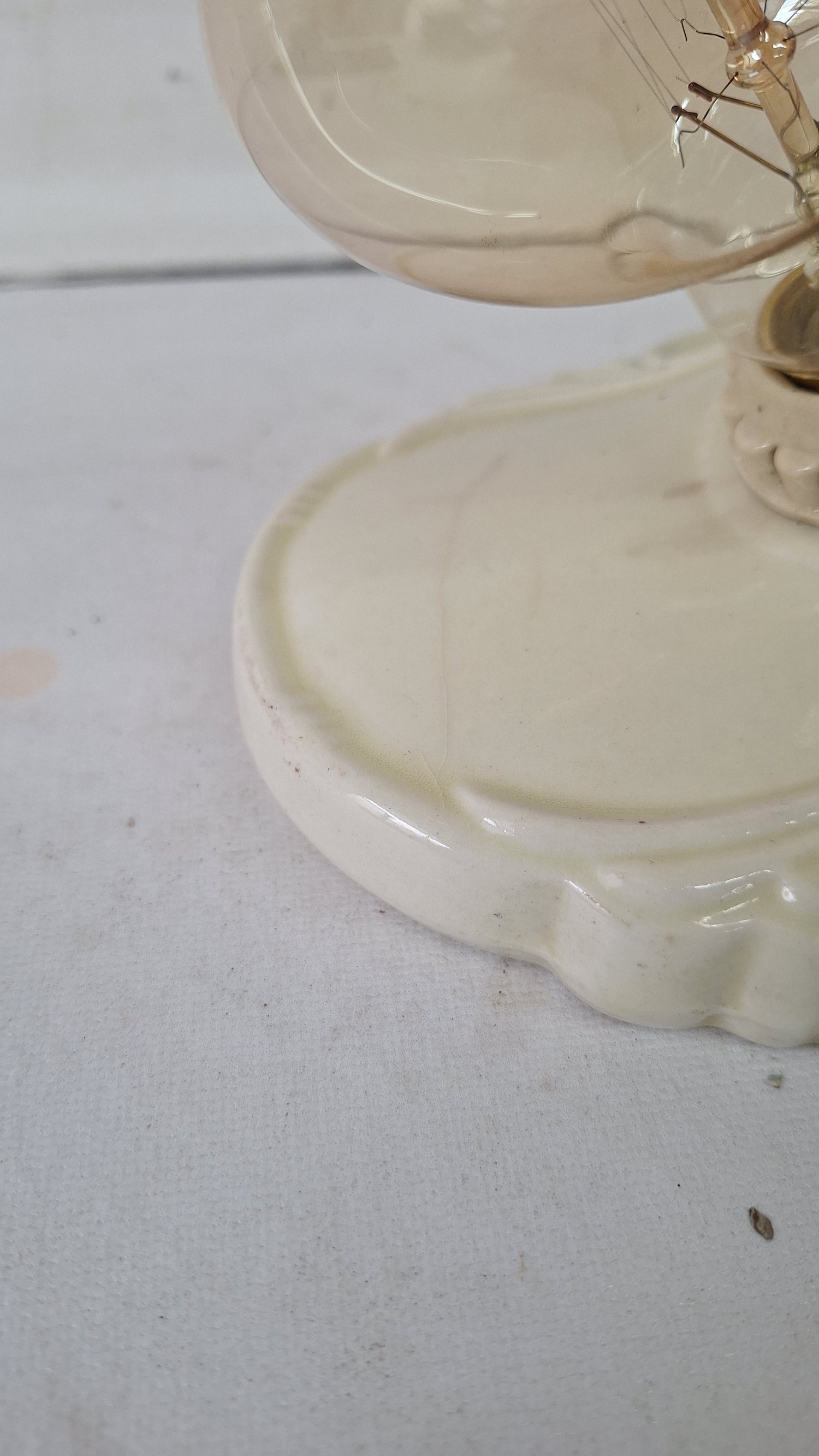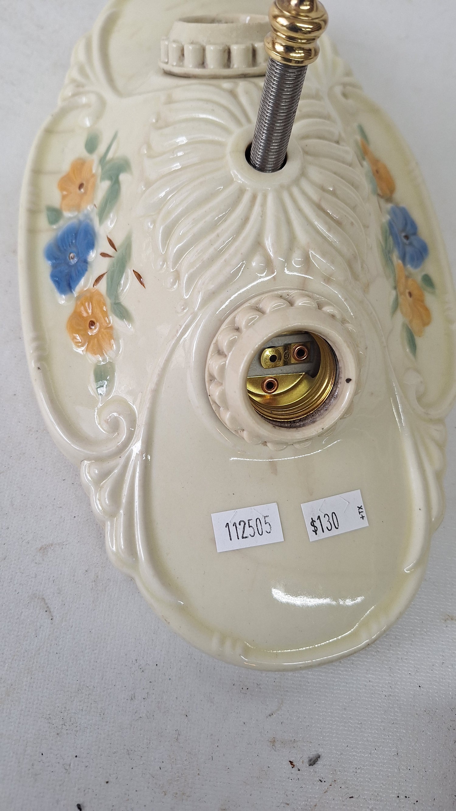 A gorgeous two bulb porcelain light with delicate pink and green floral detailing. This light combines the best of both worlds with whimsically colored flowers and a streamlined Art Deco shape. The wiring and sockets are all new and this piece is ready to install. It comes with the bracket for hanging as well. It is in excellent shape, free from cracks or chips in the porcelain. There is distinct crazing in the glaze as pictured and small areas of discoloration from age.