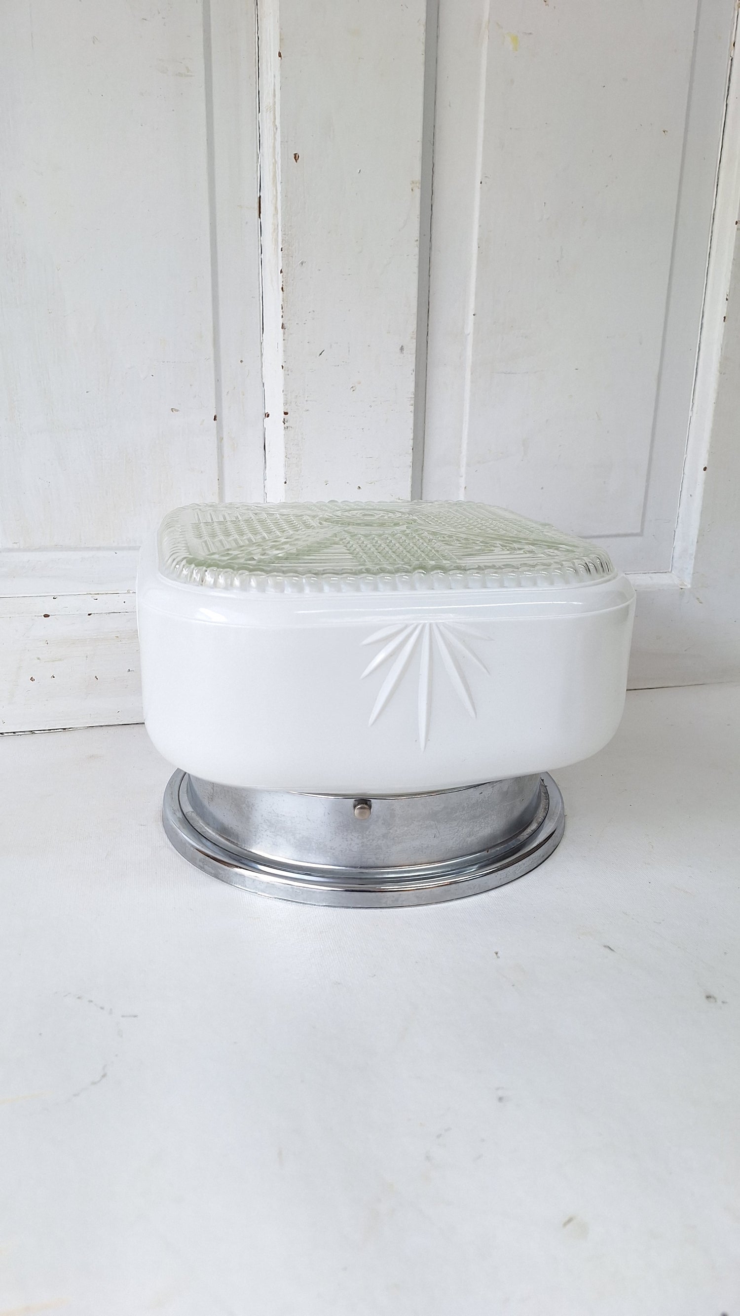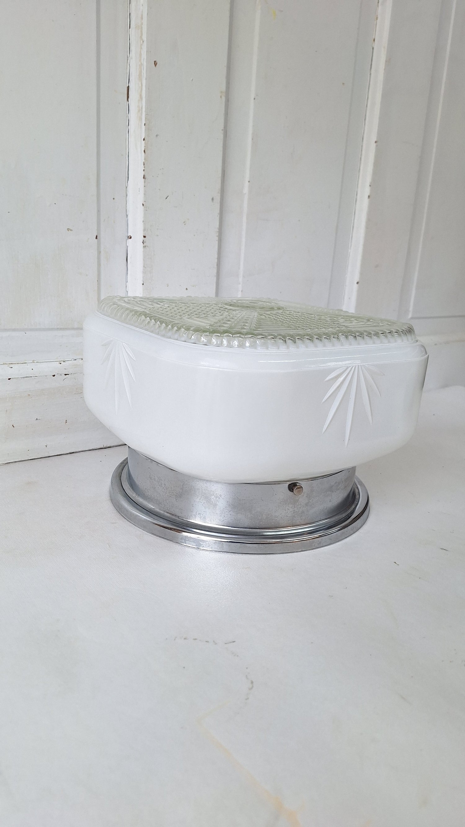 A simple vintage ceiling light with a two tone finish on the glass and starburst accents. The molded glass on this piece has a great sparkle to it with a bright chrome base. It has been rewired and is ready for installation. The light contains two standard size sockets. There are some very small imperfections in the white finish and chrome of the base, but this light is in otherwise excellent condition.