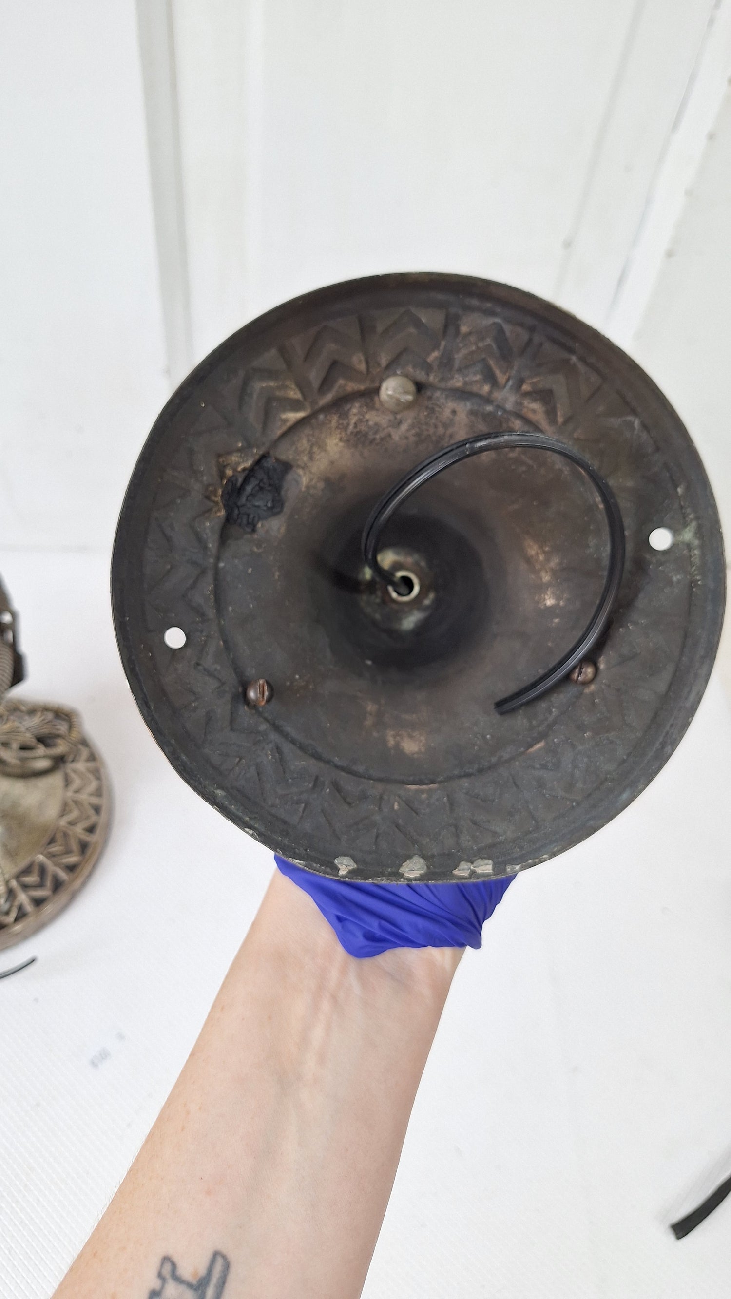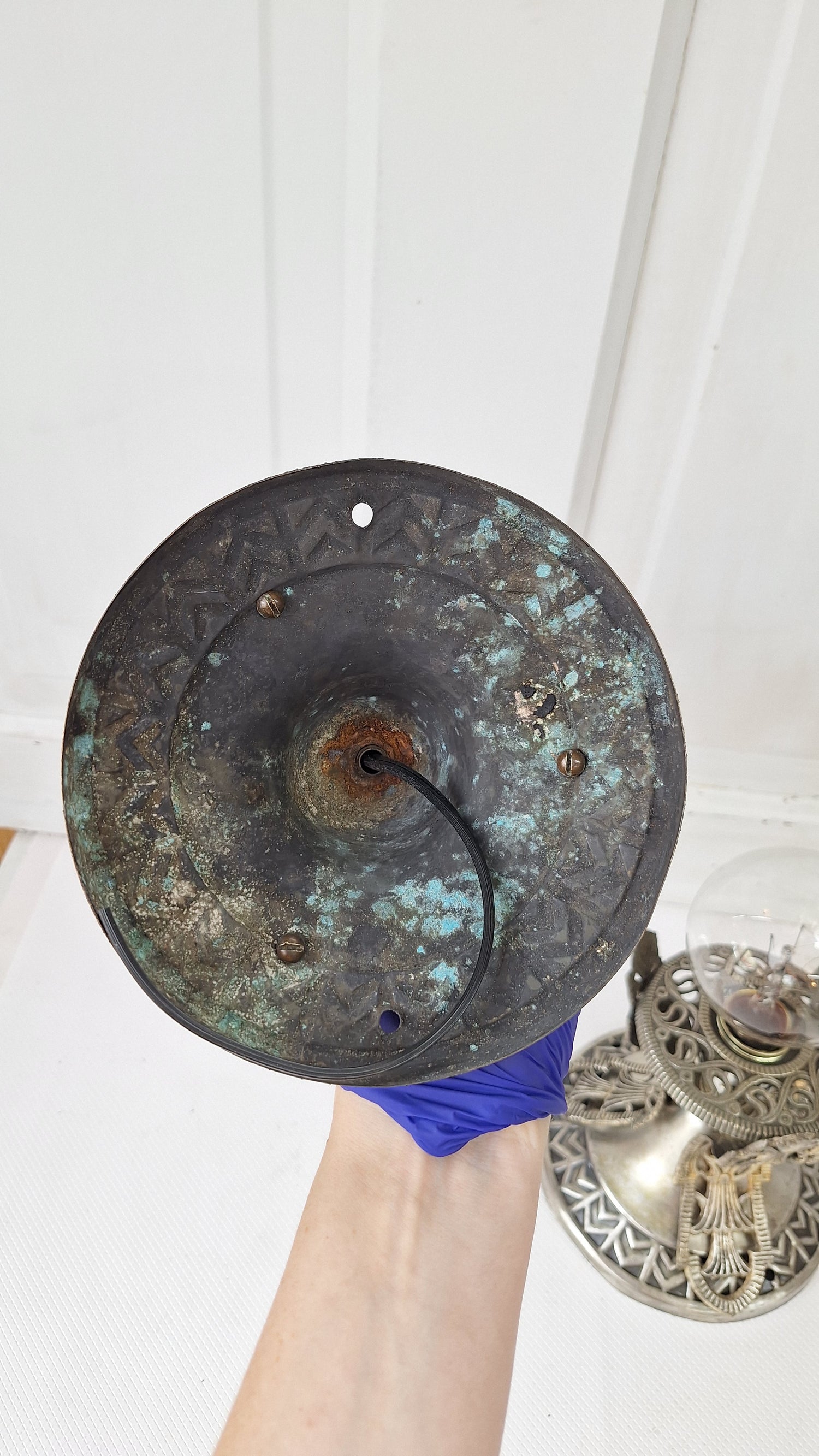 A pair of beautiful cast bronze ceiling lights with a nickel plated finish. This pair has been cleaned, rewired, and is ready for installation. Purchase does not include light bulbs. Please see all of our pictures for details.
