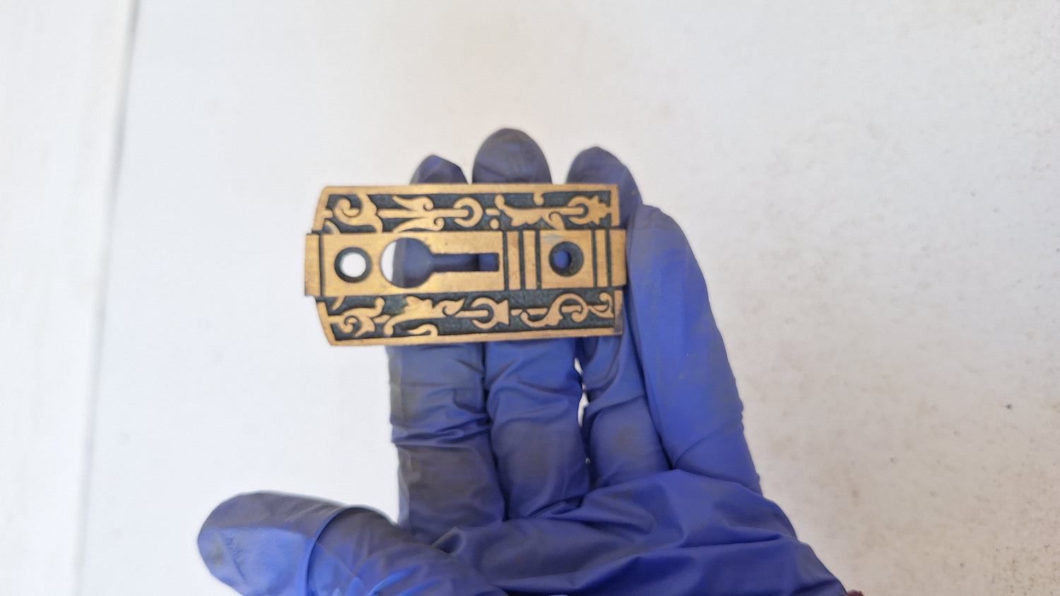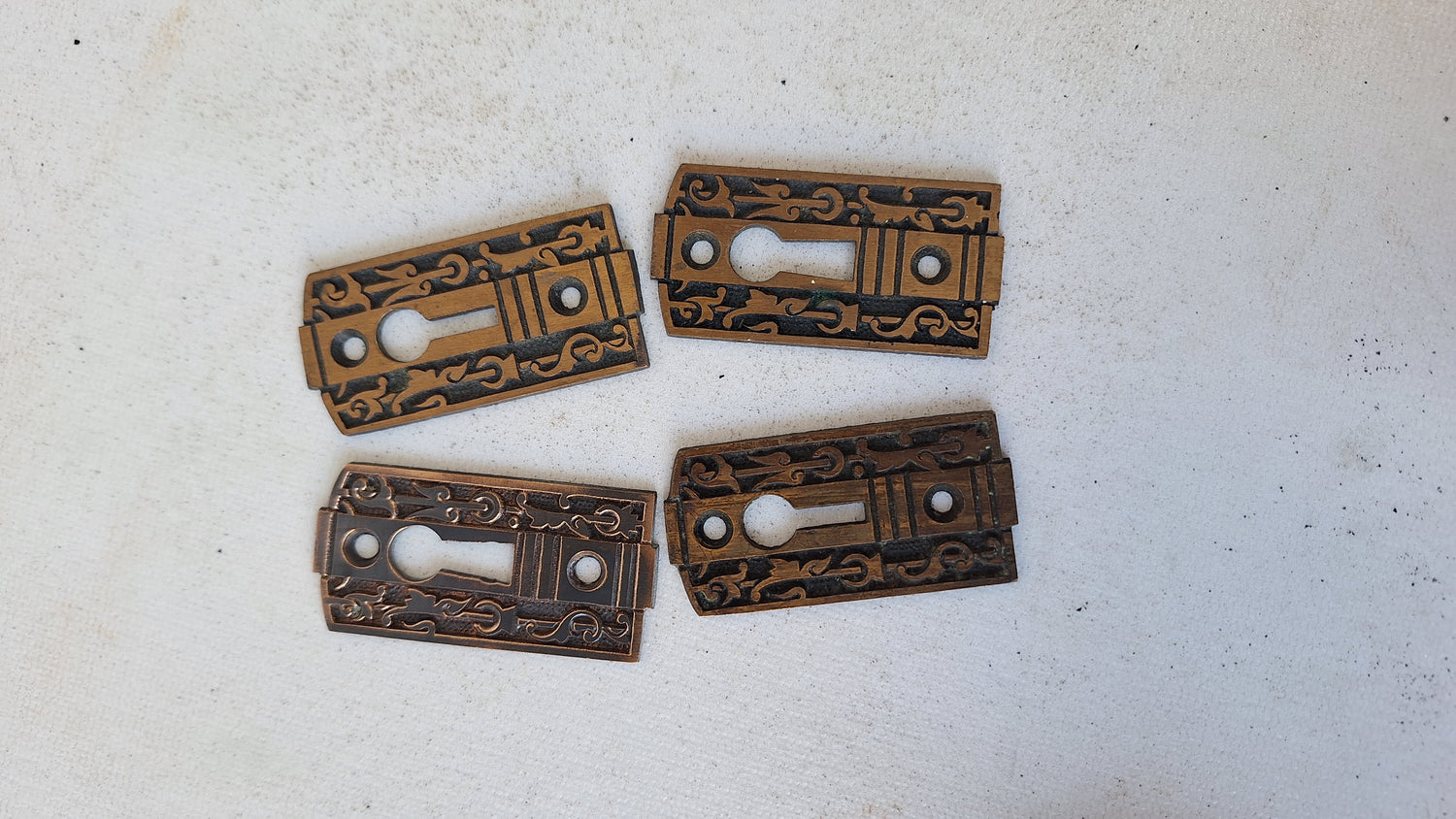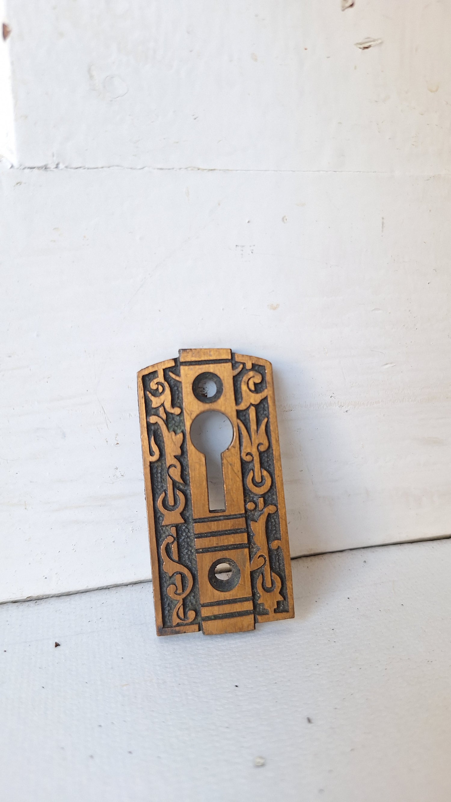 A gorgeous bronze keyhole escutcheon with ornate design on a dark background. Each of these unusually shaped keyholes is in excellent condition although patina will vary as shown. These are perfect for door restorations, but also make wonderful jewelry pieces as well.