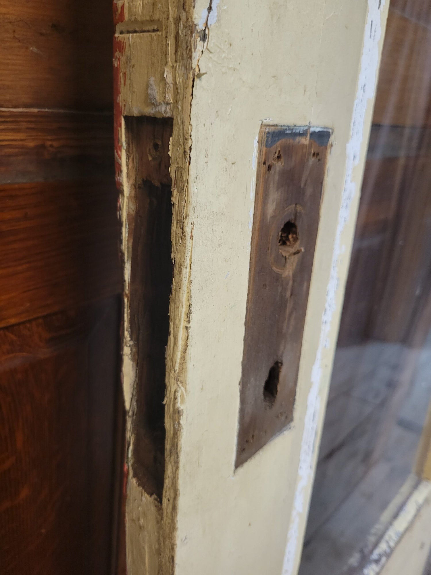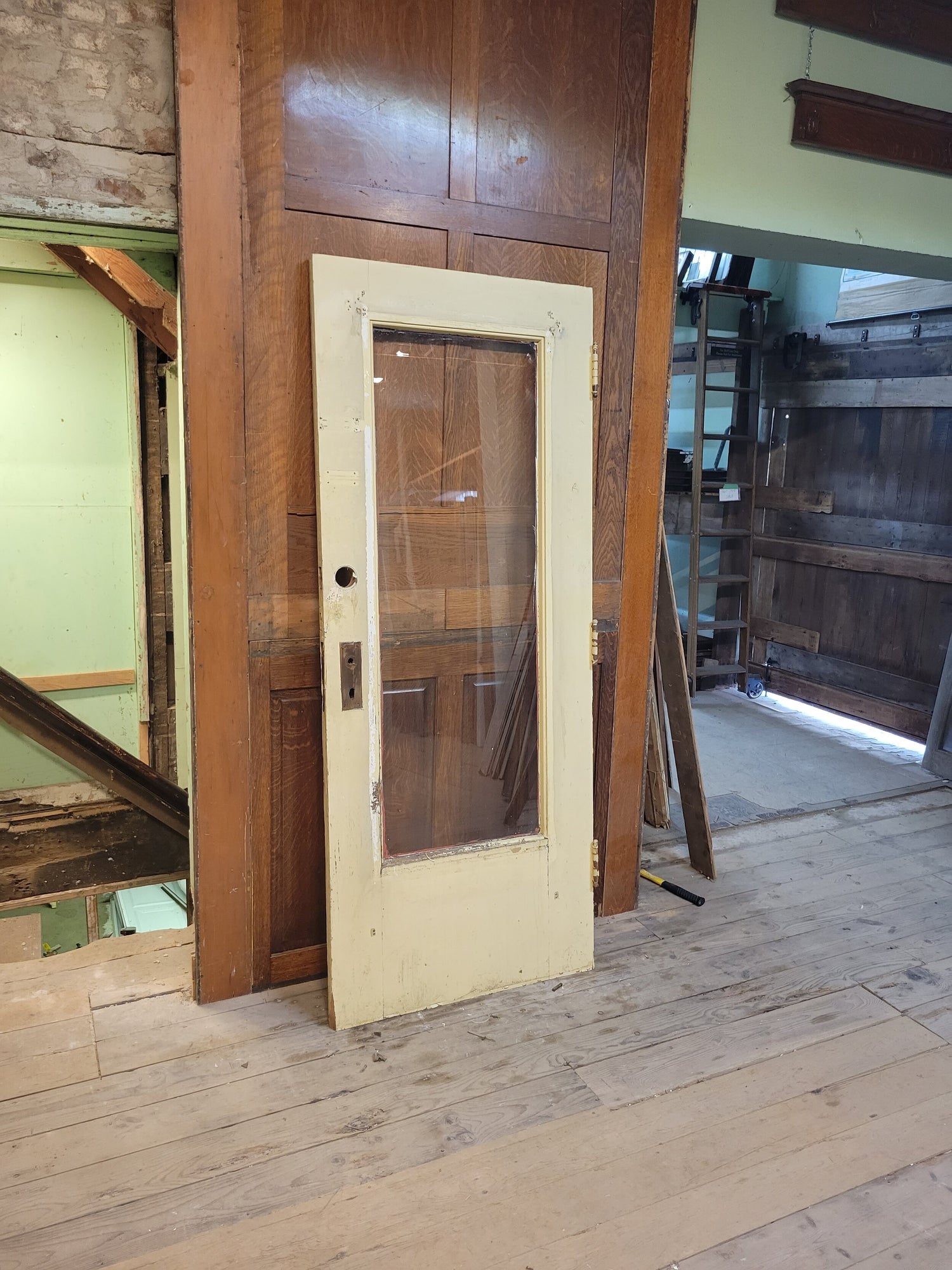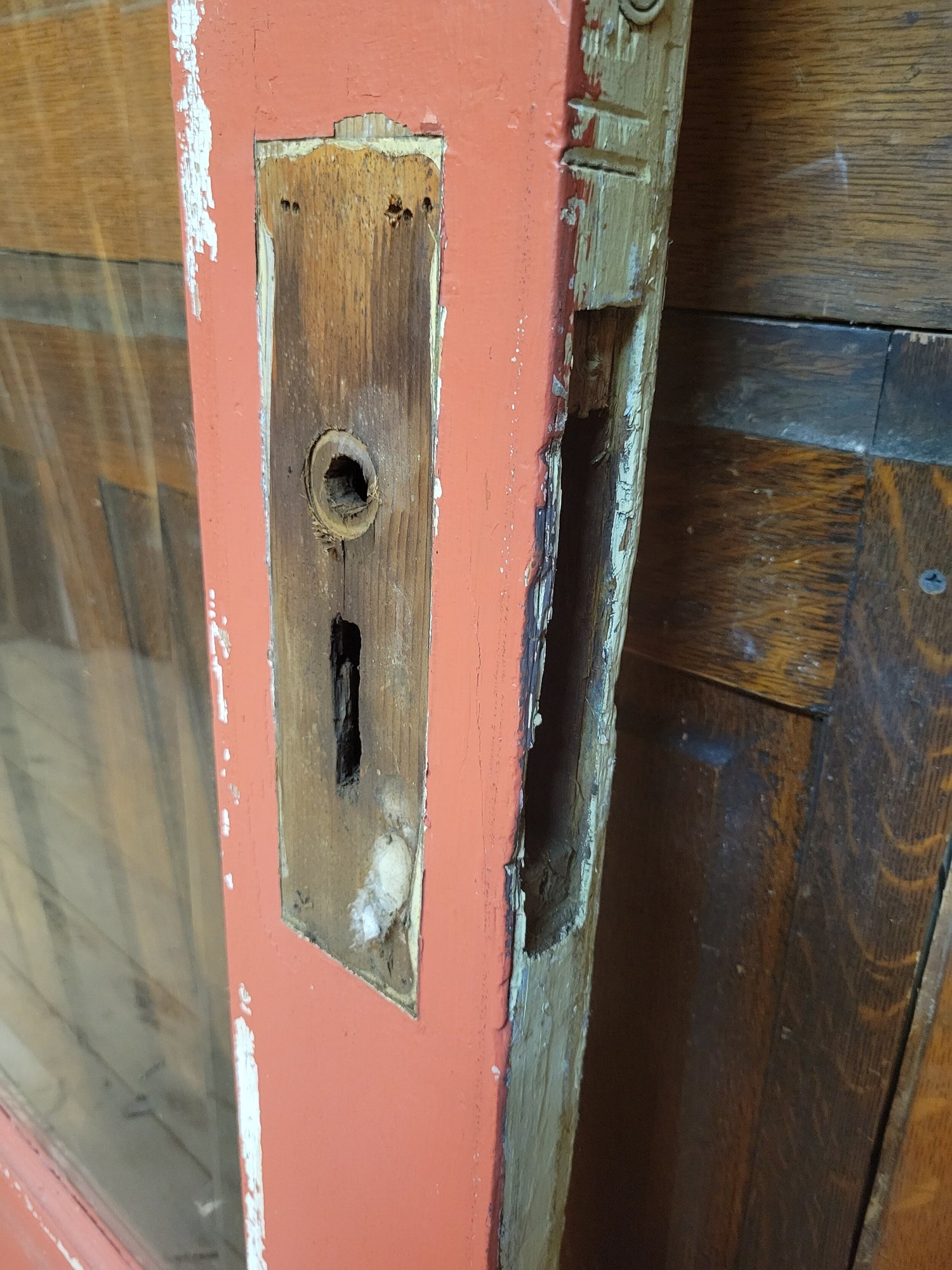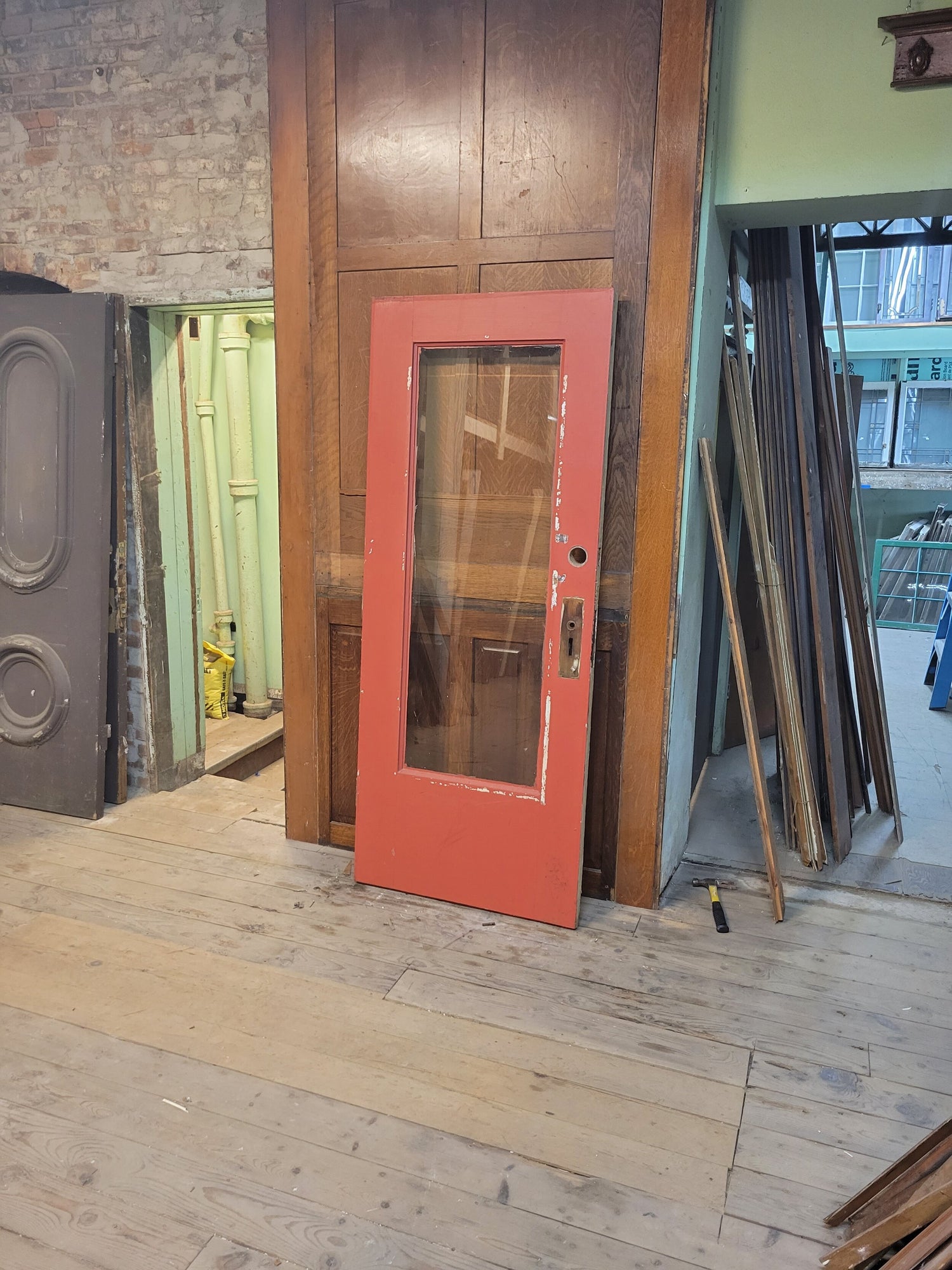 This Victorian era door measures 31 5/8" wide by 78 1/8" tall by 1 3/4" deep. There is paint around the edges of the glass on the exterior (red) side as shown. There are also signs of wear such as scrapes and scratches around the outside edges of the door; particularly on the mortise lock edge.
