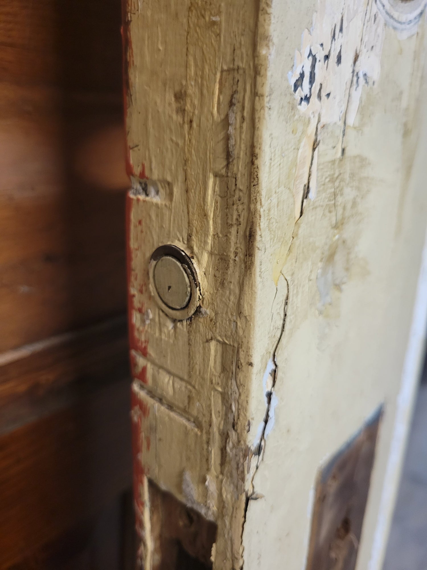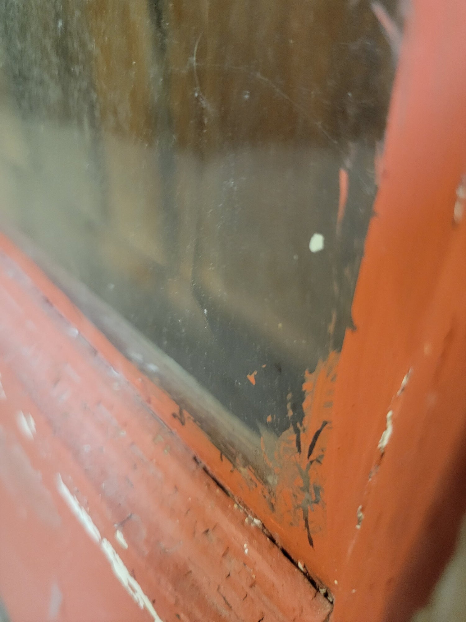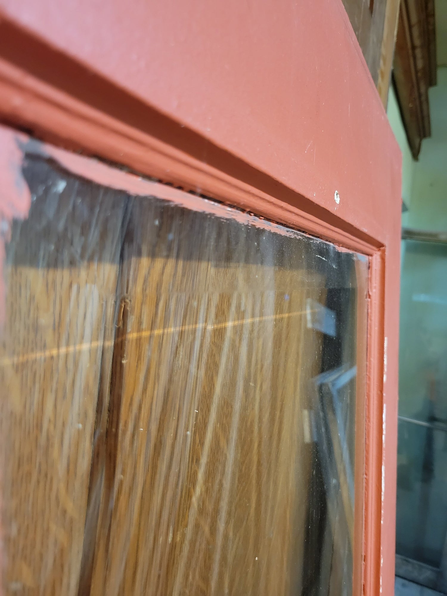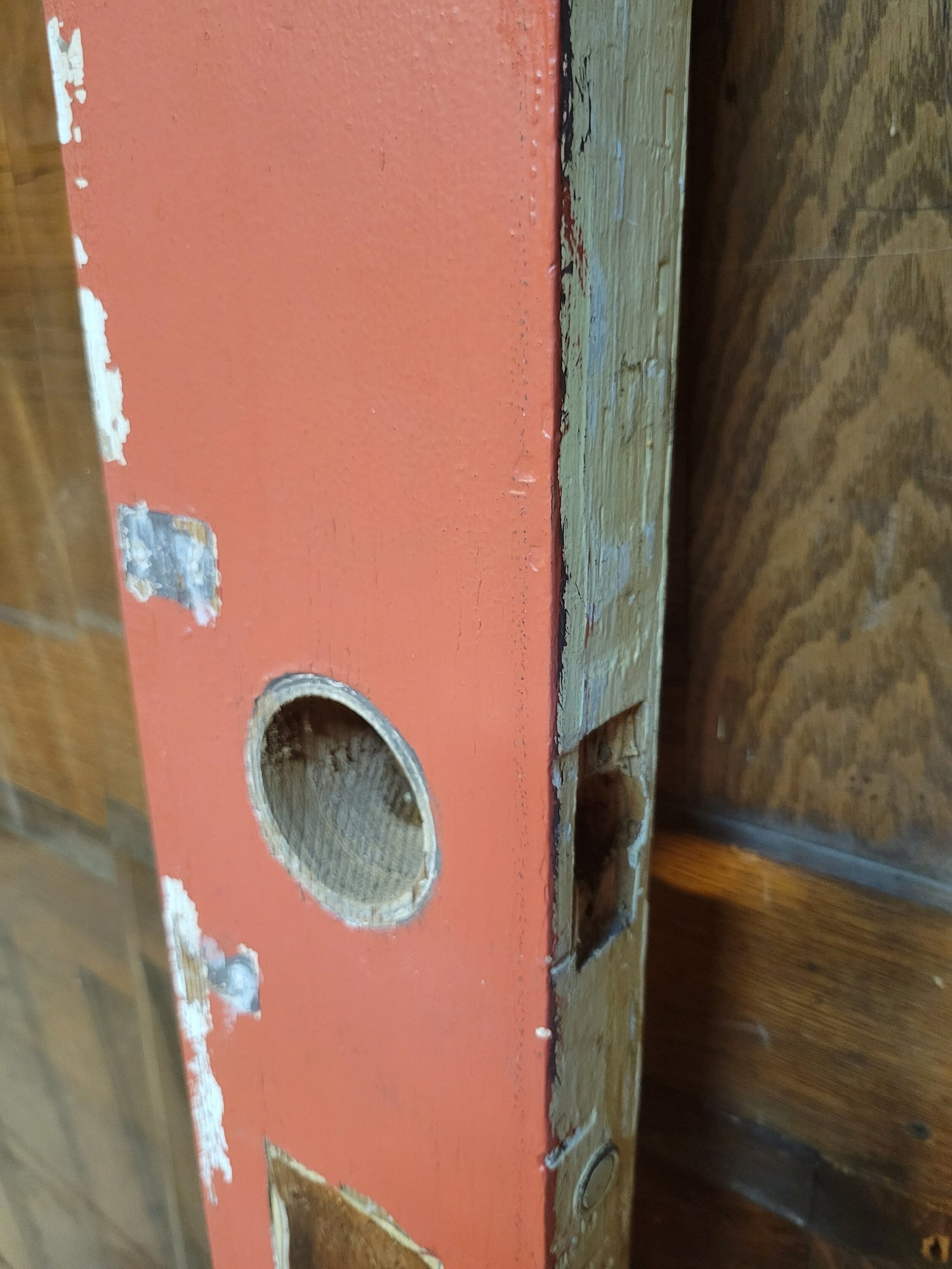 This Victorian era door measures 31 5/8" wide by 78 1/8" tall by 1 3/4" deep. There is paint around the edges of the glass on the exterior (red) side as shown. There are also signs of wear such as scrapes and scratches around the outside edges of the door; particularly on the mortise lock edge.