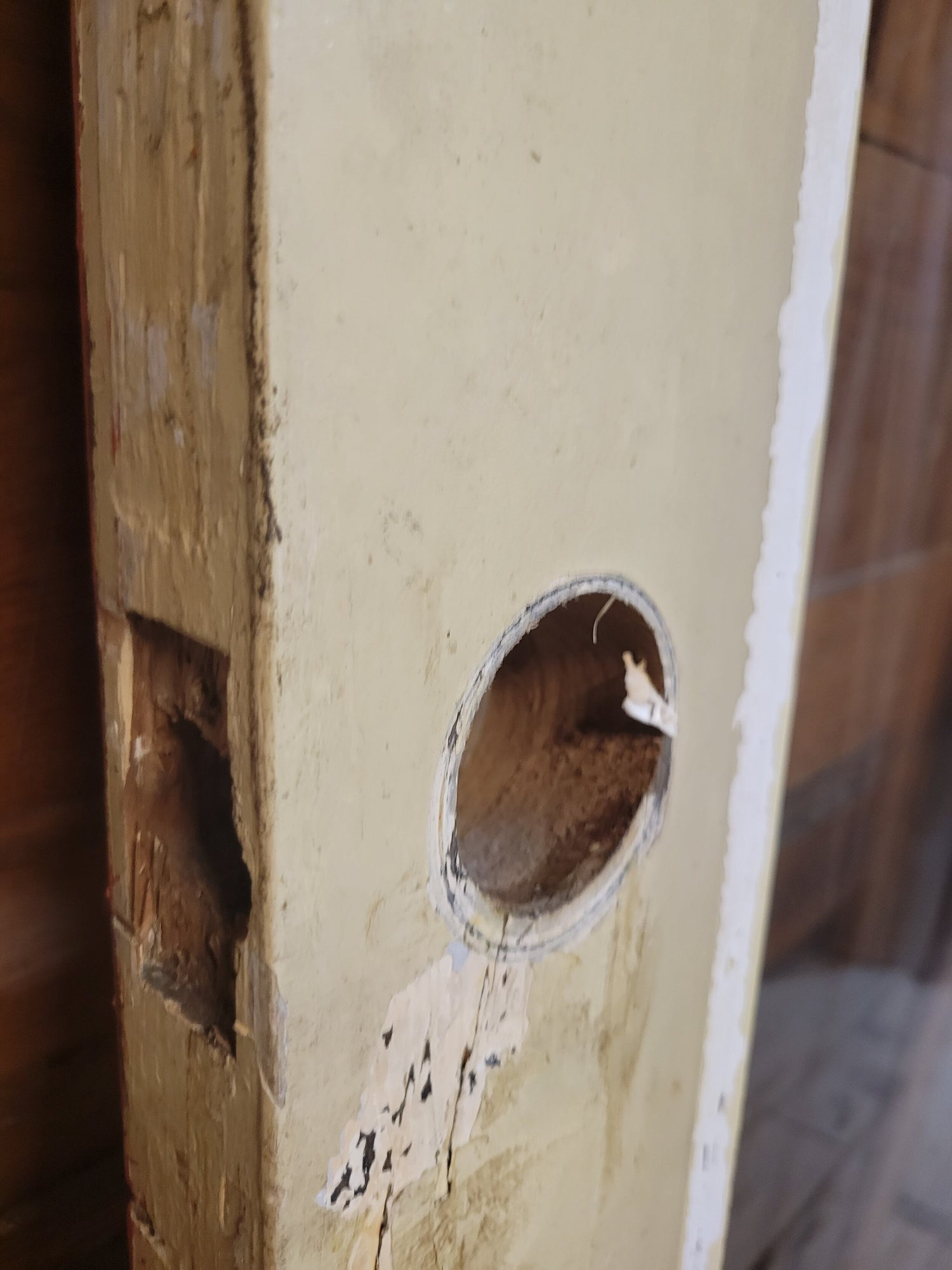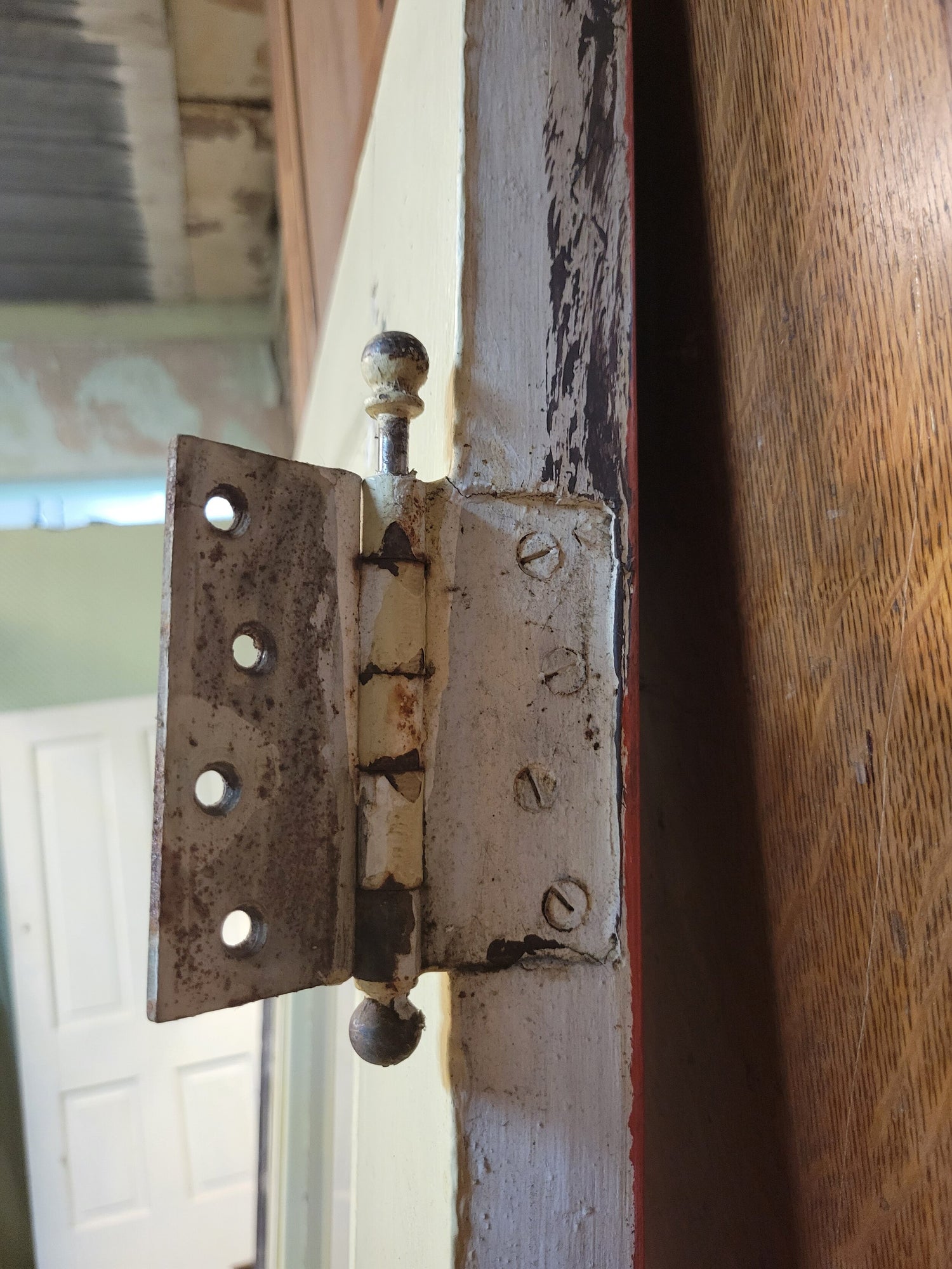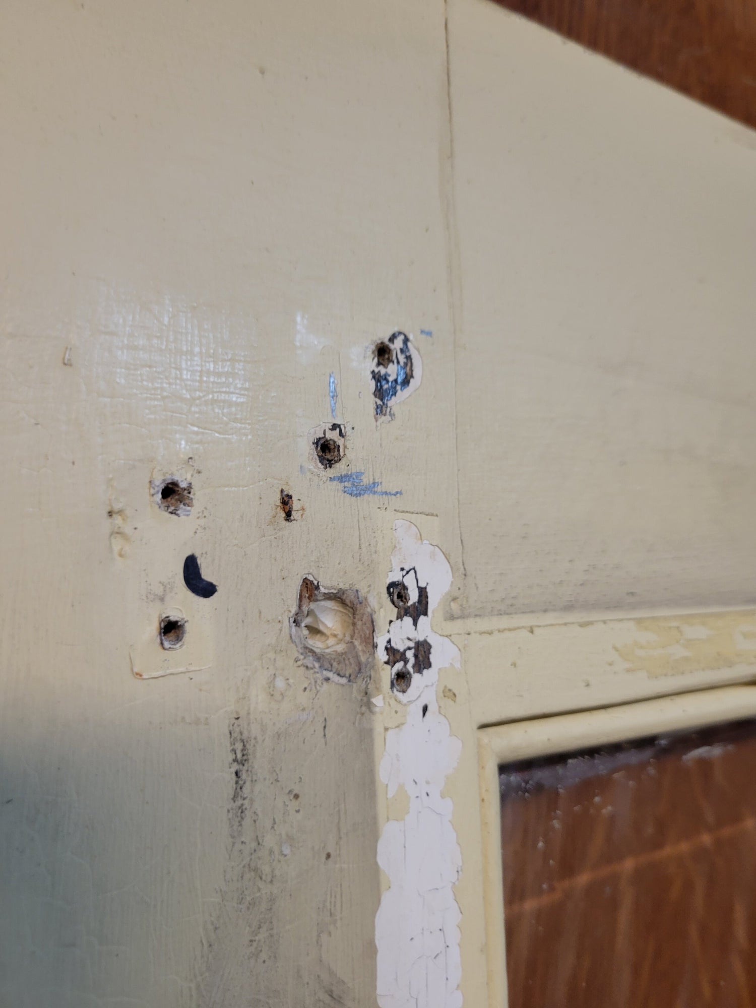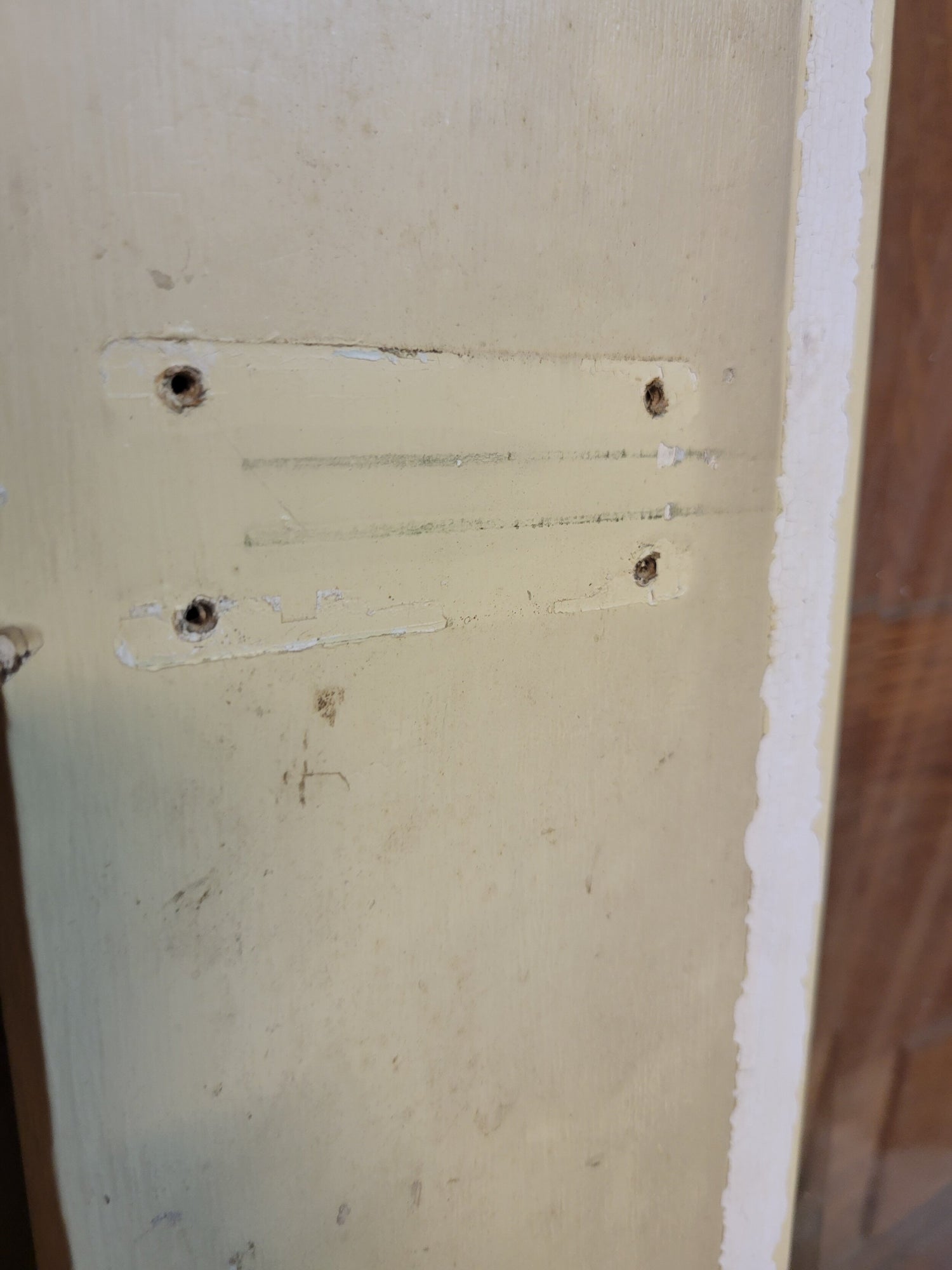 This Victorian era door measures 31 5/8" wide by 78 1/8" tall by 1 3/4" deep. There is paint around the edges of the glass on the exterior (red) side as shown. There are also signs of wear such as scrapes and scratches around the outside edges of the door; particularly on the mortise lock edge.