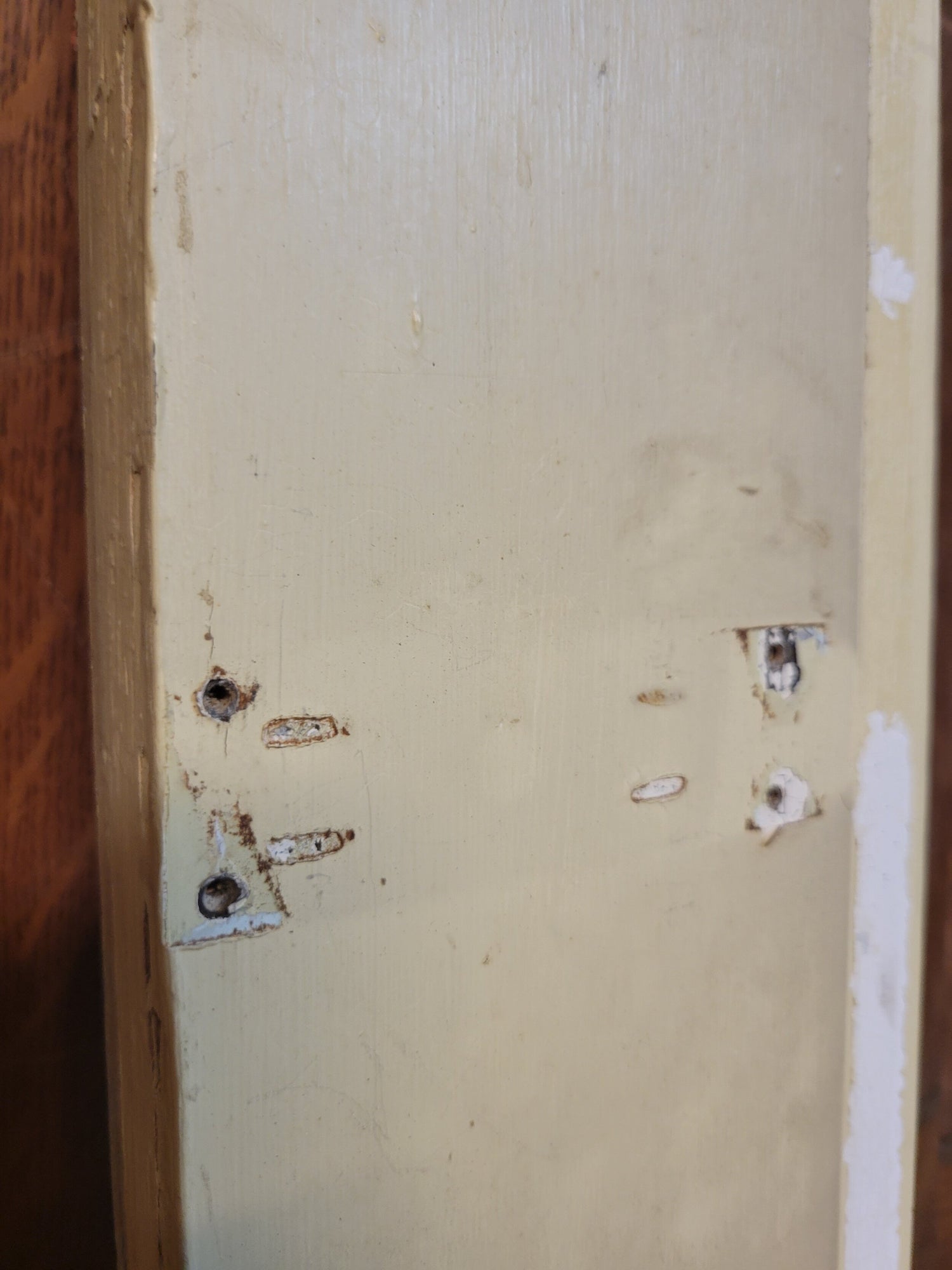 A stately antique beveled glass door from a mid 1800s home. This door was originally an exterior door of the home and was salvaged prior to demolition. it has a gorgeous, full glass pane with a beveled edge and a solid wood frame. The exterior is a bright orange-red and the interior is an off-white or beige color. There are marks along the edges which is typical for a door of this age and small holes around the wood near the corners of the glass where curtain hardware had been installed. A hole for a deadbolt has been cut in as shown in the photos, however, no hardware is included with this set except for the hinges. Please be sure to see all of our pictures for details and close ups of the door.