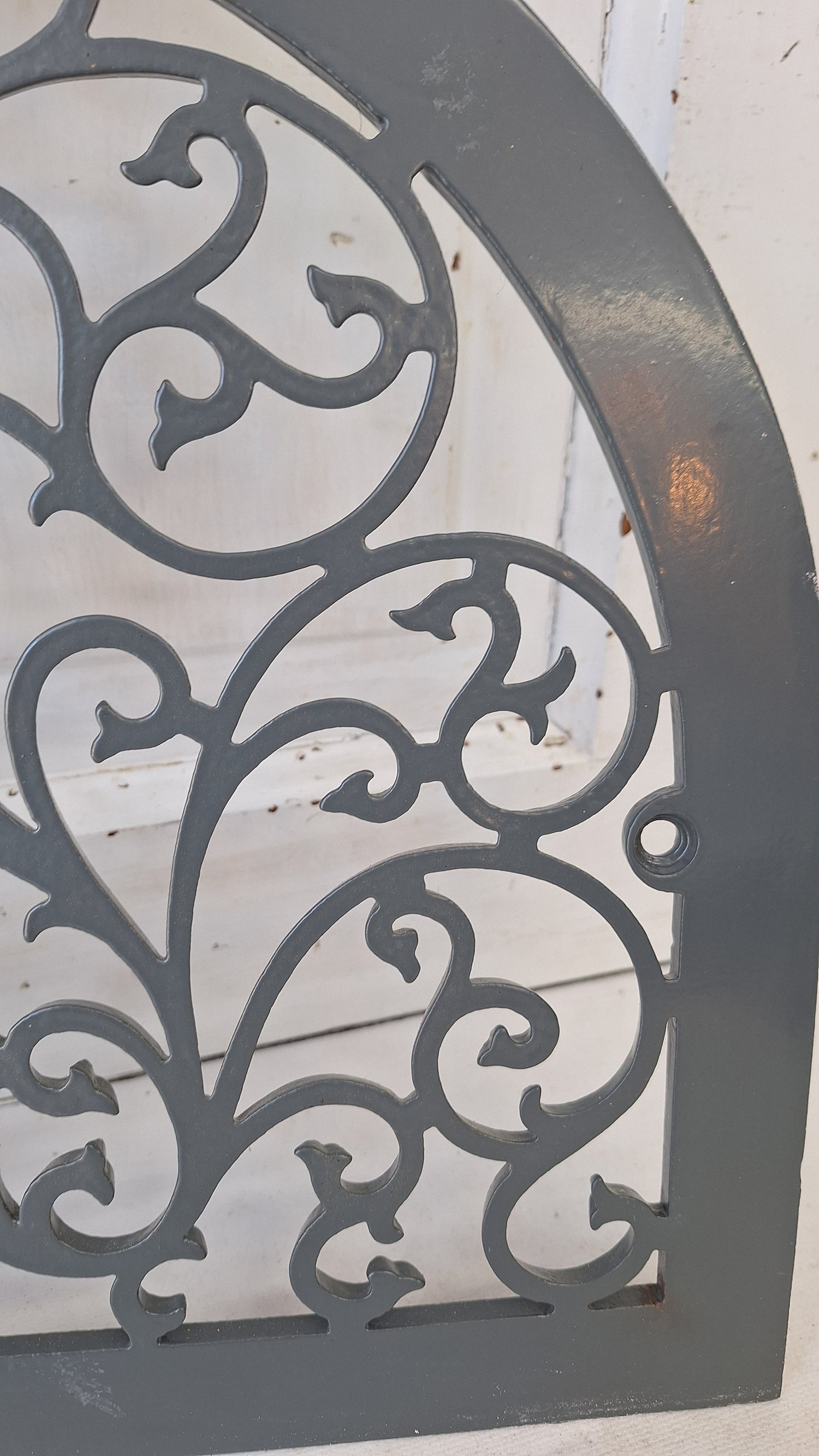 A gorgeous antique vent cover from the turn of the century with an arched top and ornate open design. This piece has been painted a dark gray and is fair condition with a crack in the top section as shown. This design is intended for use on a wall.