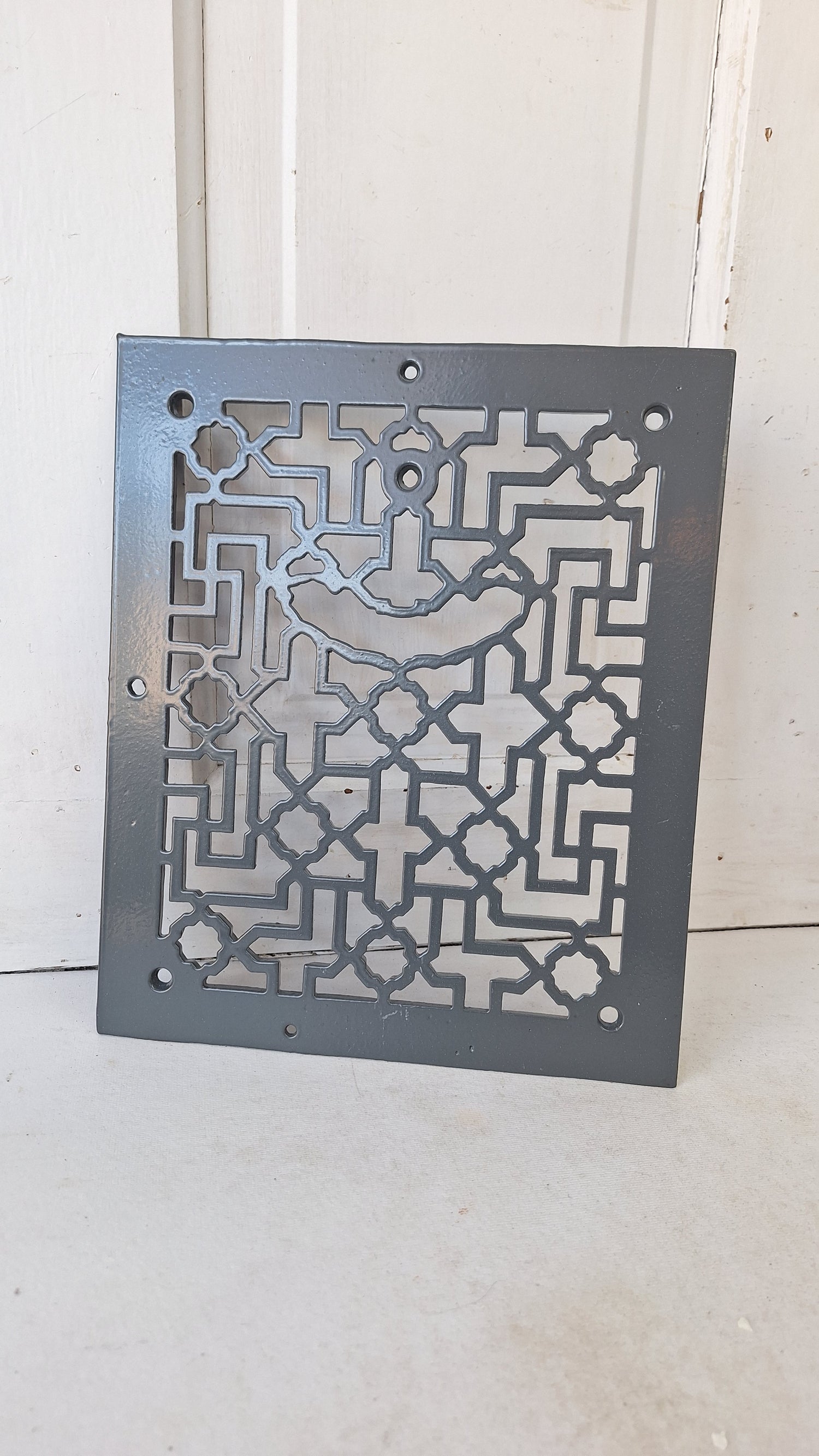 An elegant lattice design vent cover from the turn of the century. This piece is painted in a semi gloss gray and is in excellent condition.