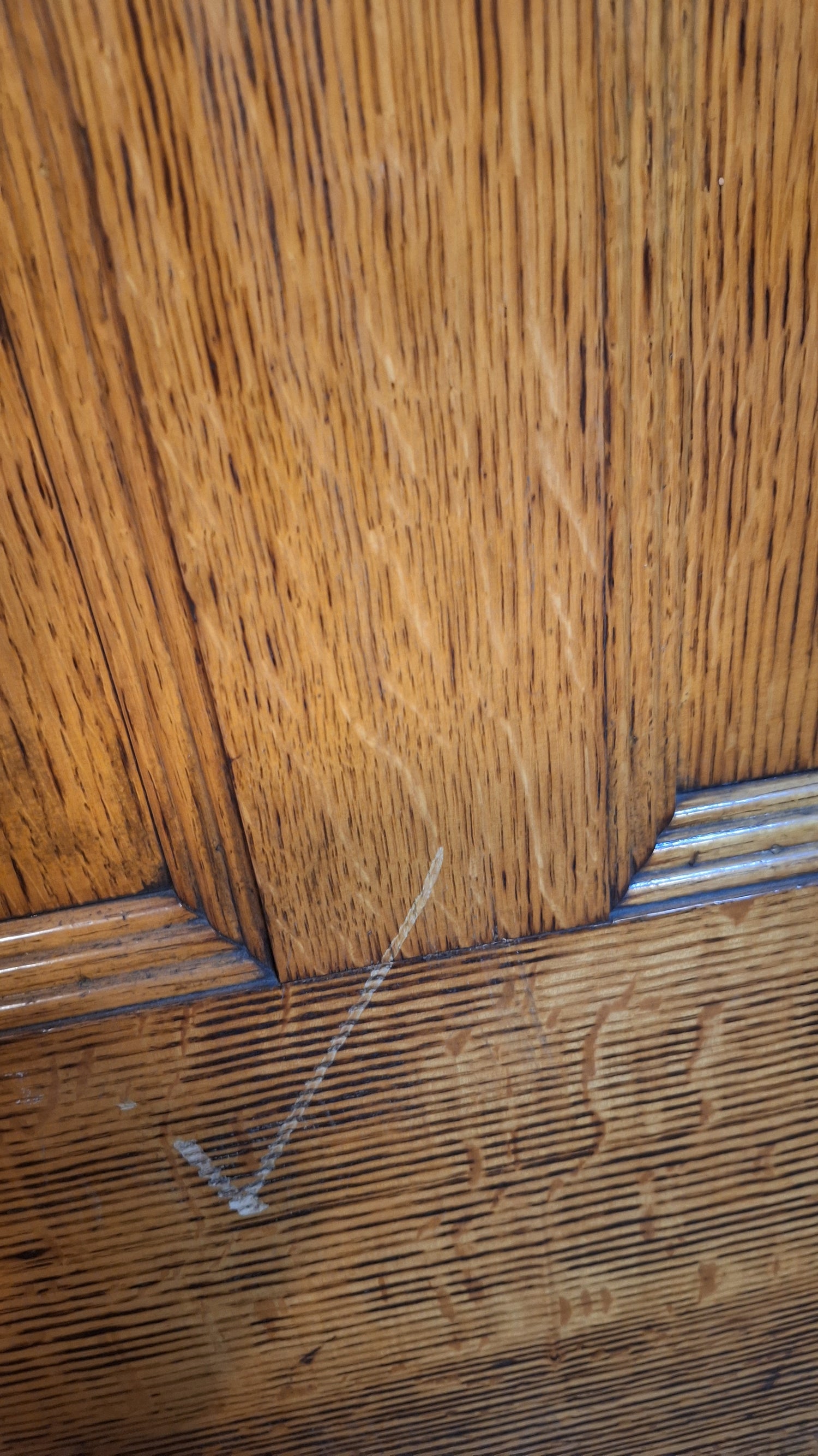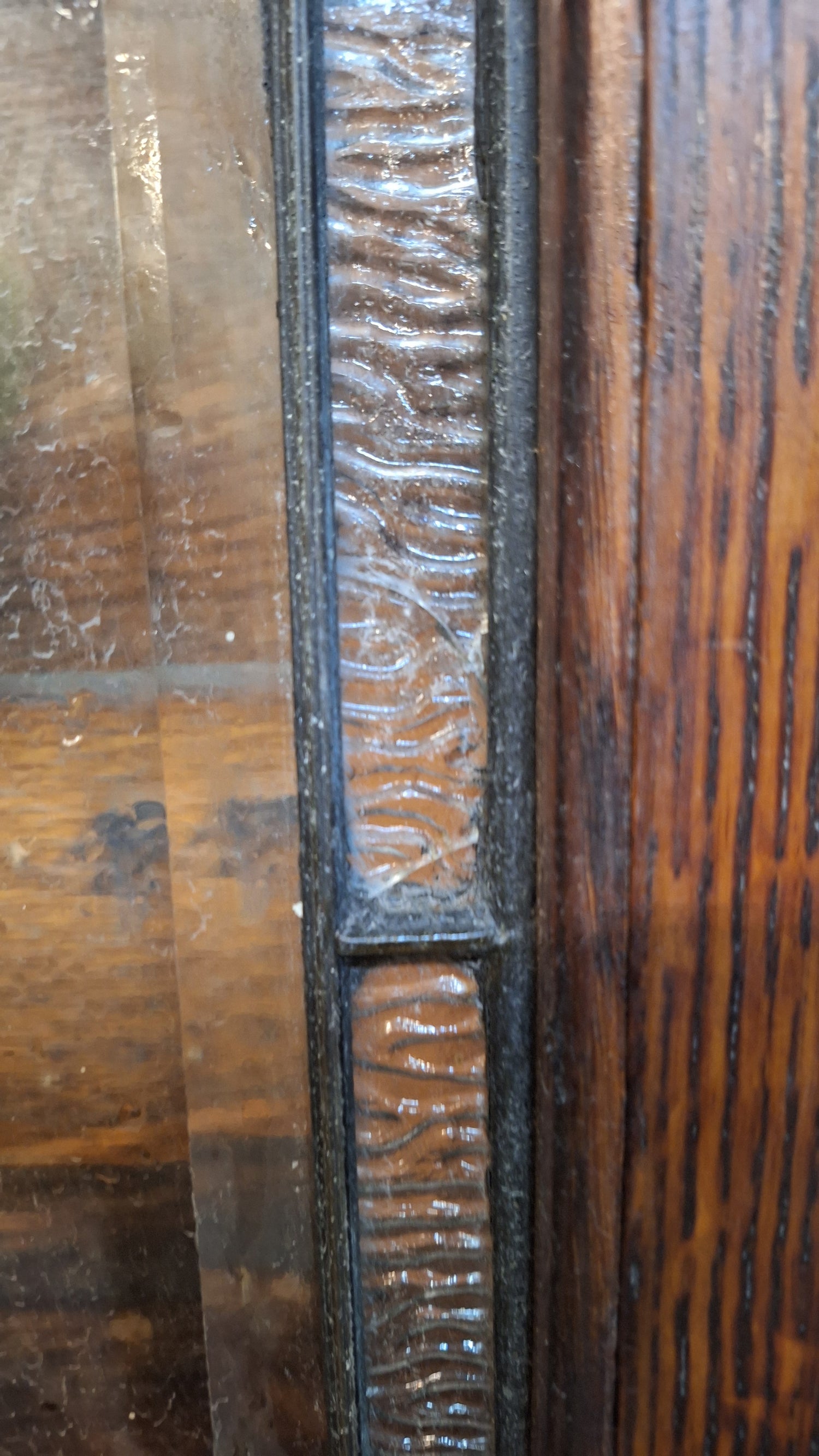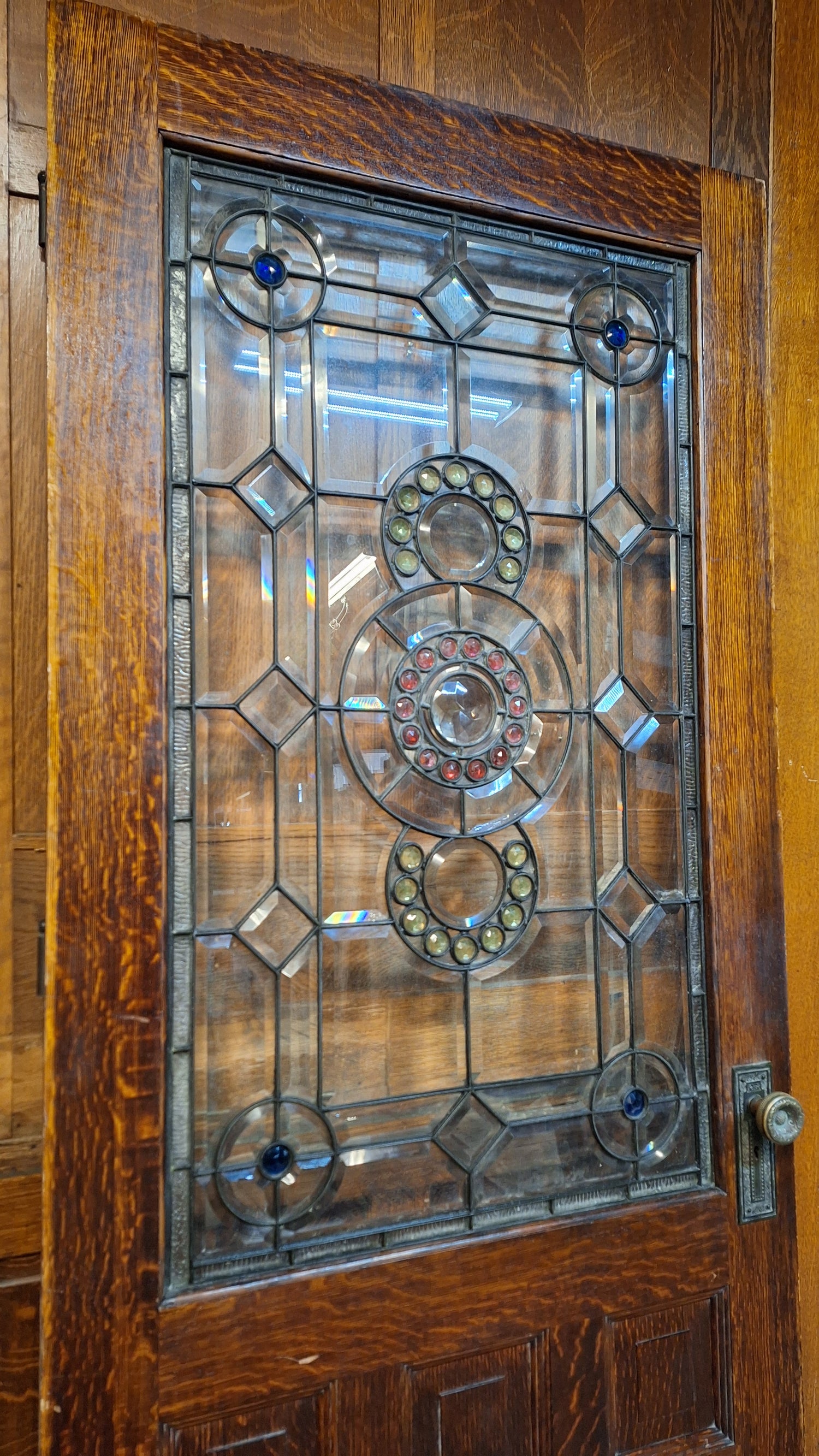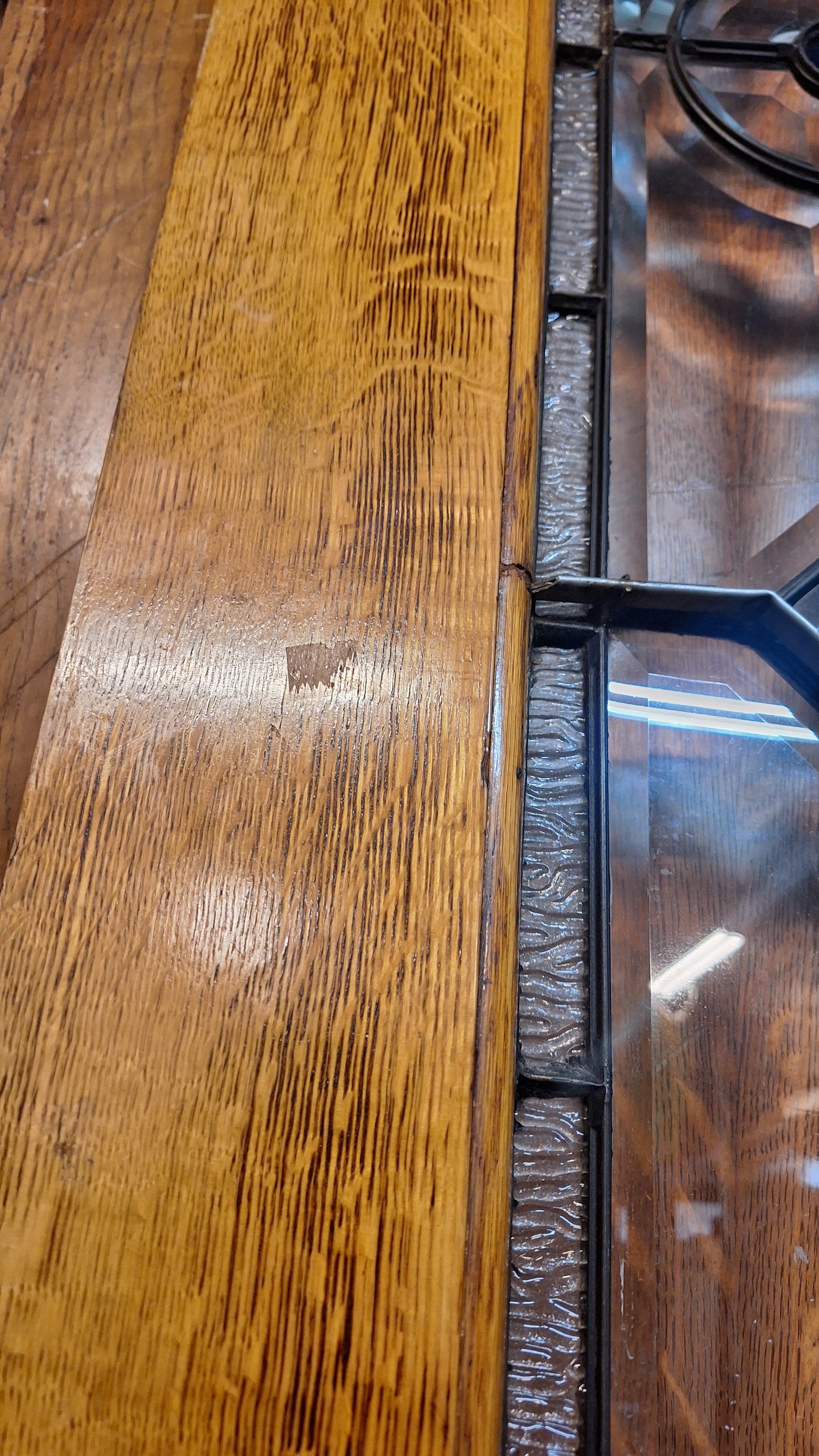 There are two support bars that run along the back (interior) side of the glass, one of which needs to be resoldered to the zinc caming of the window for support/keep glass from flexing when in use. The door has also been cut at a slight angle along the bottom, likely to accomodate for settling of a door frame.