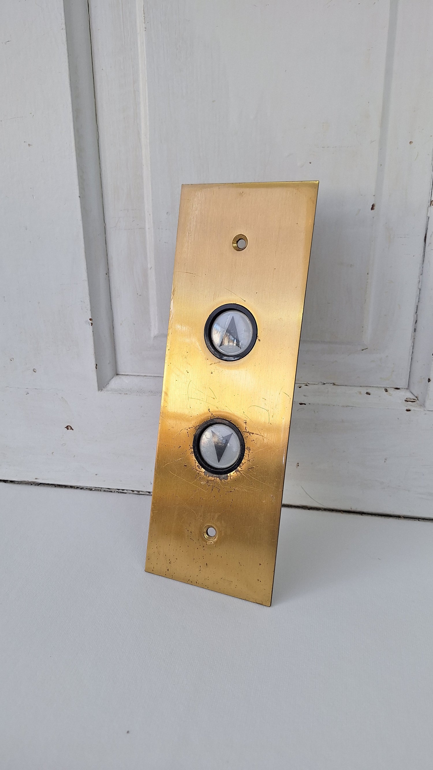 A vintage brass elevator button panel with Up and Down arrow buttons that are backlit when in use. We have several of these available; most will have some wear around the buttons as shown in the photos. These sets are in 'as found' condition and have not been cleaned or tested.