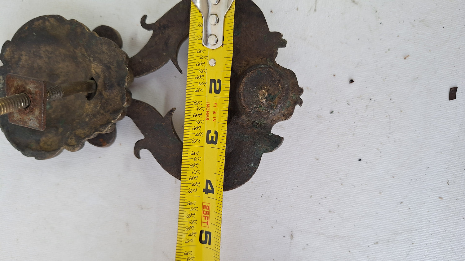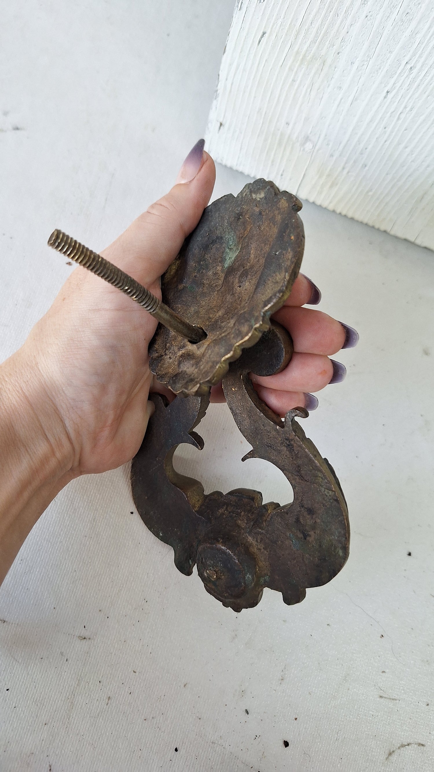 An antique, solid bronze door knocker with incredible details. The upper portion consists of a 'greenman' or North Wind face, the mouth of which, serves as the opening for the hanging knocker. This would be an amazing statement piece for a front door and is solid and well-made. The threaded rod is slightly bent as shown from many years of use. Please see all of our pictures for details and dimensions. This item ships free within the US. www.peoriasalvage.com