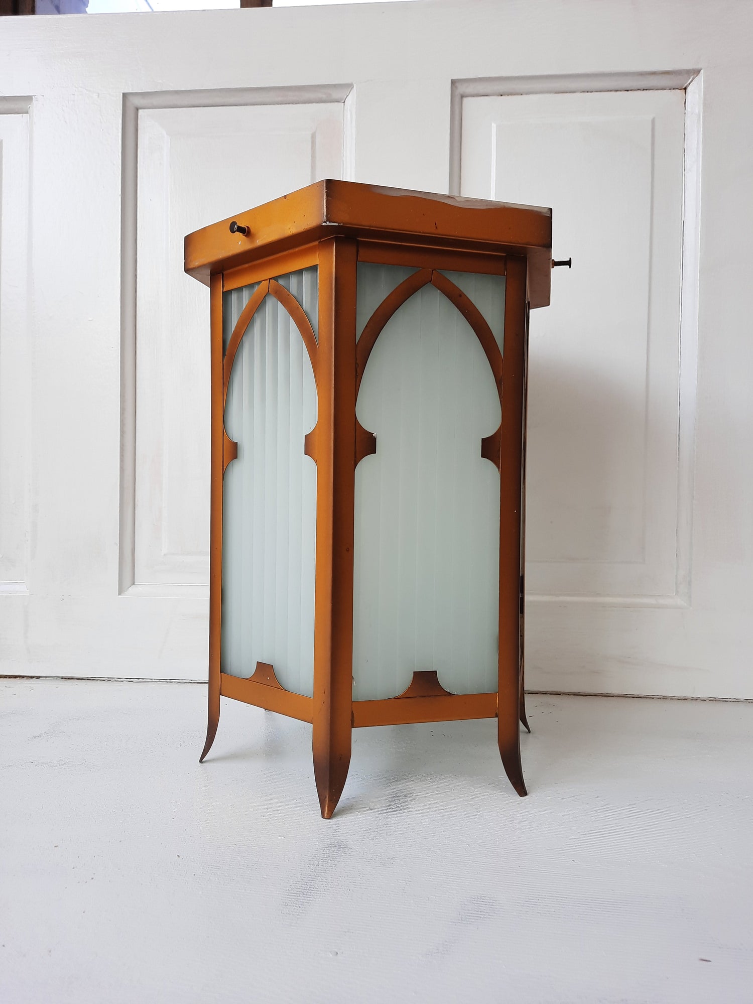 A beautiful Gothic style flush mount light from a Peoria, Illinois church. The metal (possibly aluminum) has an aged gold finish with frosted, ribbed glass panels and a pebbled glass panel on the bottom. It is a single bulb fixture and has been rewired with a new socket. Please see all of our pictures for details. The metal has a few spots of paint around the upper edge. All metal and glass is in good physical condition with no cracks or chips.